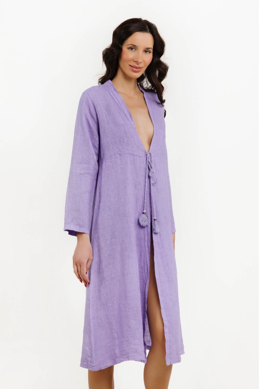 Lanena košulja haljina, midi dužine. Kopčanje sprijeda dugmadima. U struku pojas. V izreza i preklopna kragna. 3/4 dužina rukava sa dugmadima za kopčanje. Proizvod je univerzalne veličine. -..