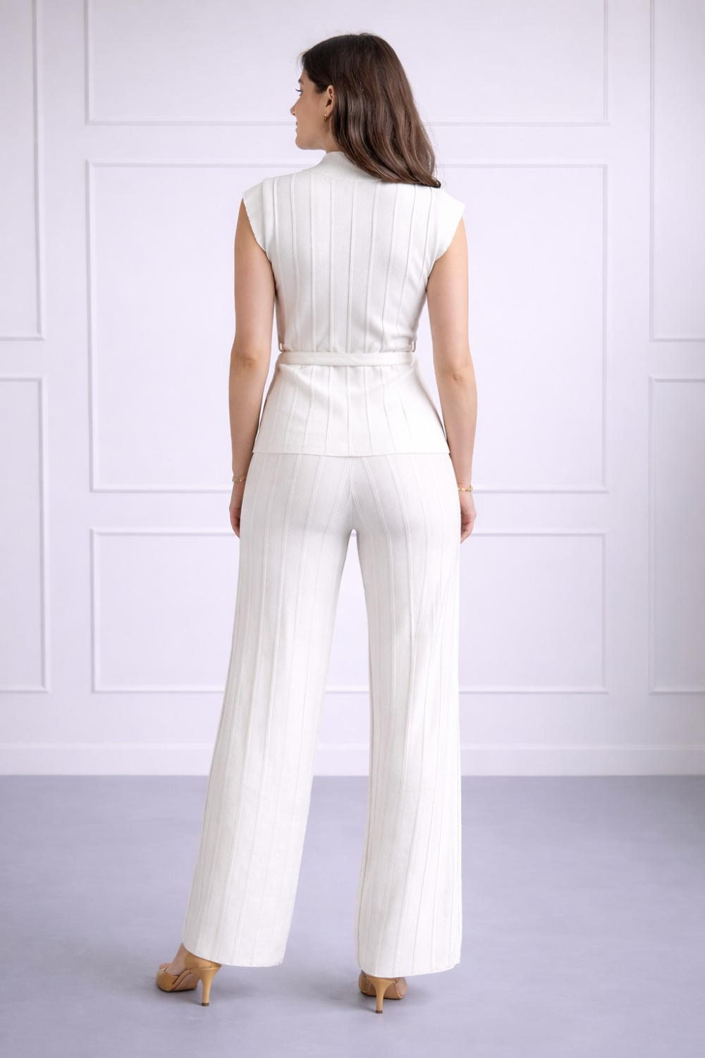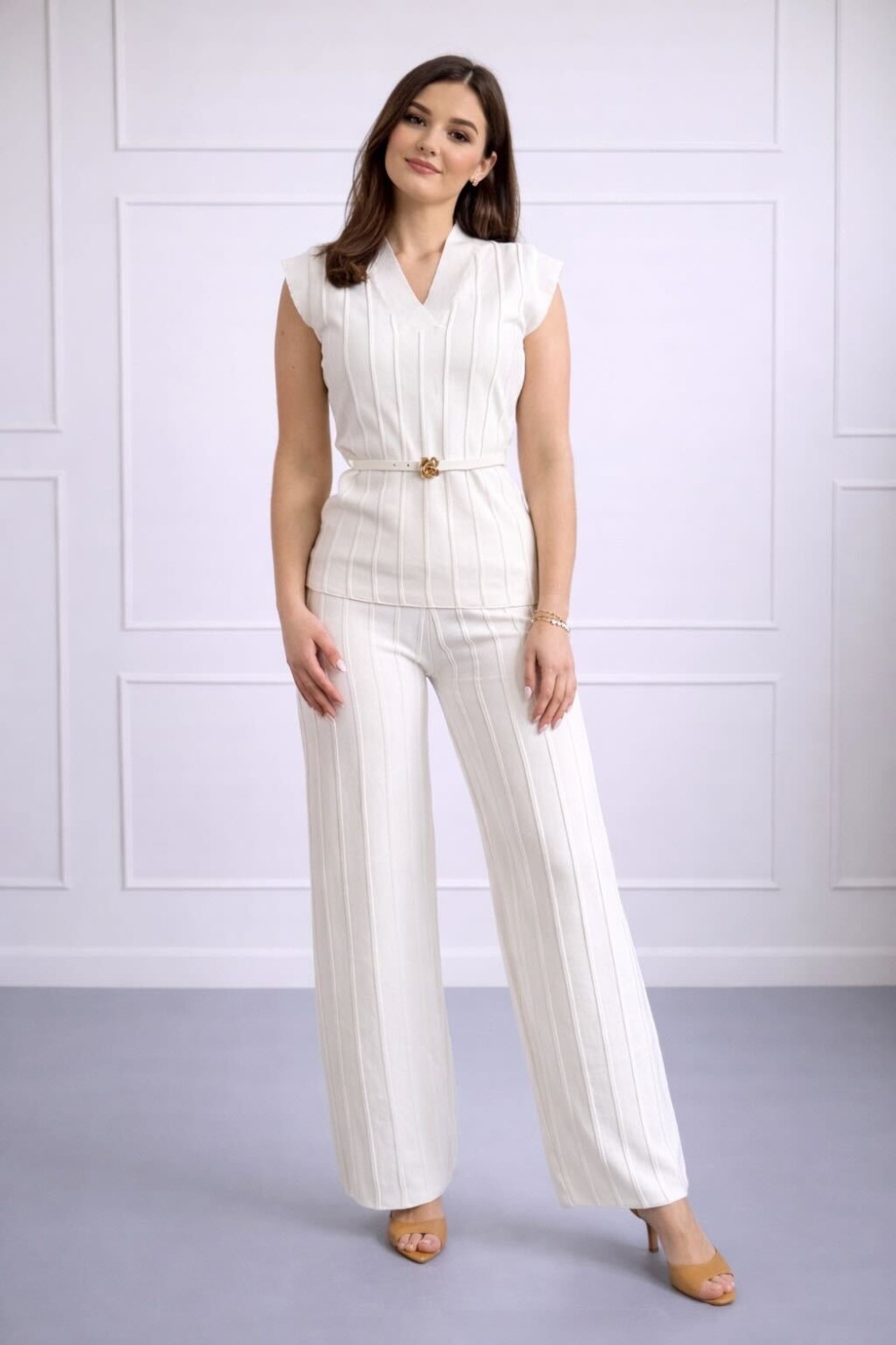 Ženski komplet u bijeloj boji koji spaja profinjeni izgled i udobnost. Gornji dio bez rukava s V-izrezom i vertikalnim rebrastim uzorkom vizualno izdužuje siluetu, dok diskretni remen s dekorativnim detaljem u obliku ruže dodatno naglašava struk. Hlače ravnog, blago lepršavog kroja prate liniju tijela i pružaju ugodan osjećaj tijekom nošenja.