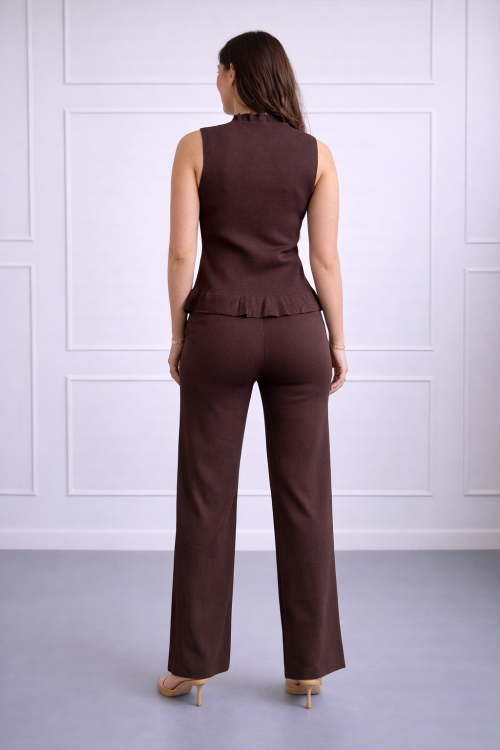 Pleteni ženski komplet u bogatoj smeđoj nijansi koji spaja ženstvene detalje i udobnost. Gornji dio bez rukava ističe se dekorativnim volanima i gumbima sprijeda, dok blago naglašeni struk i diskretni volan na donjem rubu daju profinjen i moderan izgled. Hlače ravnog kroja lijepo prate liniju tijela i pružaju udobnost tijekom cijelog dana.
