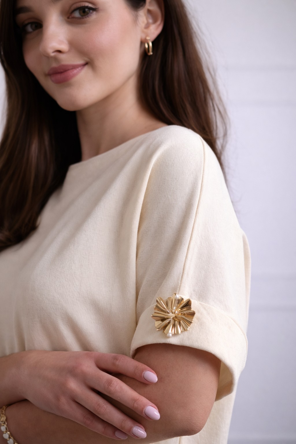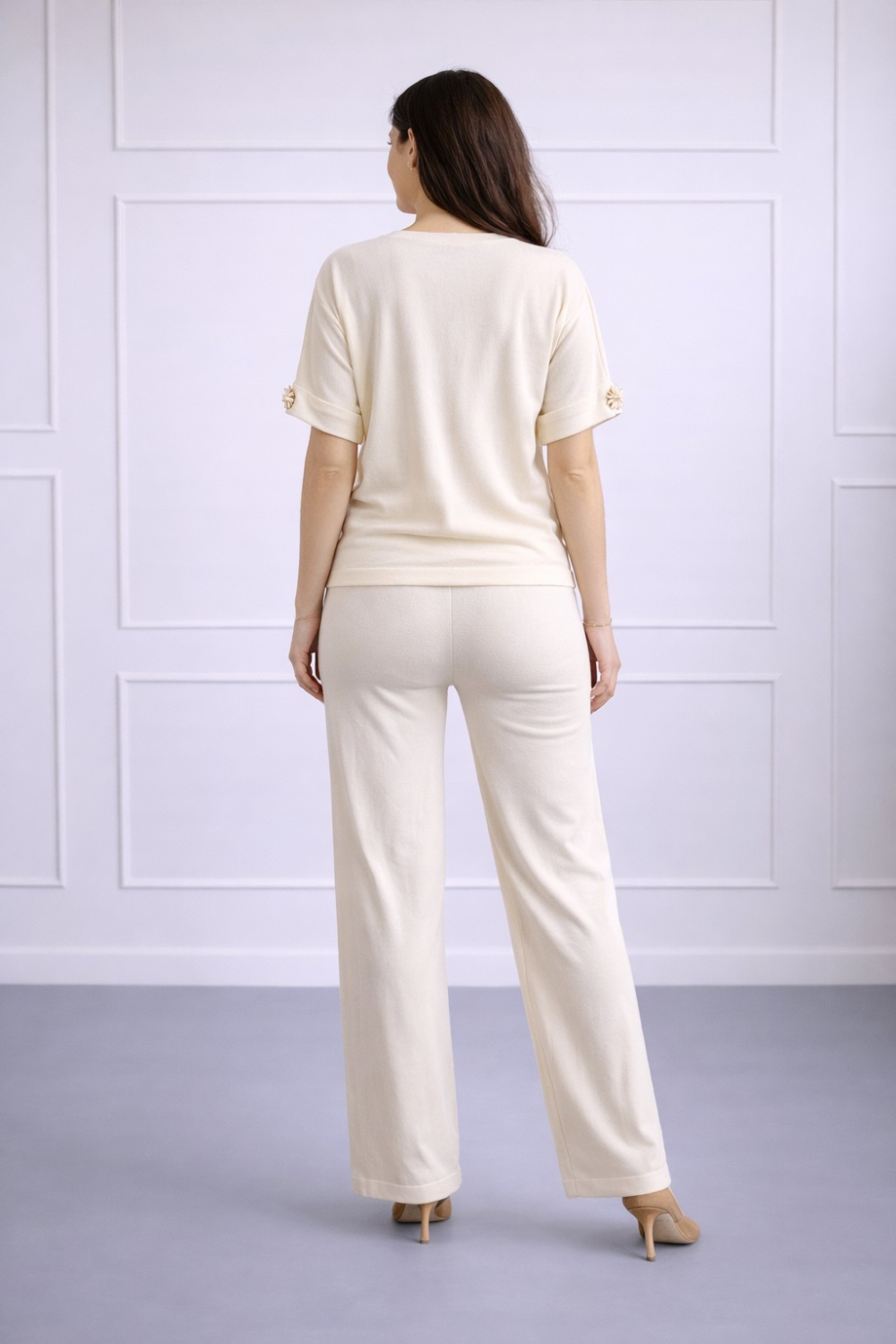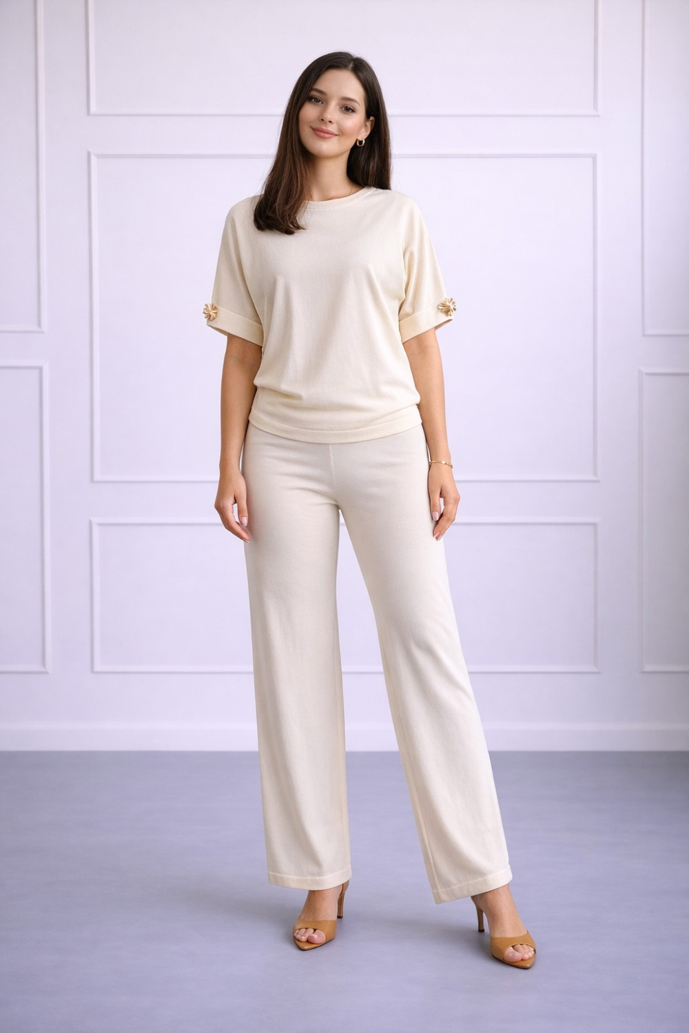 Elegantni bež komplet izrađen od laganog materijala s prirodnim izgledom. Gornji dio bez rukava s četvrtastim izrezom i dekorativnim zlatnim gumbima daje sofisticiran izgled, dok široke hlač..