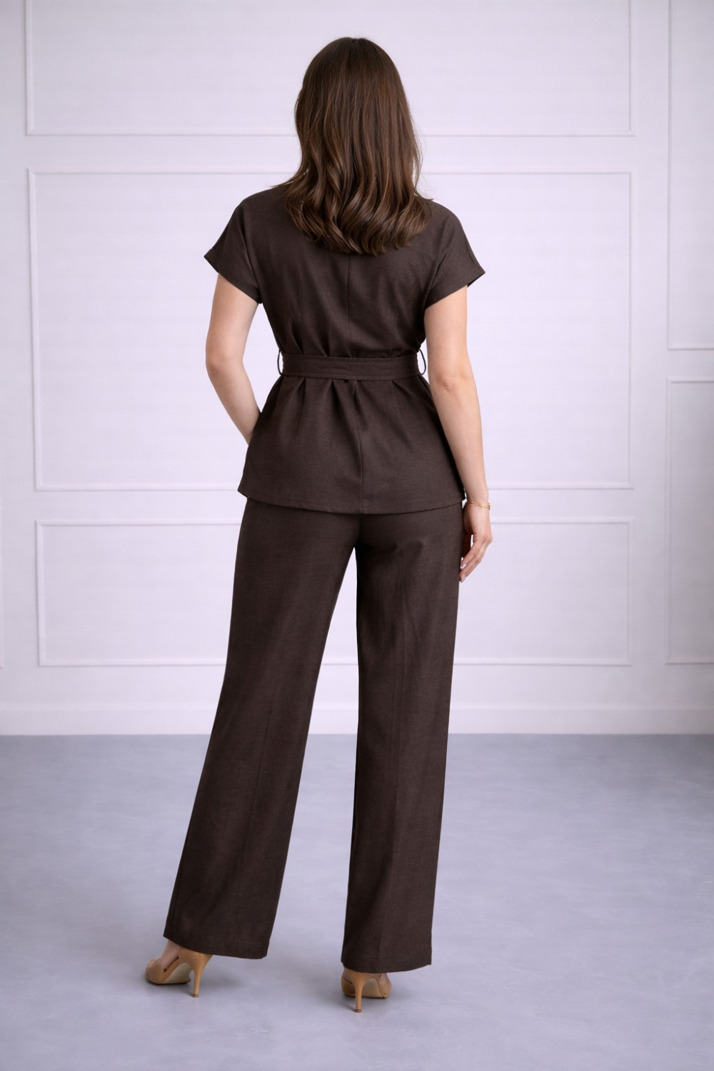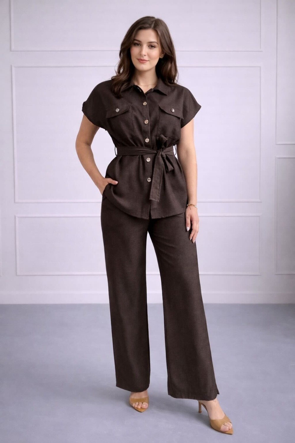 Elegantni bež komplet izrađen od laganog materijala s prirodnim izgledom. Gornji dio bez rukava s četvrtastim izrezom i dekorativnim zlatnim gumbima daje sofisticiran izgled, dok široke hlač..