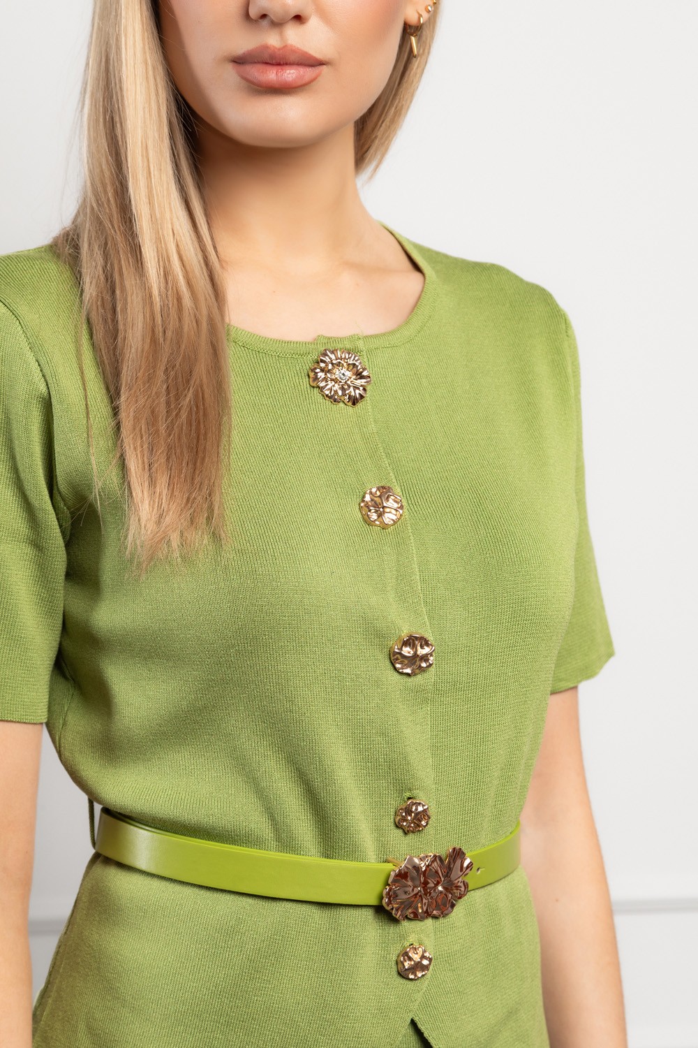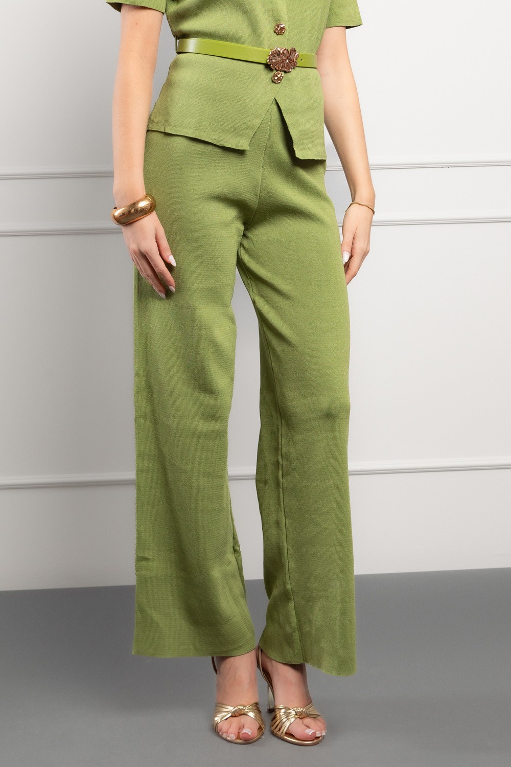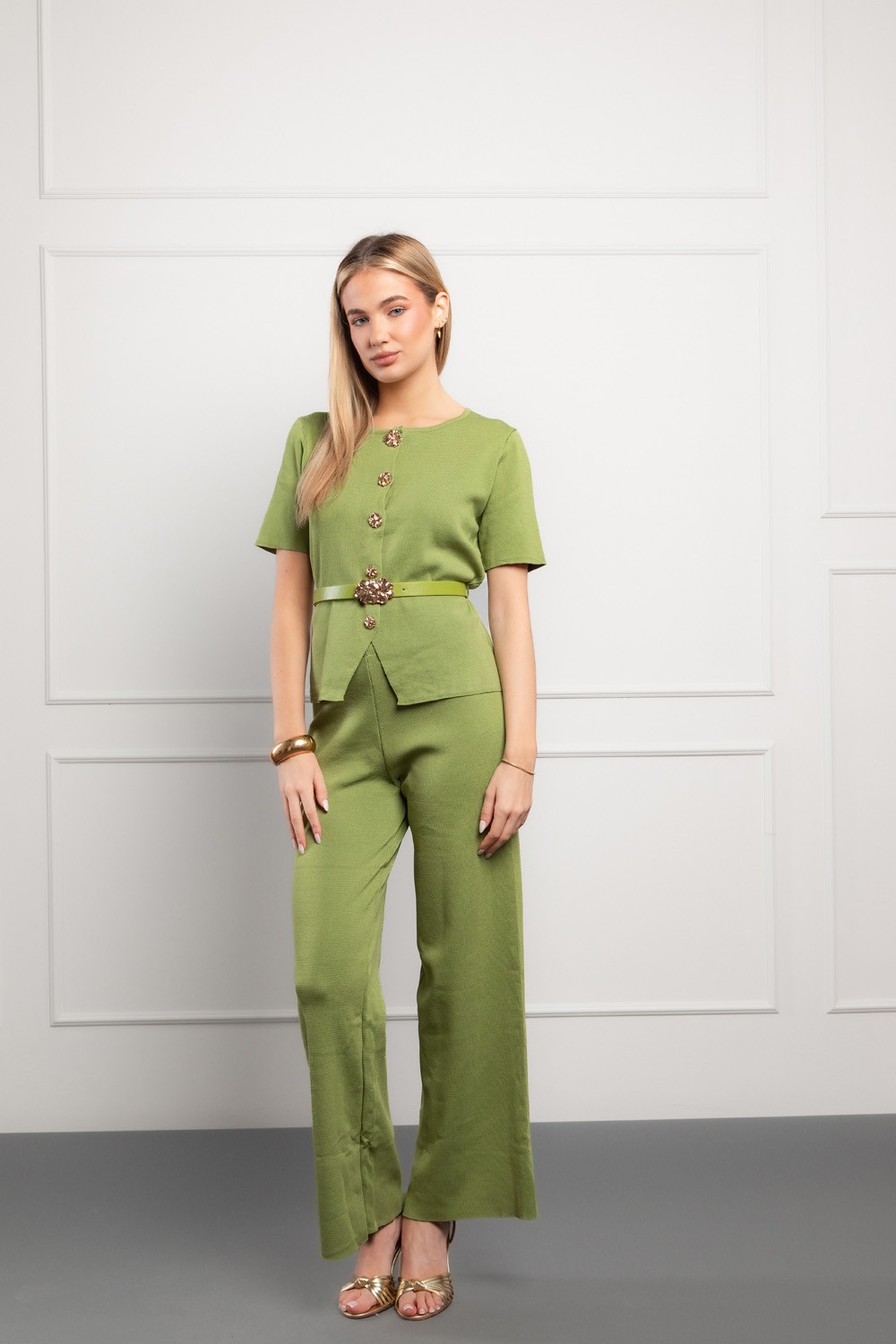 Moderan ženski komplet u svježoj zelenoj nijansi savršen je spoj udobnosti i profinjenog izgleda. Sastoji se od elegantnog pletenog prsluka kratkih rukava i hlača ravnog kroja izrađenih od mekanog i ugodnog pletiva koje se nježno prilagođava tijelu. Zlatni ukrasni gumbi na majici daju dozu luksuza i ženstvenosti, dok elastičan materijal osigurava potpunu slobodu kretanja.