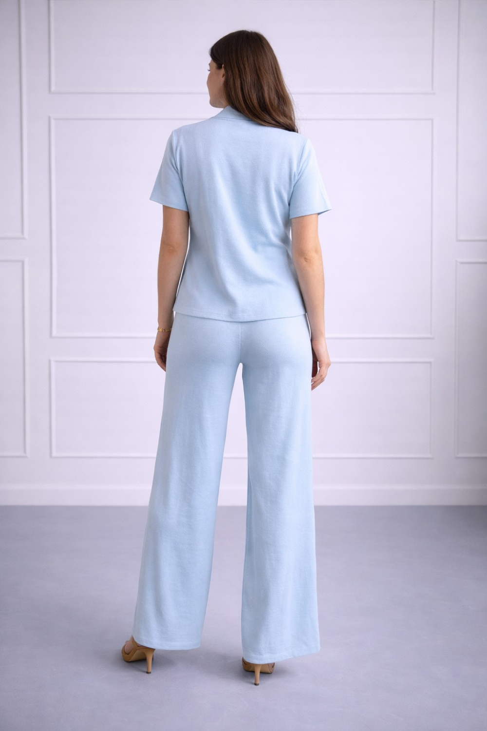 Ženski pleteni komplet u svijetloplavoj nijansi. Gornji dio bez rukava ističe se dekorativnim zlatnim dodacima u obliku školjke i čistim linijama koje lijepo prate liniju tijela, dok lepršav..