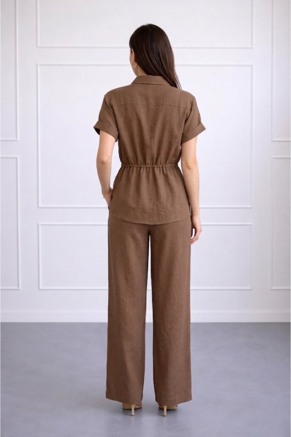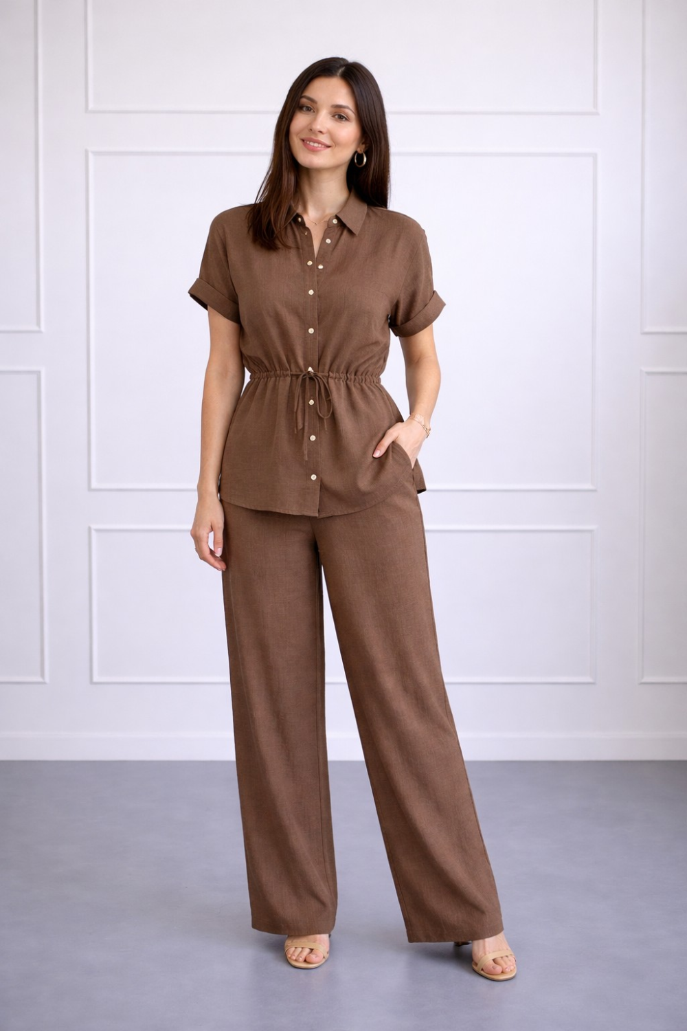 Elegantni ženski komplet u toploj smeđoj nijansi koji spaja jednostavan kroj i efektne detalje. Gornji dio kratkih rukava krase dekorativni zlatni gumbi i pojas koji naglašava struk, dok rav..