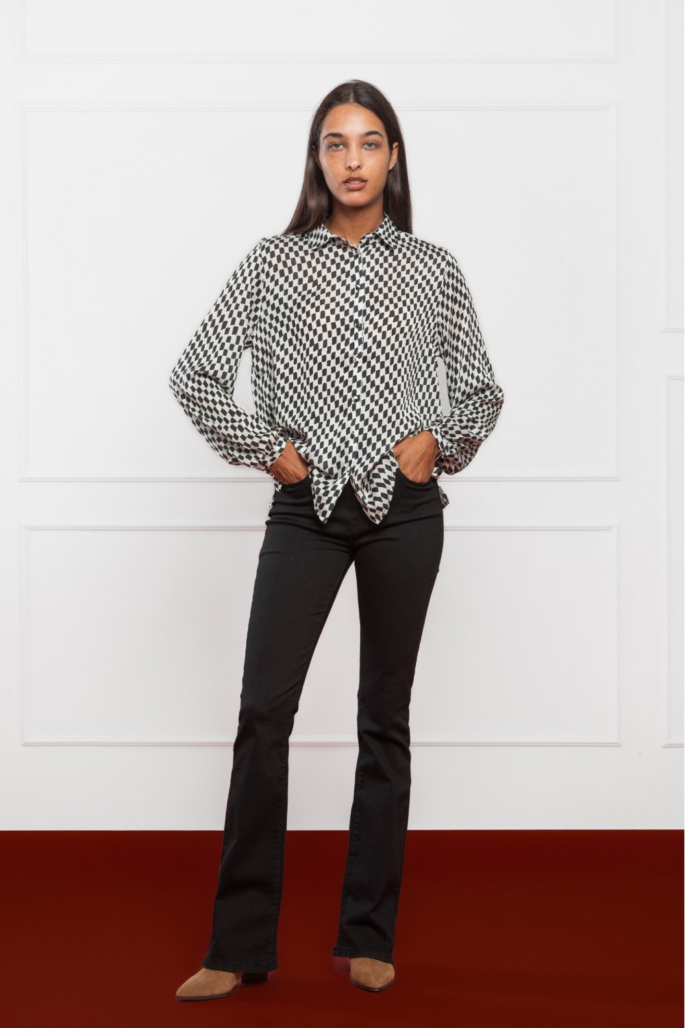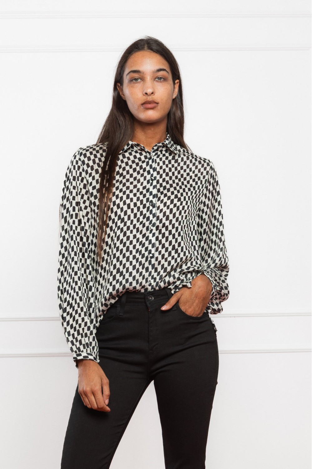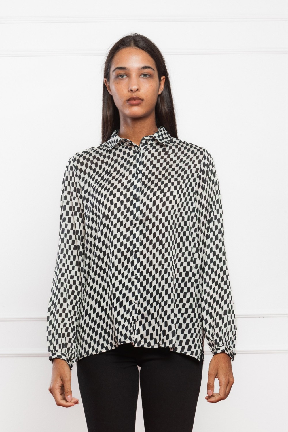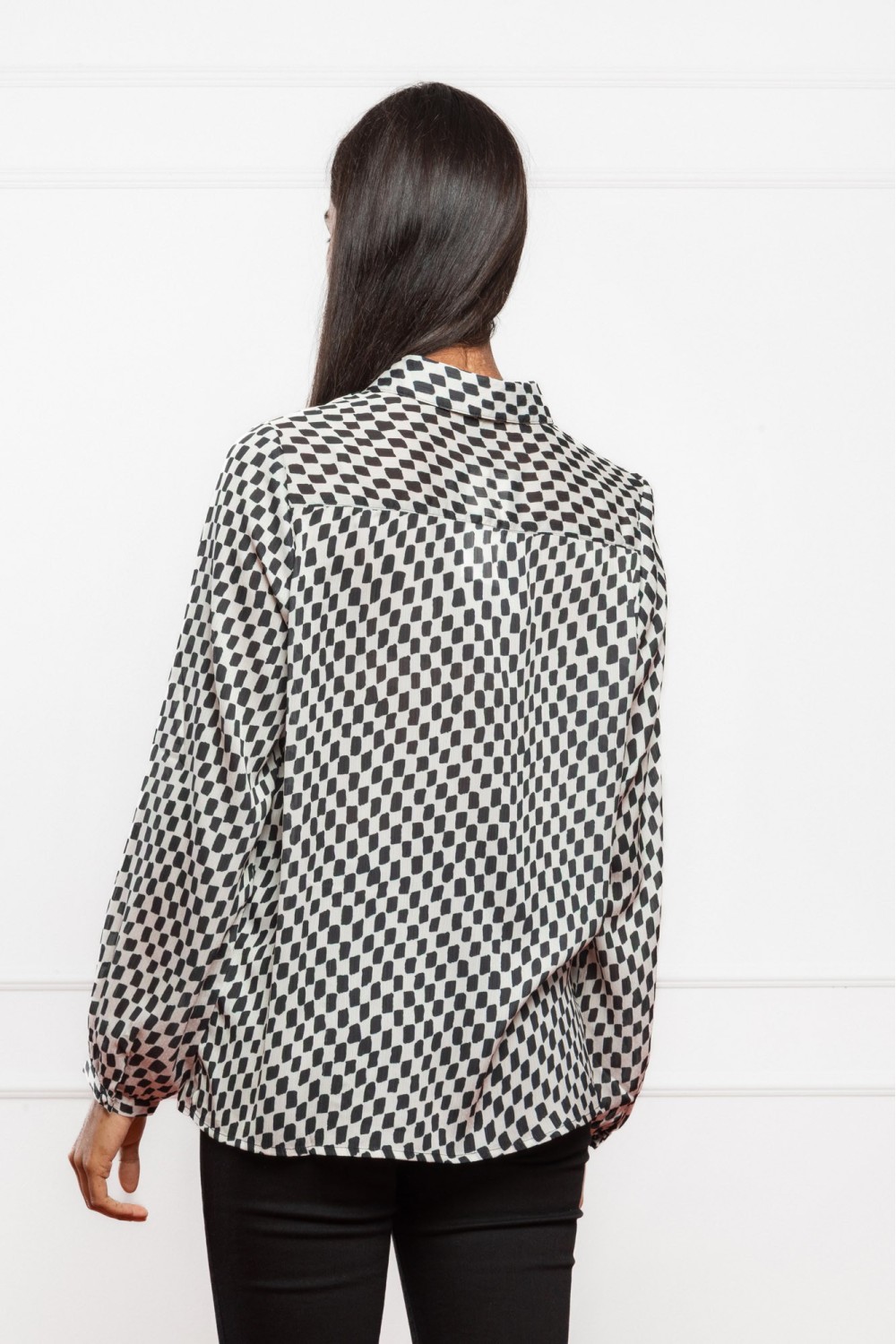 Stilski upečatljiva ženska košulja dugih rukava s modernim uzorkom u crno-bijeloj kombinaciji. Lagani i prozračni materijal osigurava udobnost tijekom cijelog dana, dok klasičan kroj s gumbima i ovratnikom omogućava lako kombiniranje za poslovne, casual ili večernje prilike. Savršena za nošenje uz traperice, elegantne hlače ili suknju.