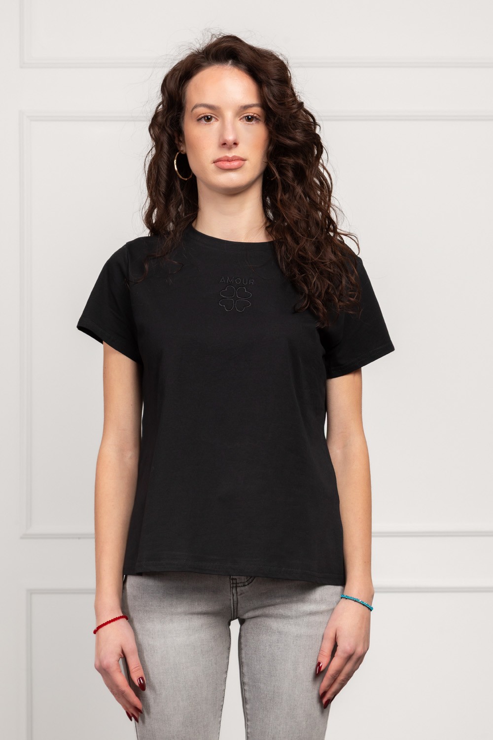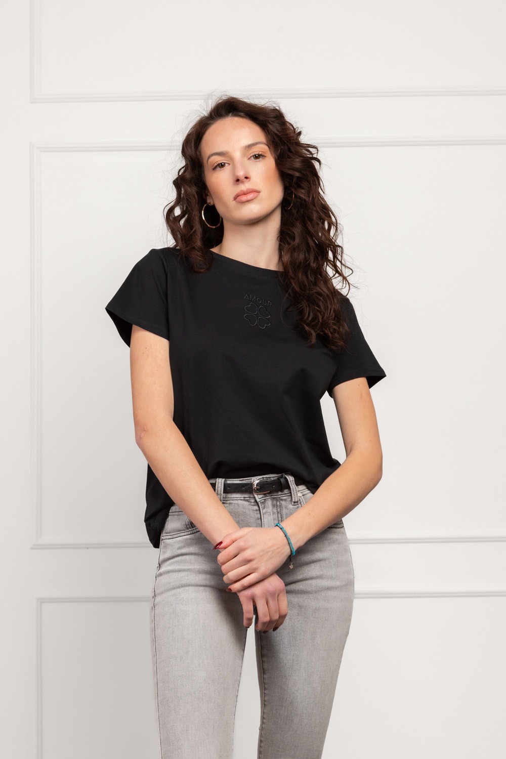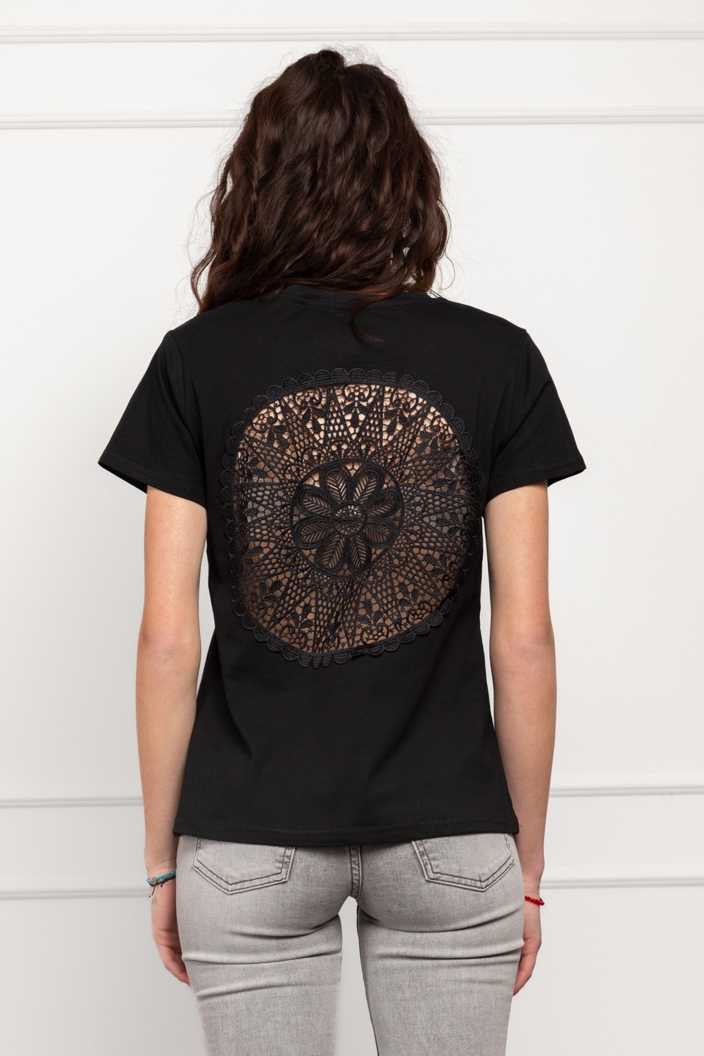 Crna majica kratkih rukava s minimalističkim prednjim vezom i sitnim motivom djeteline u obliku srca. Na stražnjoj strani krije se pravi wow detalj - velika okrugla čipkasta aplikacija inspirirana vintage heklanim motivima koja daje komadu poseban, ženstven i pomalo boho karakter. Ovaj kontrast jednostavne prednje i raskošne stražnje strane čini majicu zanimljivom, nosivom i idealnom za kombinacije od jutra do večeri.