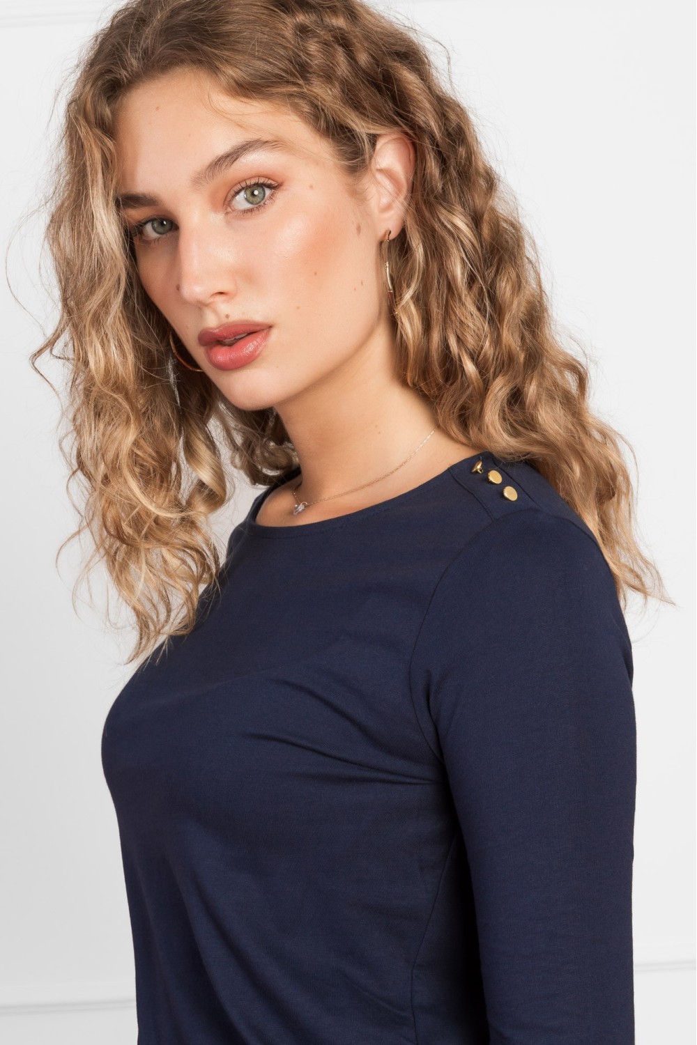 Majica na pruge sa detaljem kopčanja s gumbima na ramenom šavu. 3/4 dužine rukava, lađa izreza i ravnoga kroja.-65% PAMUK, 35% ELASTINModel je visok 170 cm i nosi veličinu S/V36..