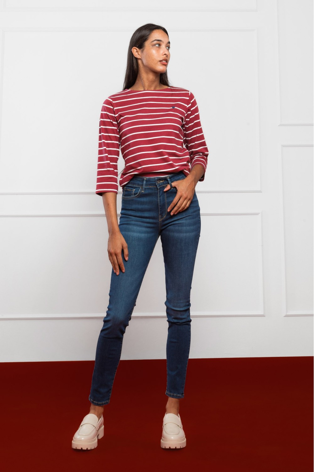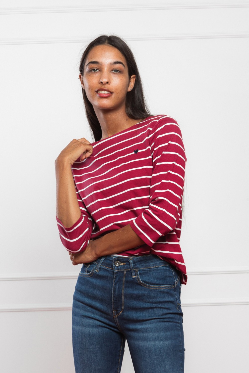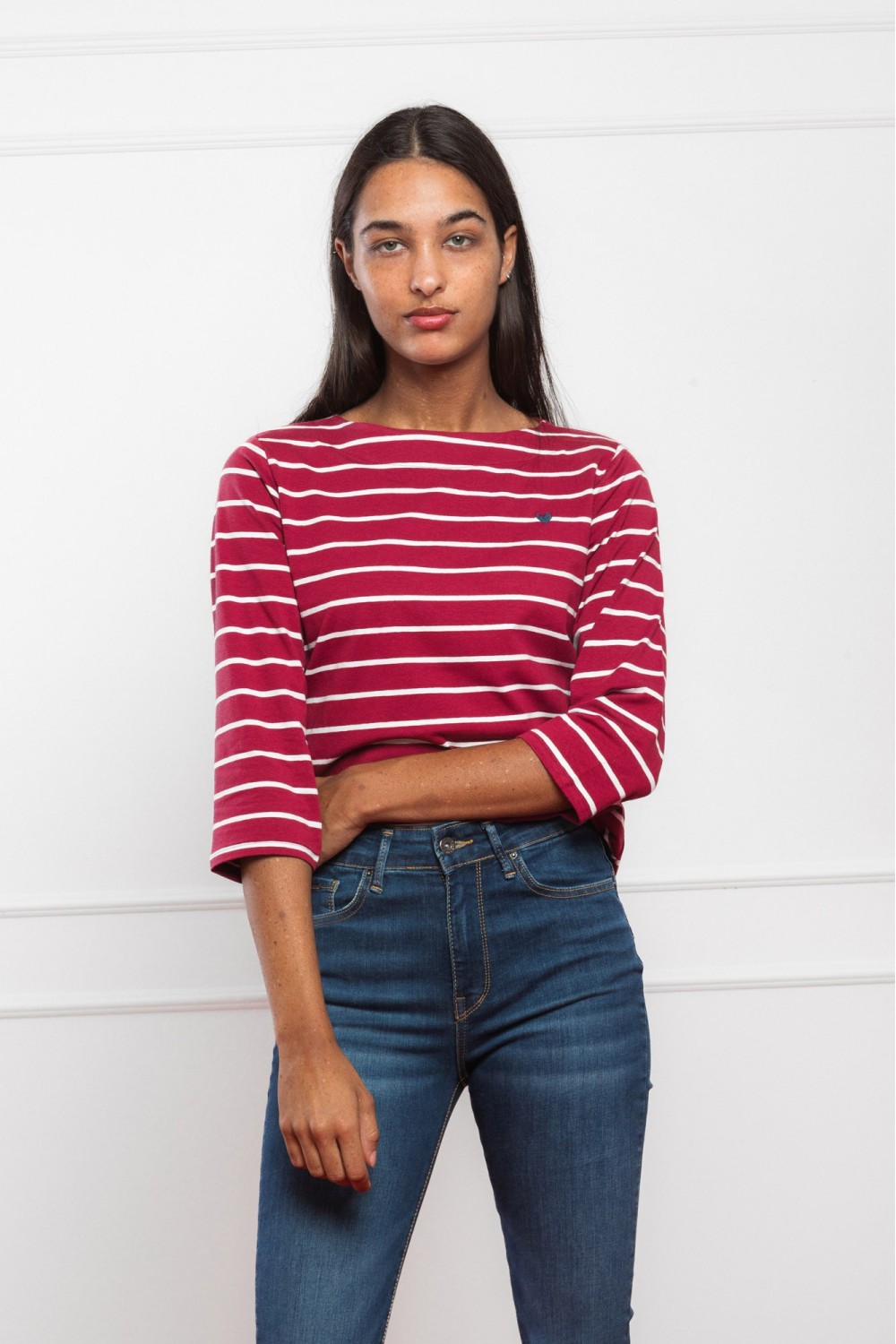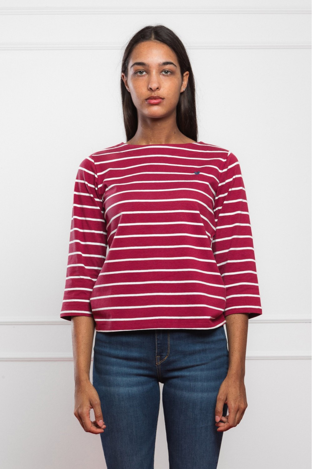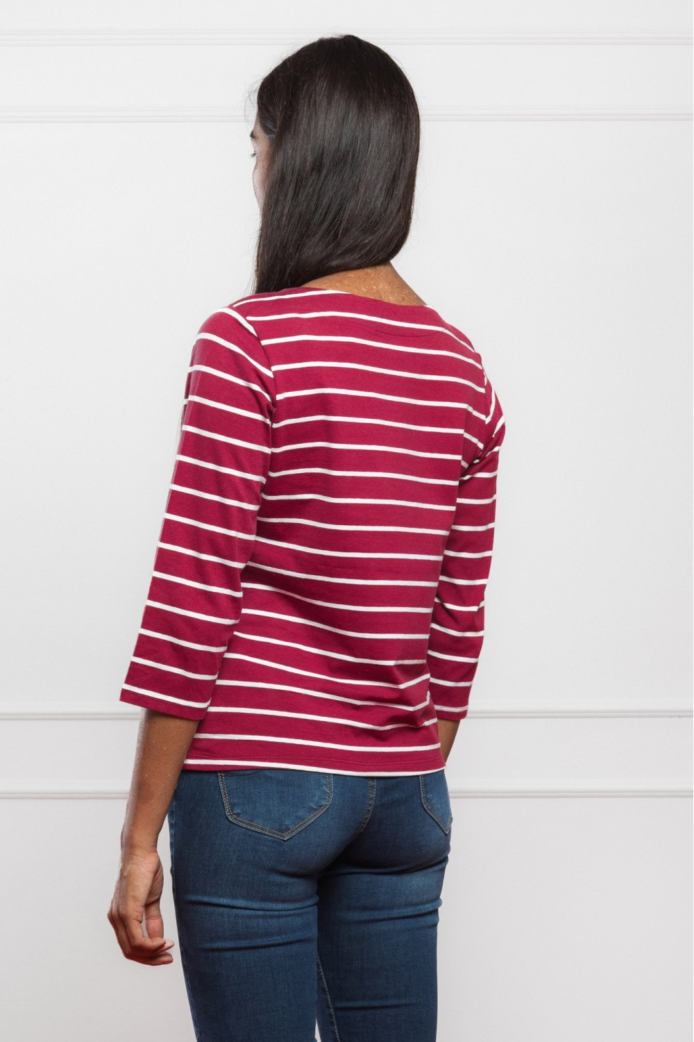 Majica na pruge sa detaljem kopčanja s gumbima na ramenom šavu. 3/4 dužine rukava, lađa izreza i ravnoga kroja.-65% PAMUK, 35% ELASTINModel je visok 170 cm i nosi veličinu S/V36..