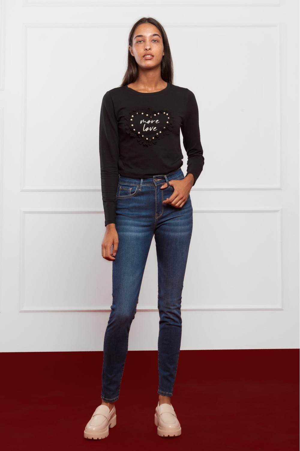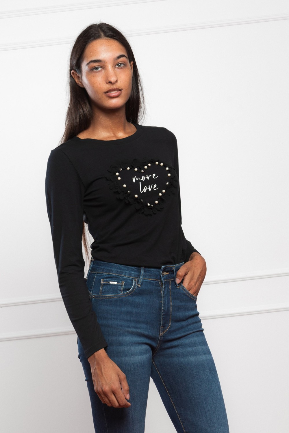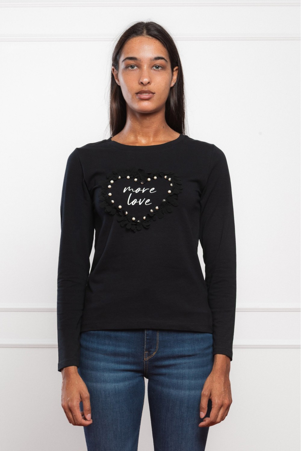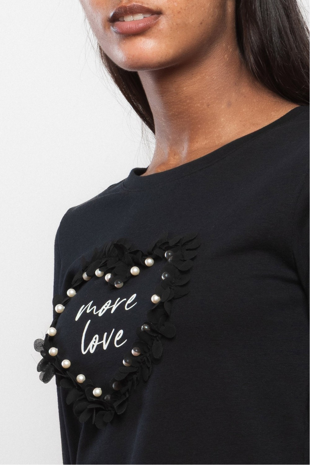 Crna majica dugih rukava s romantičnim detaljem – srce ukrašeno 3D aplikacijom i biserima koje daju poseban, ženstven touch. Natpis unosi dašak pozitivne energije i čini ovaj komad savršenim za casual outfite s trapericama ili ležerne kombinacije za svaki dan. Udobna i rastezljiva, idealna je za nošenje tijekom cijelog dana.