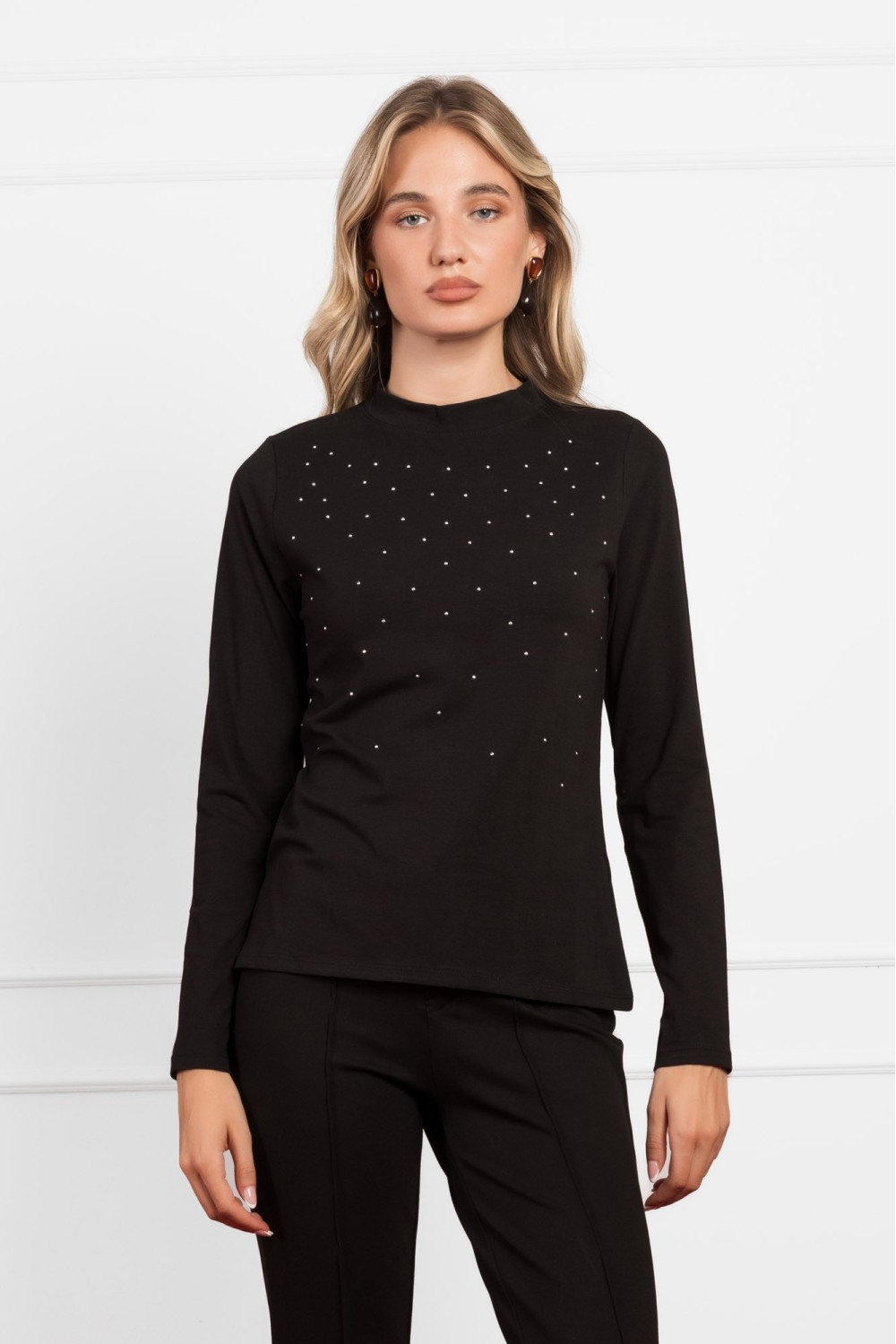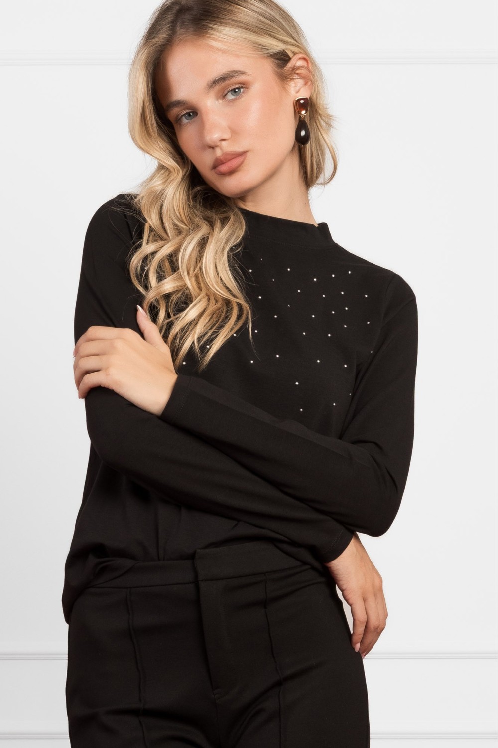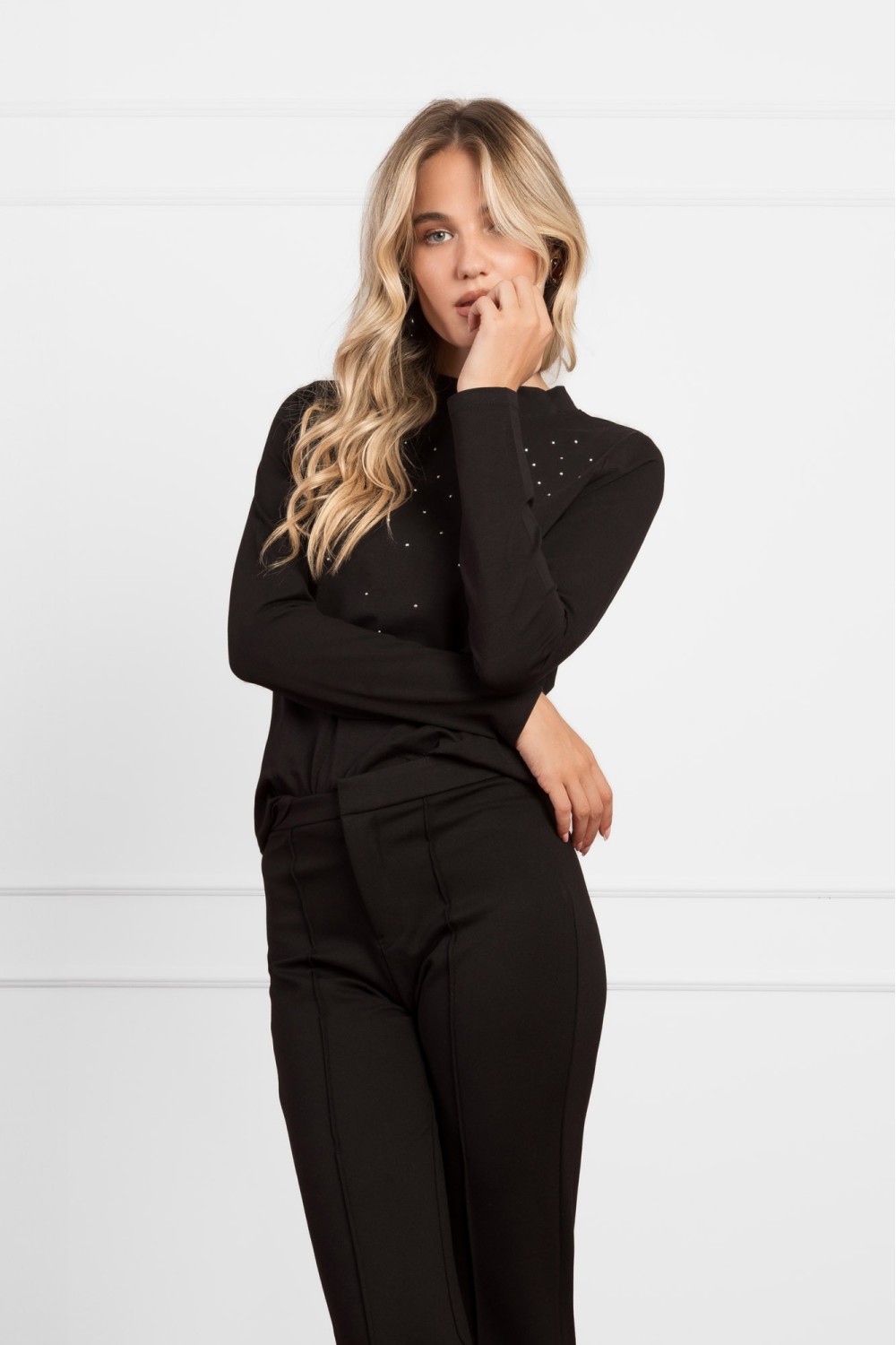 Elegantna majica dugog rukava, okruglog izreza s detaljima cirkona na vratnom otvoru. -95% VISKOZA, 5% ELASTINModel je visok 170 cm i nosi veličinu S/V36...