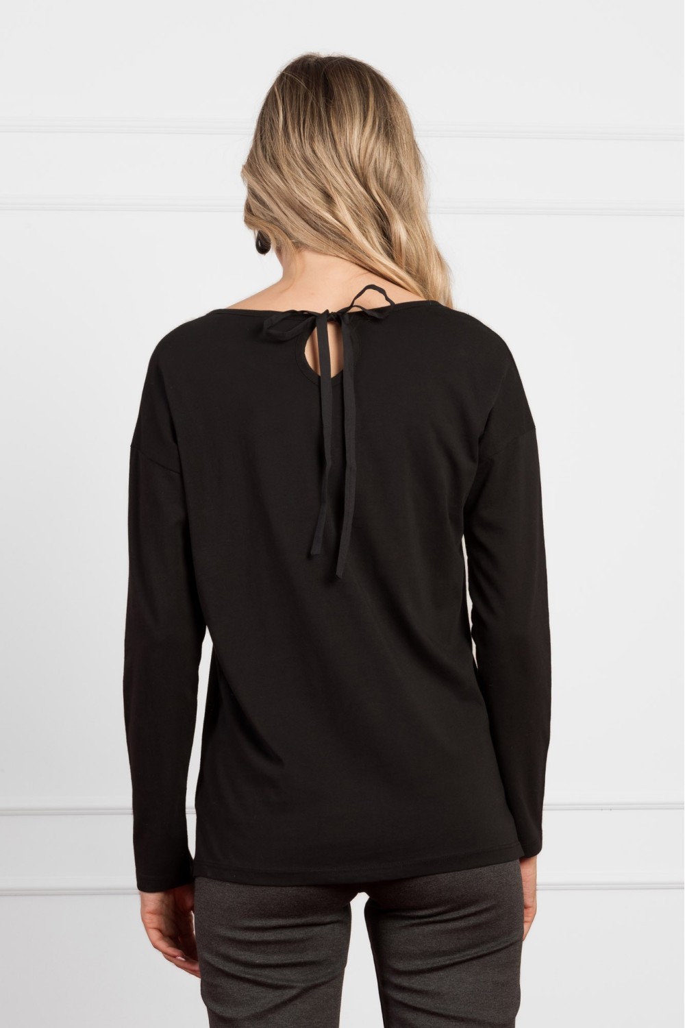 Crna majica dugih rukava izrađena od mekane viskoze s dodatkom elastina pruža udobnost i savršeno pristajanje. Posebno je ukrašena suptilnim sitnim cirkonima uz izrez, koji dodaju dašak eleg..