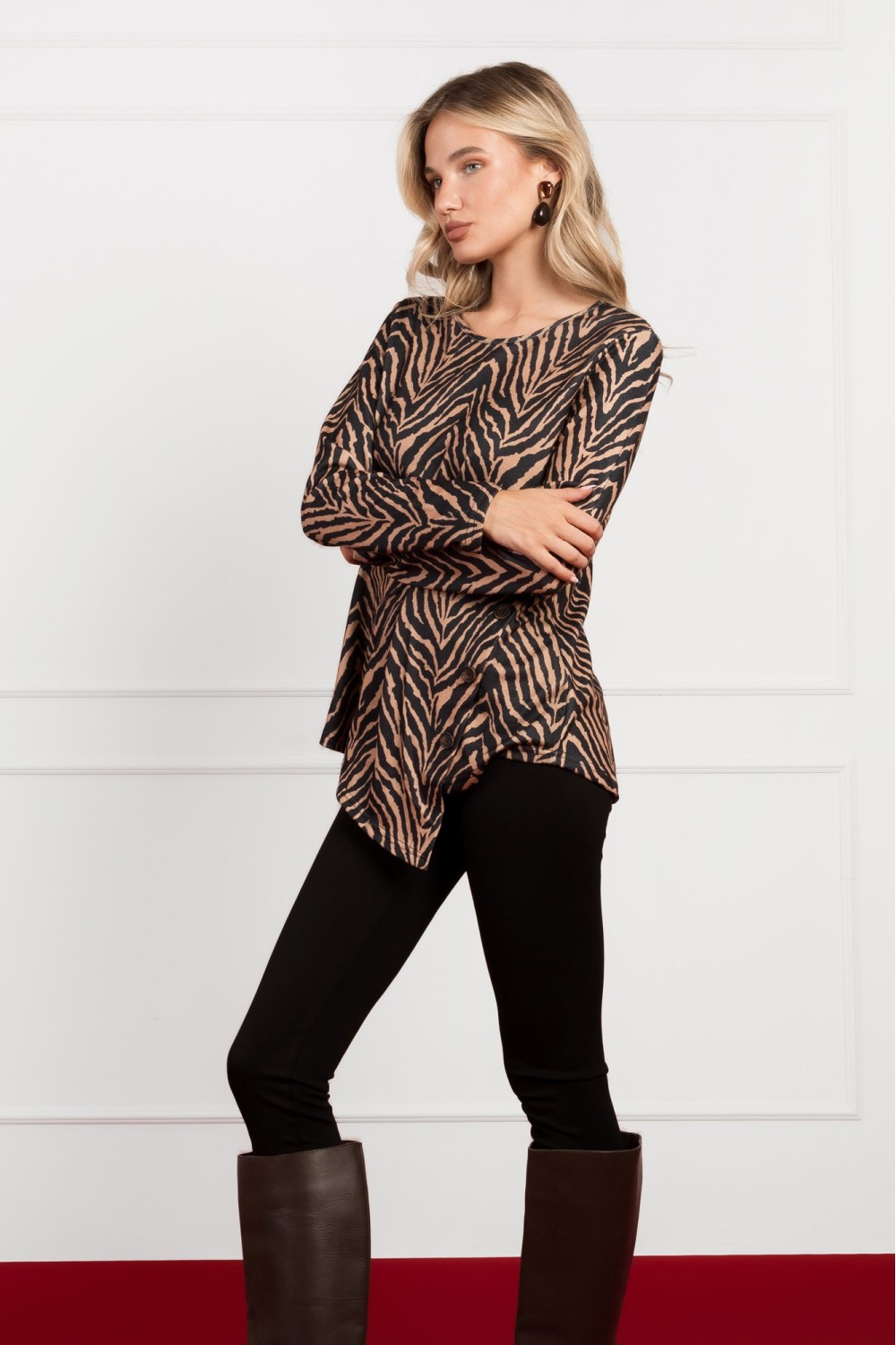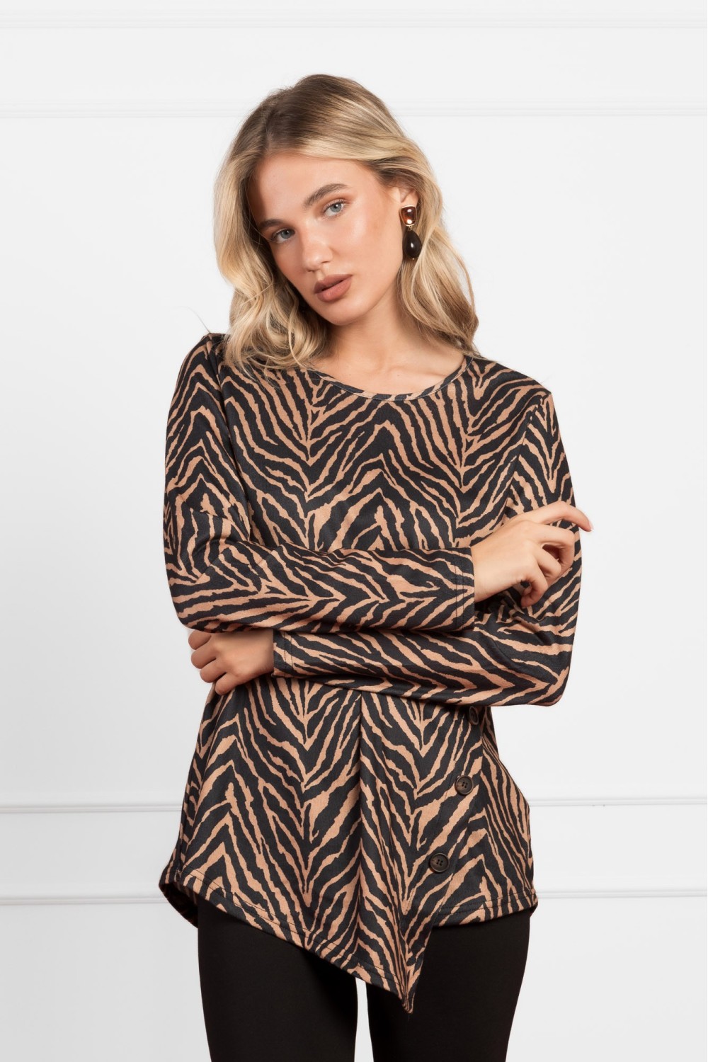 Crna ženska majica dugih rukava s upečatljivim geometrijskim uzorkom u bijeloj boji na prednjem dijelu. Elastična viskoza čini majicu udobnom za cjelodnevno nošenje. Model je visok 175 cm i ..