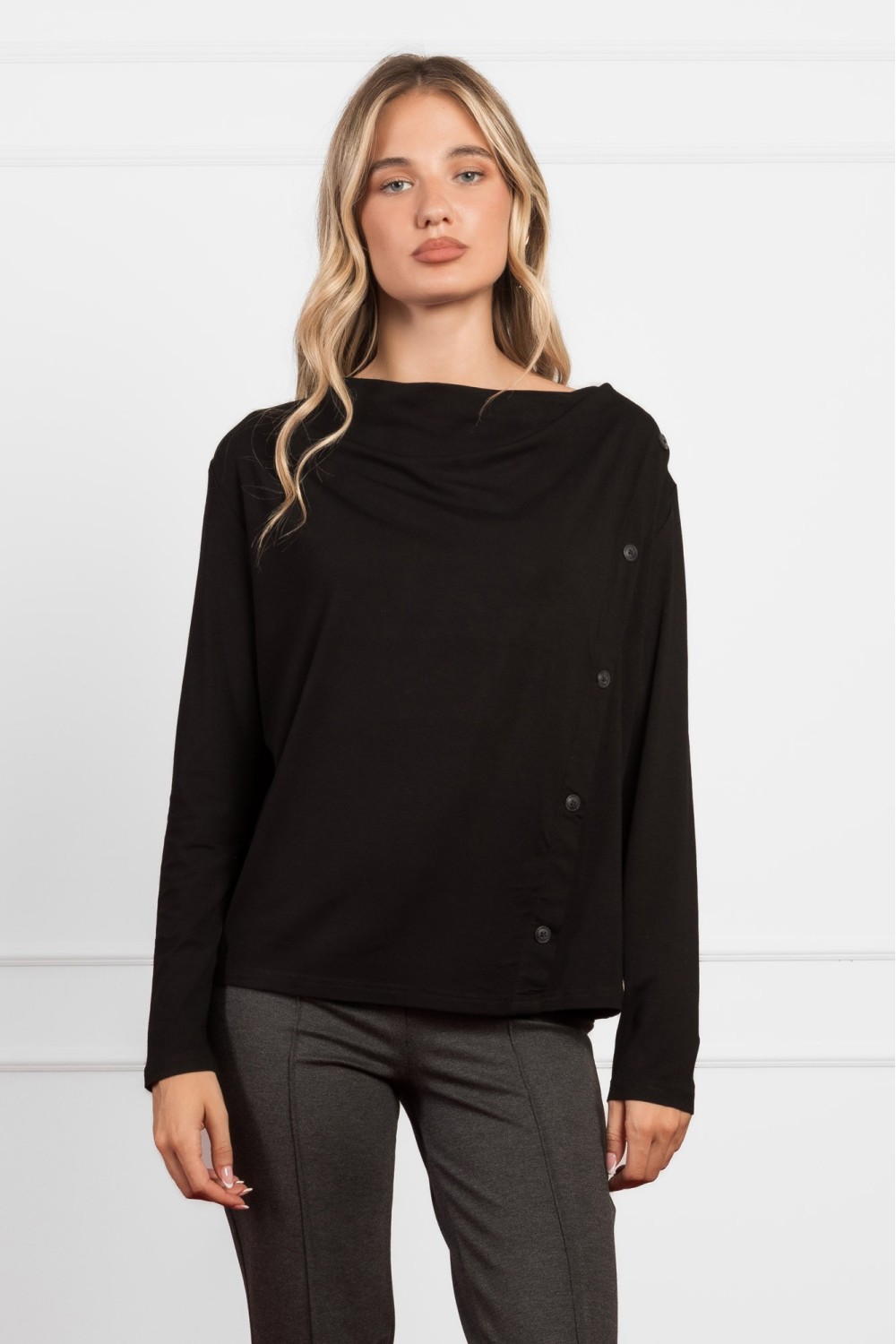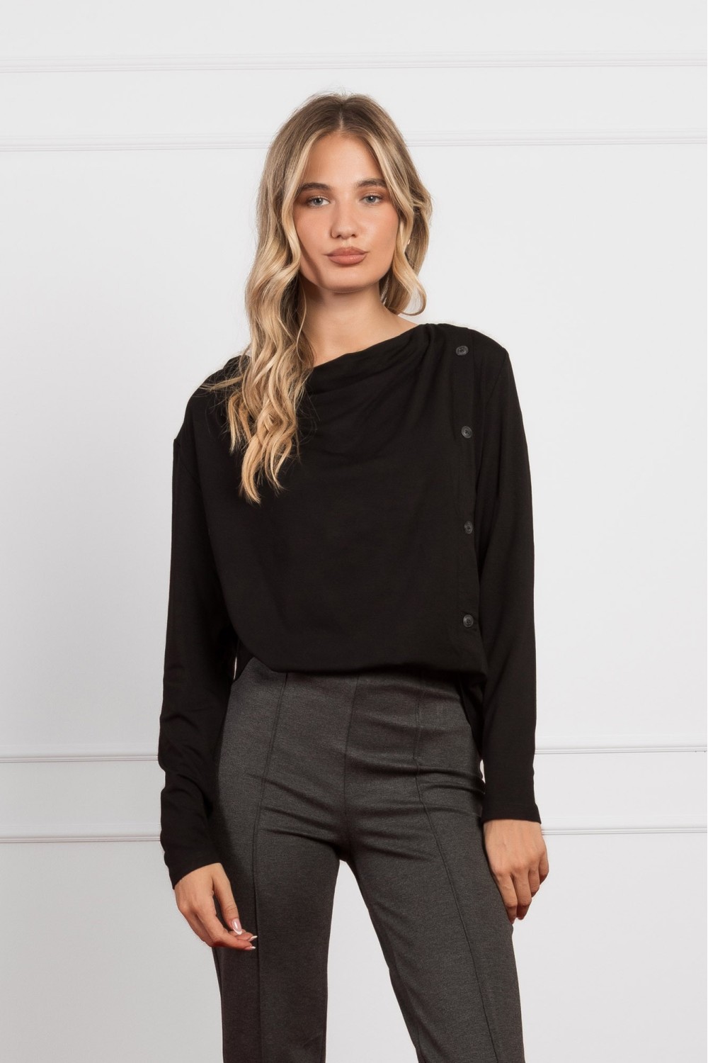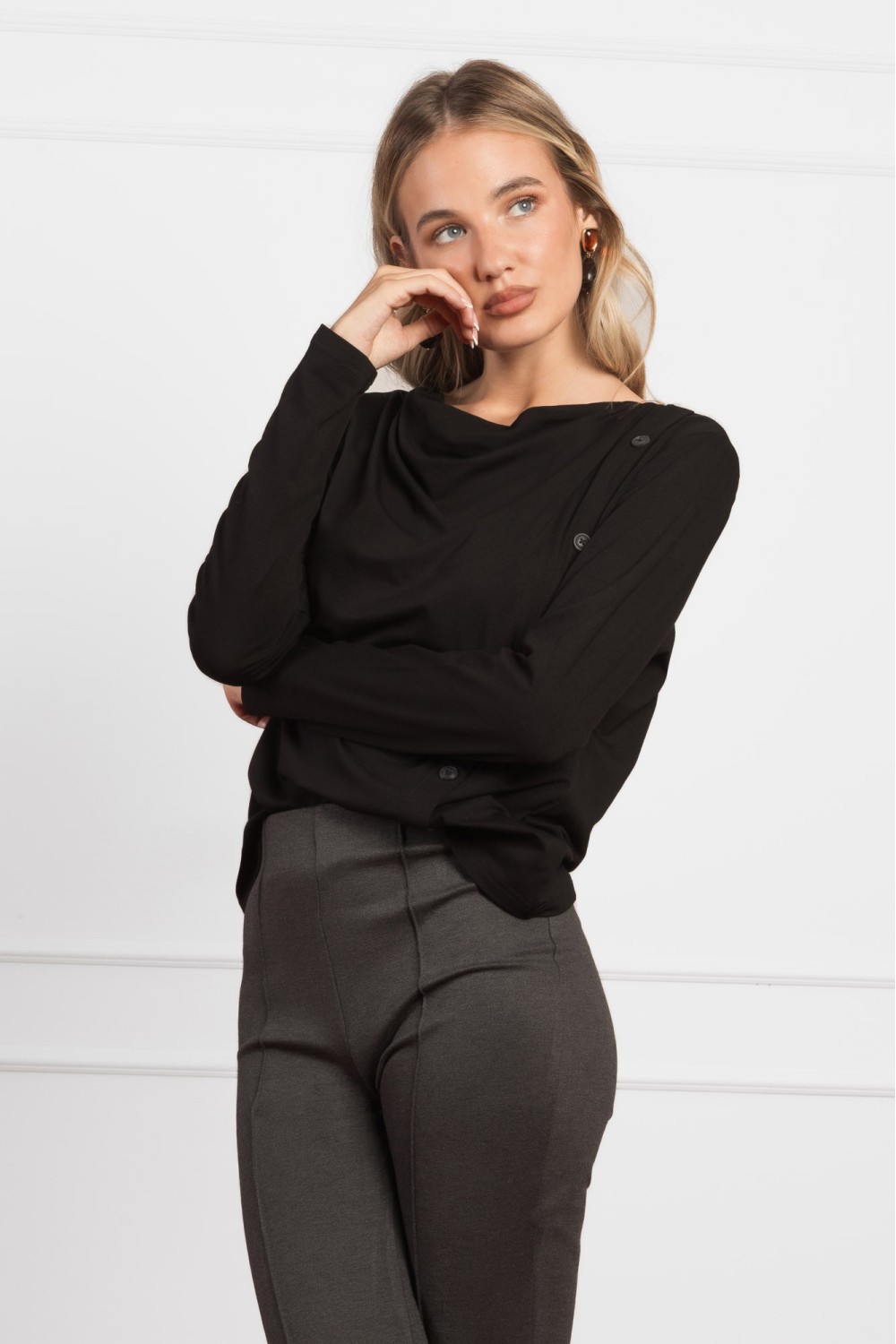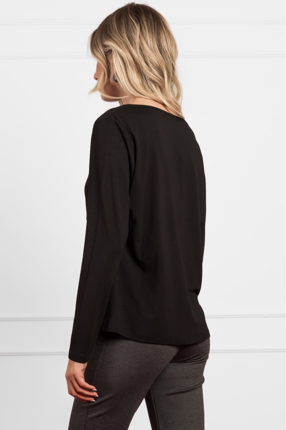 Crna majica dugih rukava izrađena od mekane viskoze s dodatkom elastina pruža udobnost i savršeno pristajanje. Posebno je ukrašena suptilnim sitnim cirkonima uz izrez, koji dodaju dašak eleg..