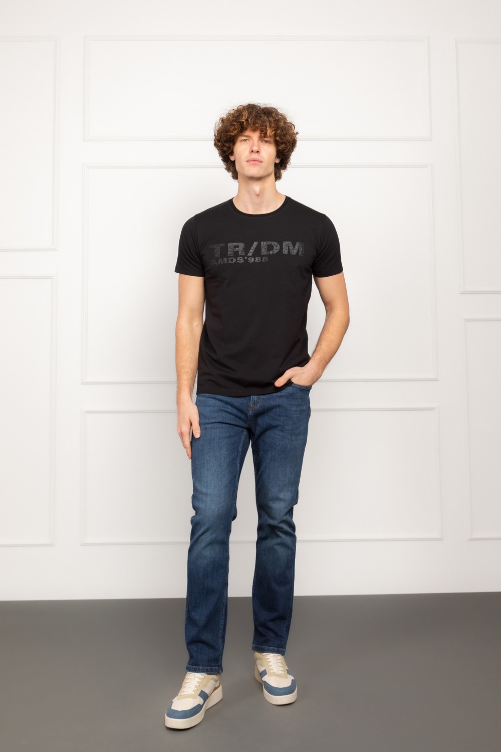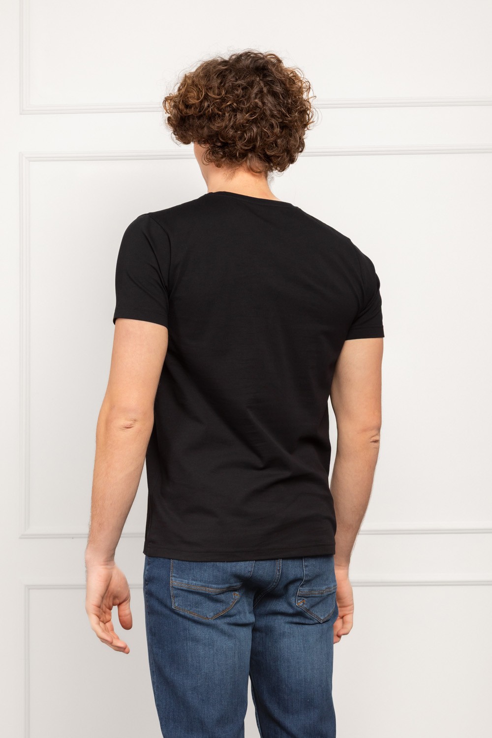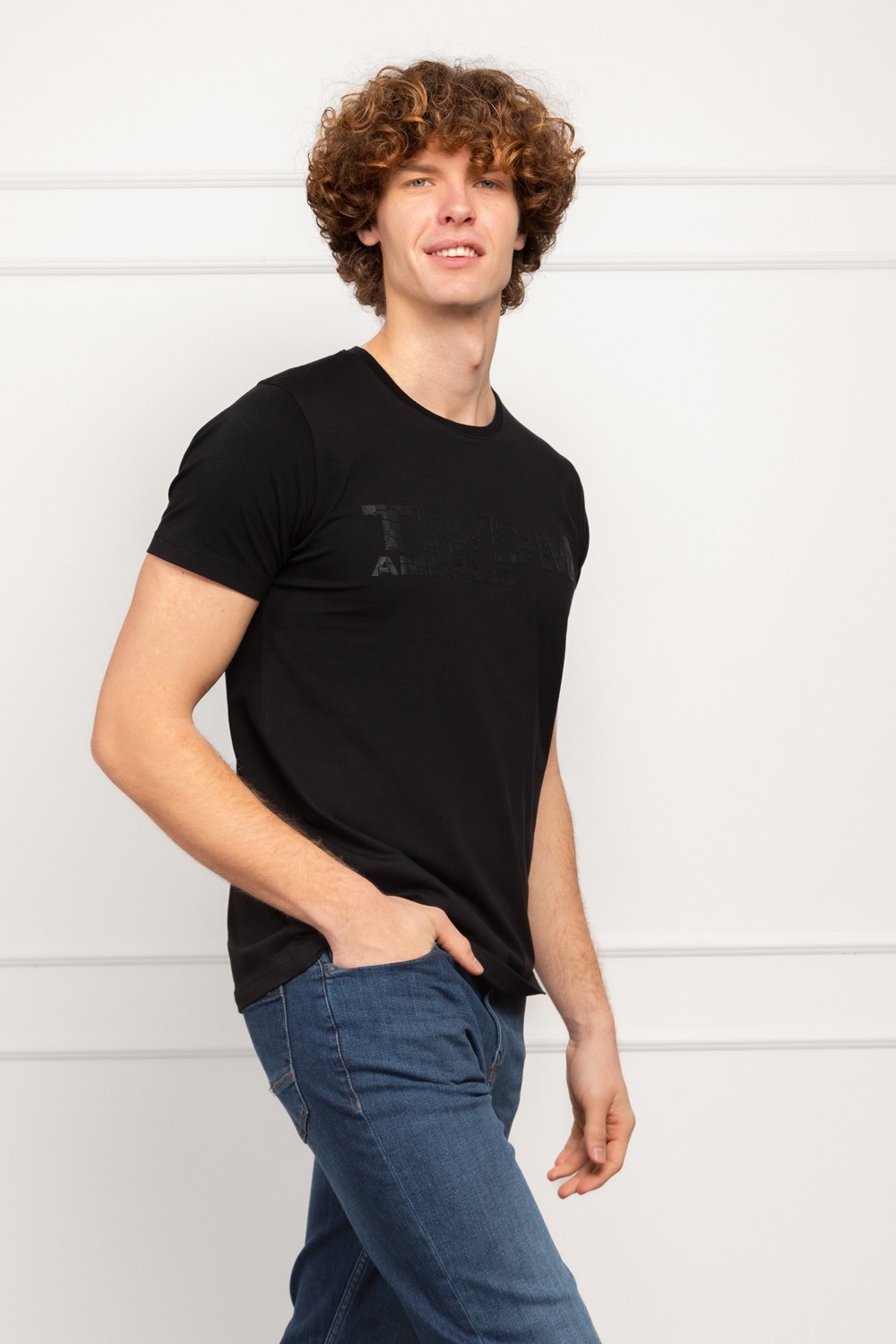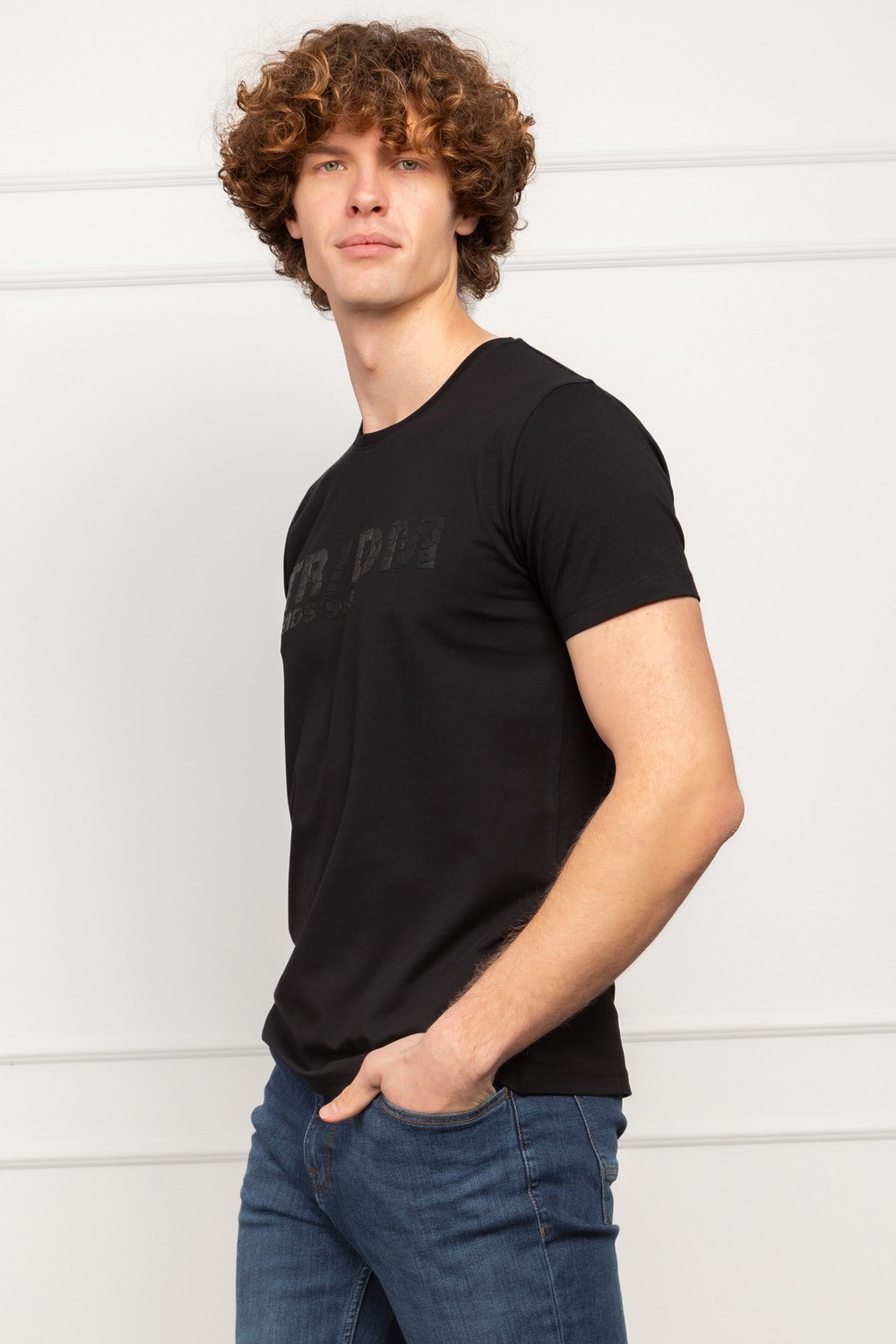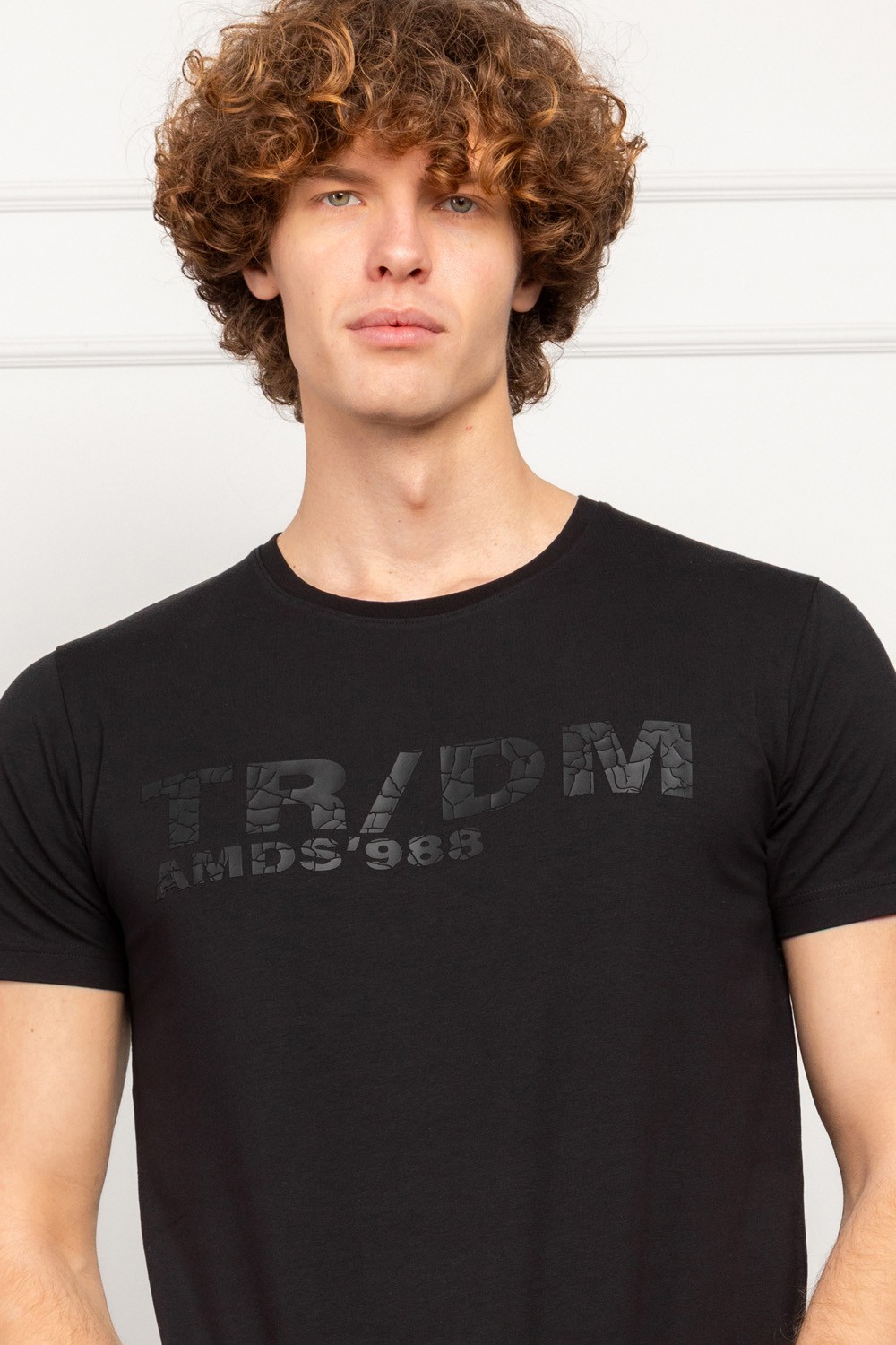 Crna muška majica u slim fit kroju donosi moderan i minimalistički stil s upečatljivim mat-print logom koji stvara „puknuti“ vizualni efekt. Ovaj detalj daje majici zanimljiv karakter, pa je pogodna za svakodnevno nošenje.