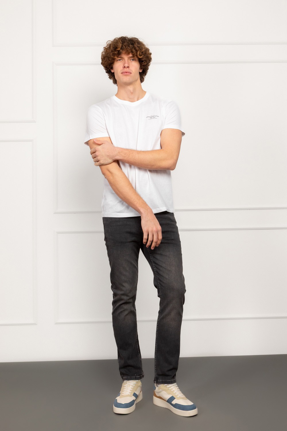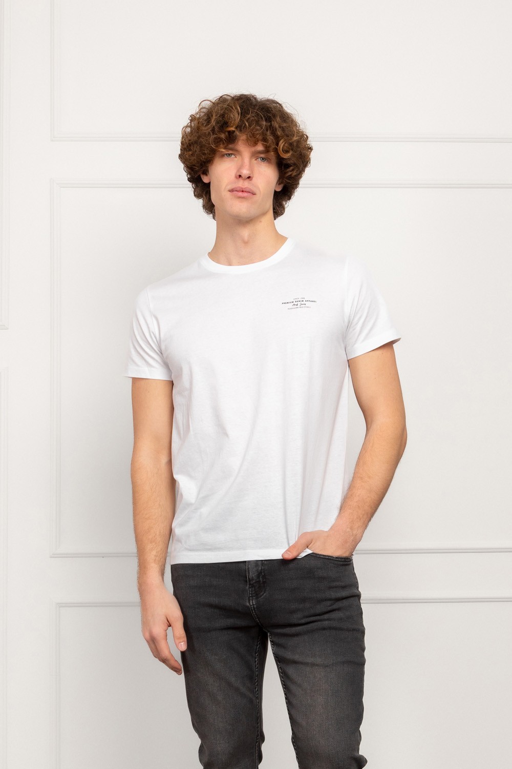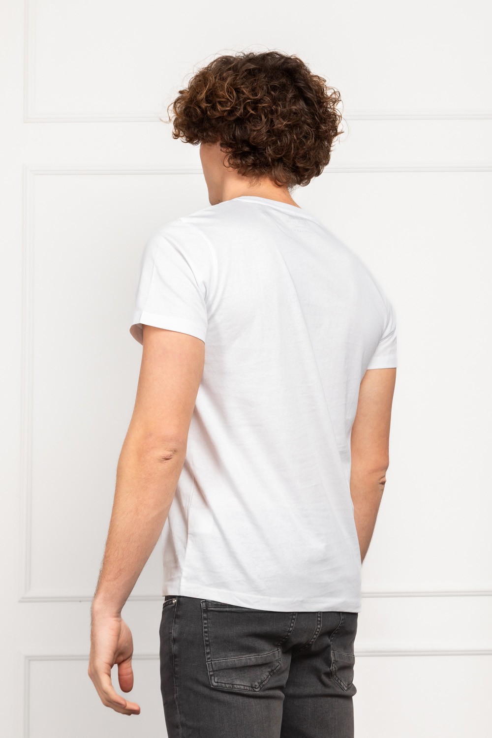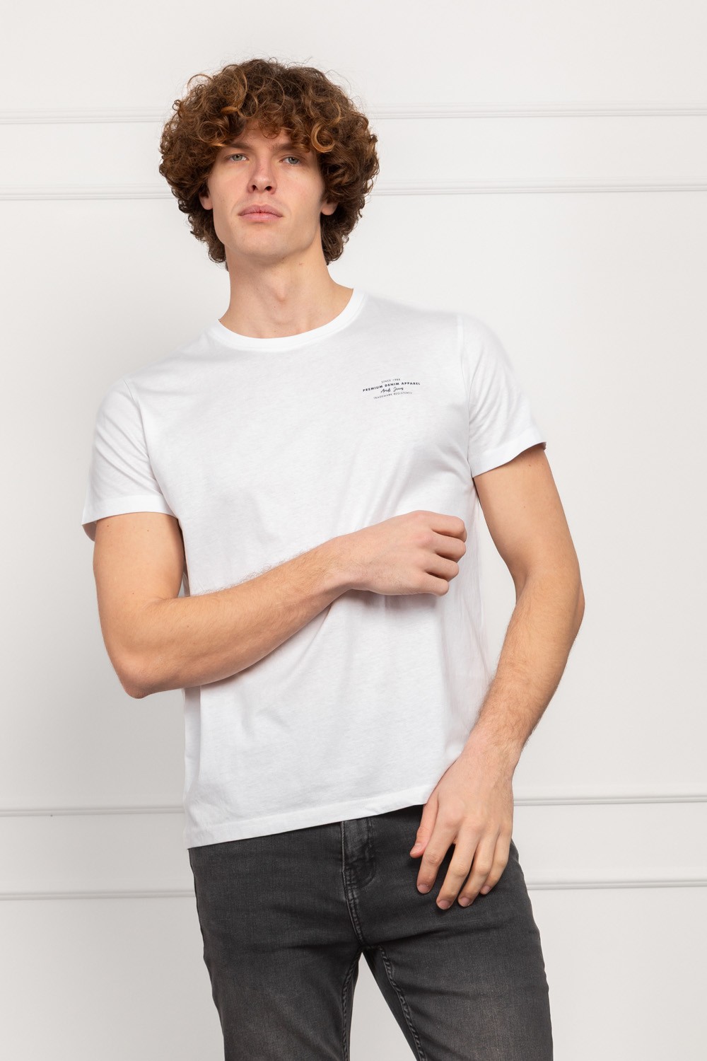 Muška majica kratkih rukava u klasično bijeloj boji s diskretnim printom na prsima koji podsjeća na vintage premium denim estetiku. Regular fit kroj pruža udobnost i prirodan pad na tijelu, bez stezanja i bez viška širine.