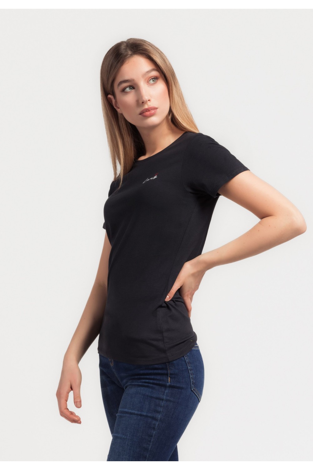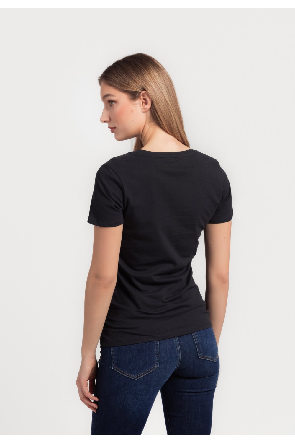 Ženska majica produljenog kratkog rukava sa ušitcima. Metalna srebrna pločica s lijeve strane pri donjem rubu majice. V-izreza. -95% PAMUK, 5% ELASTINModel je visok 180 cm i nosi veličinu S..