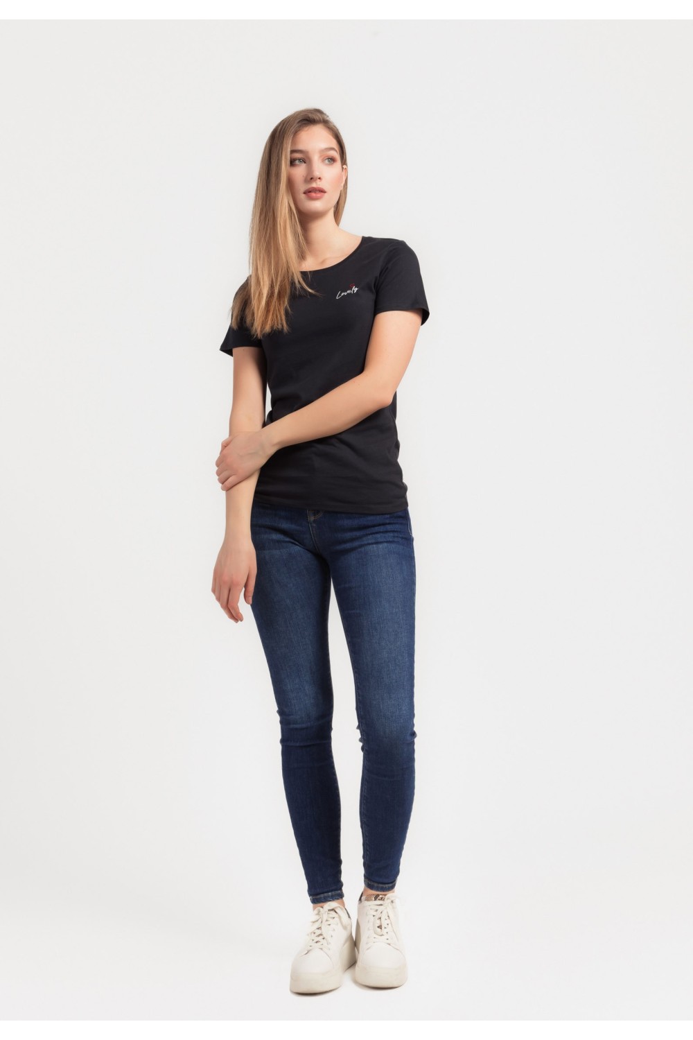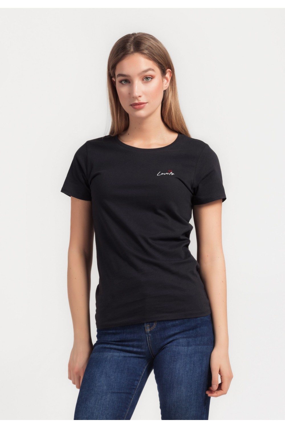 Ženska majica kratkog rukava s natpisom u crnoj boji i folijskom aplikacijom cvijeta u srebrnoj boji. Okruglog ovratnika. -95% PAMUK, 5% PAMUKModel je visok 180 cm i nosi veličinu S/V36..