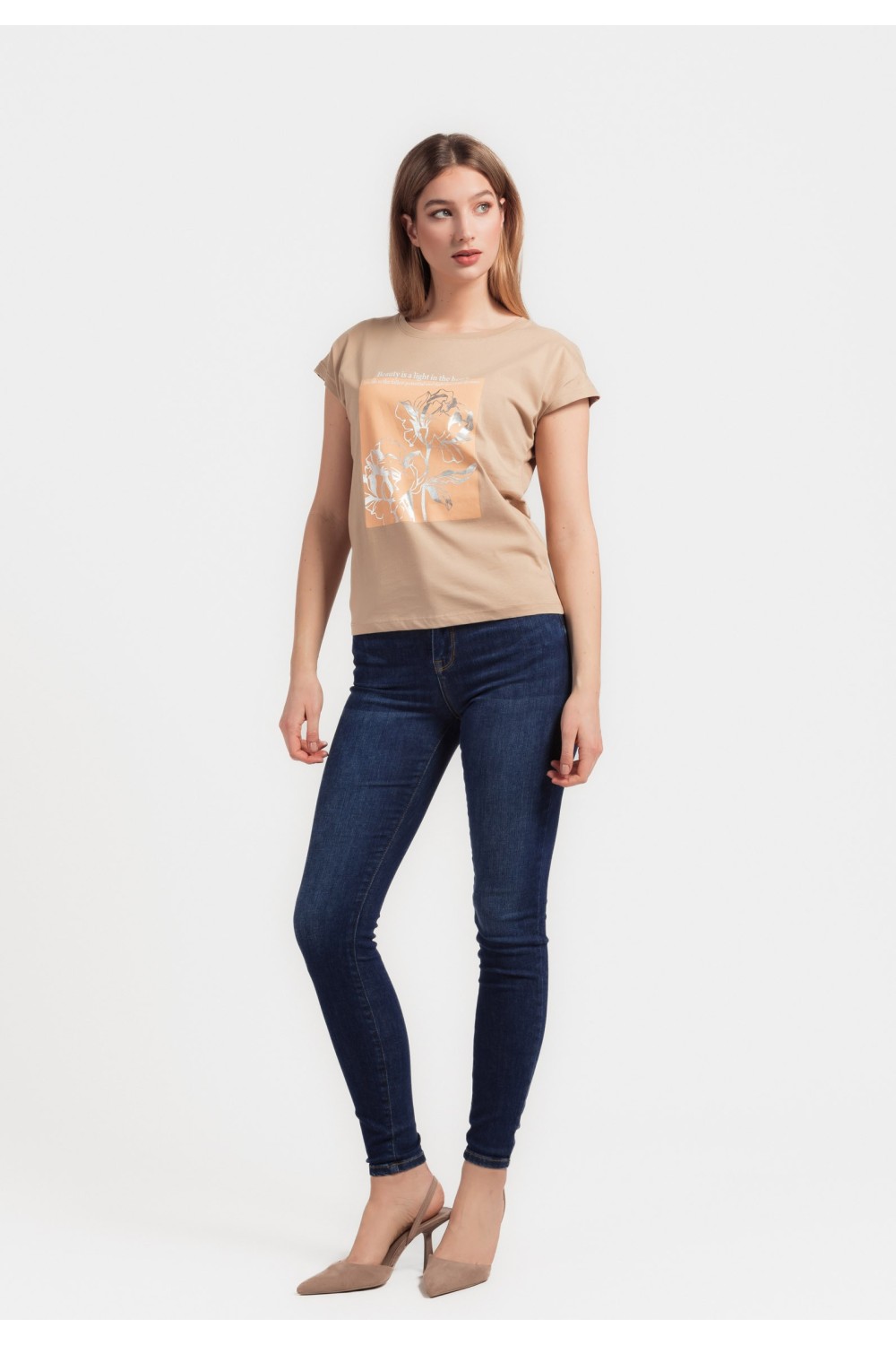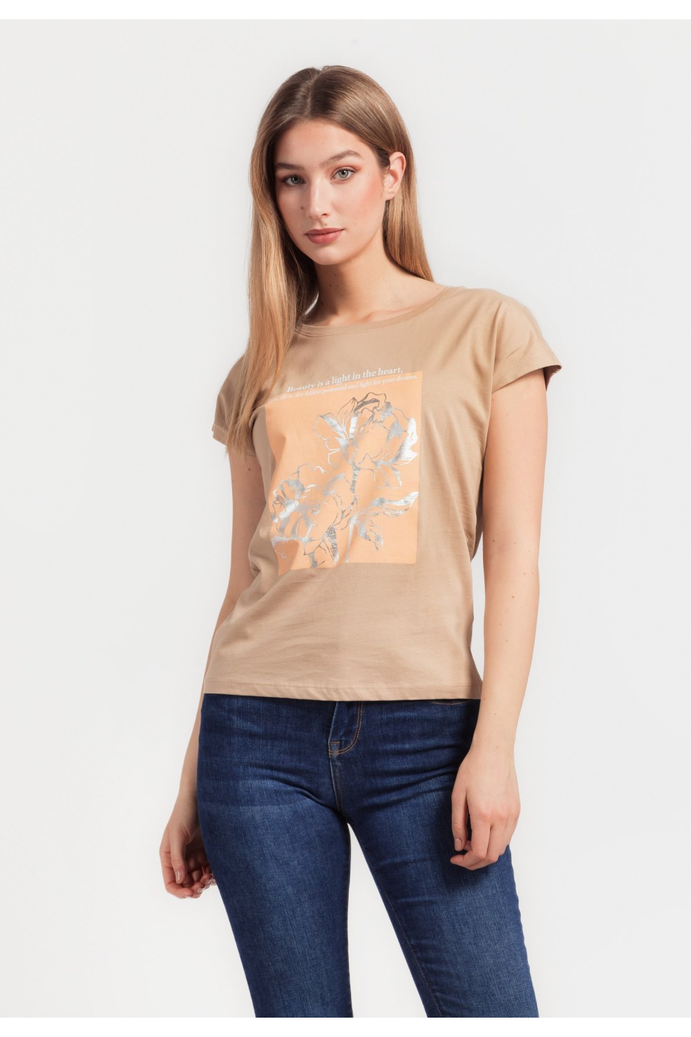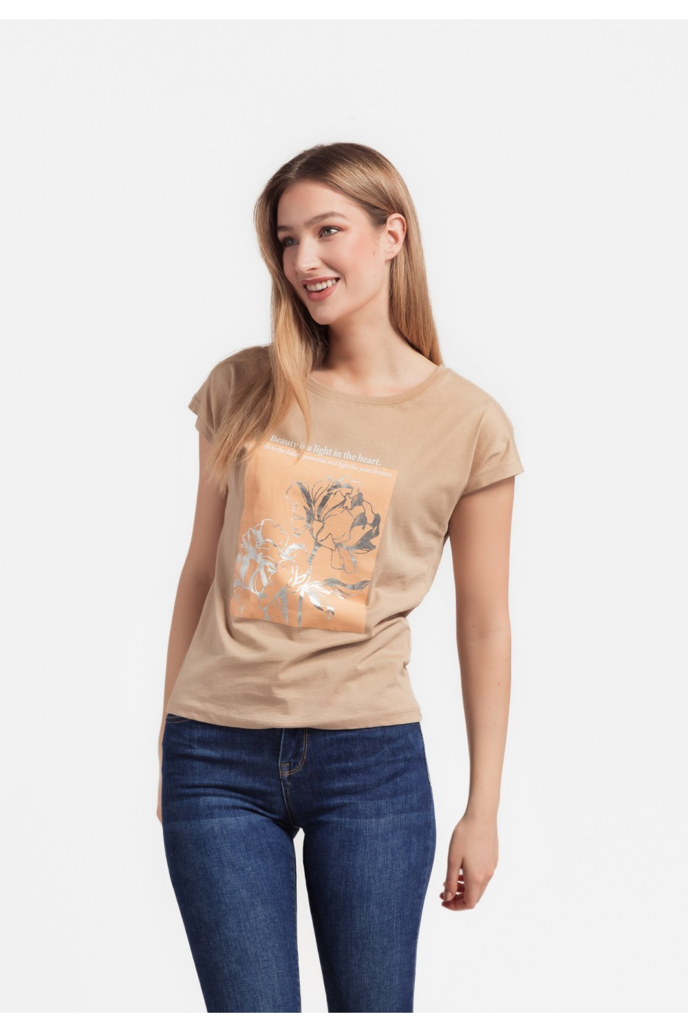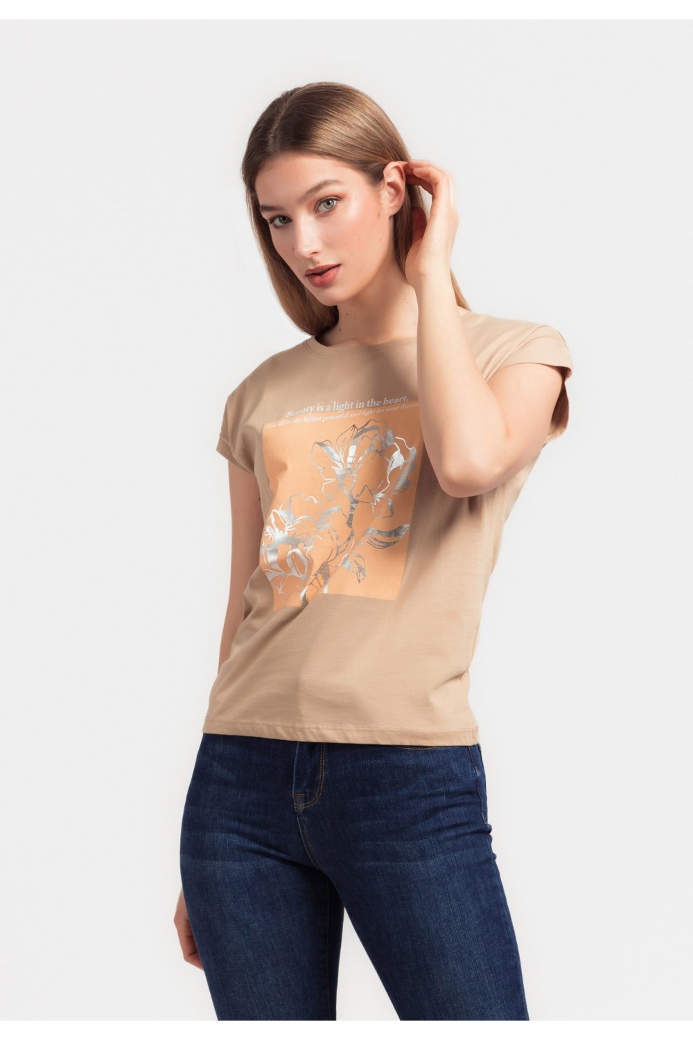 Pamučna majica kratkog rukava, podavinutih rubova sa cvjetnim tiskom i zlatnim detaljima, sprijeda. Okruglog ovratnika.-95% PAMUK, 5% ELASTIN Model je visok 175 cm i nosi veličinu S/V36..
