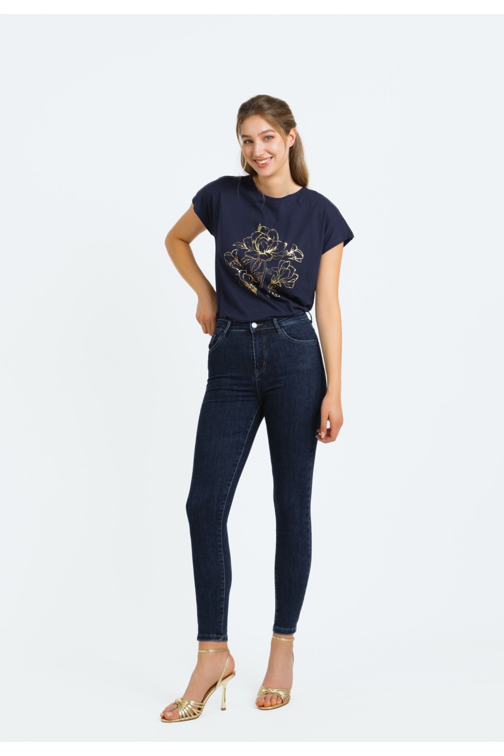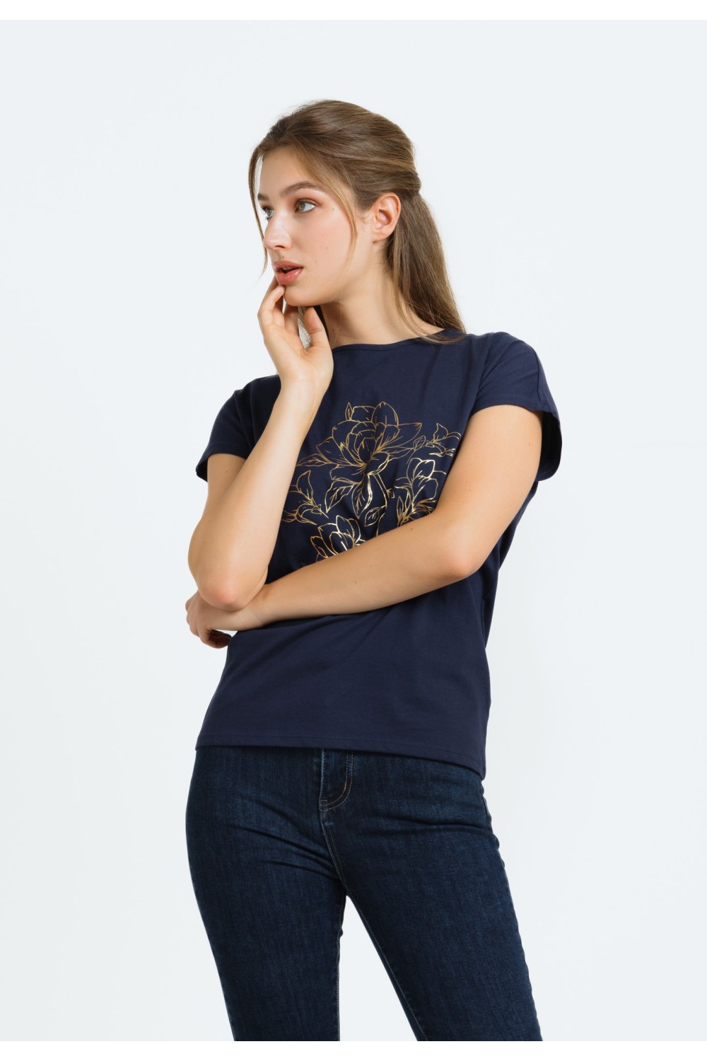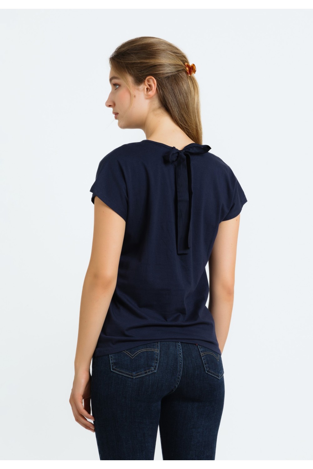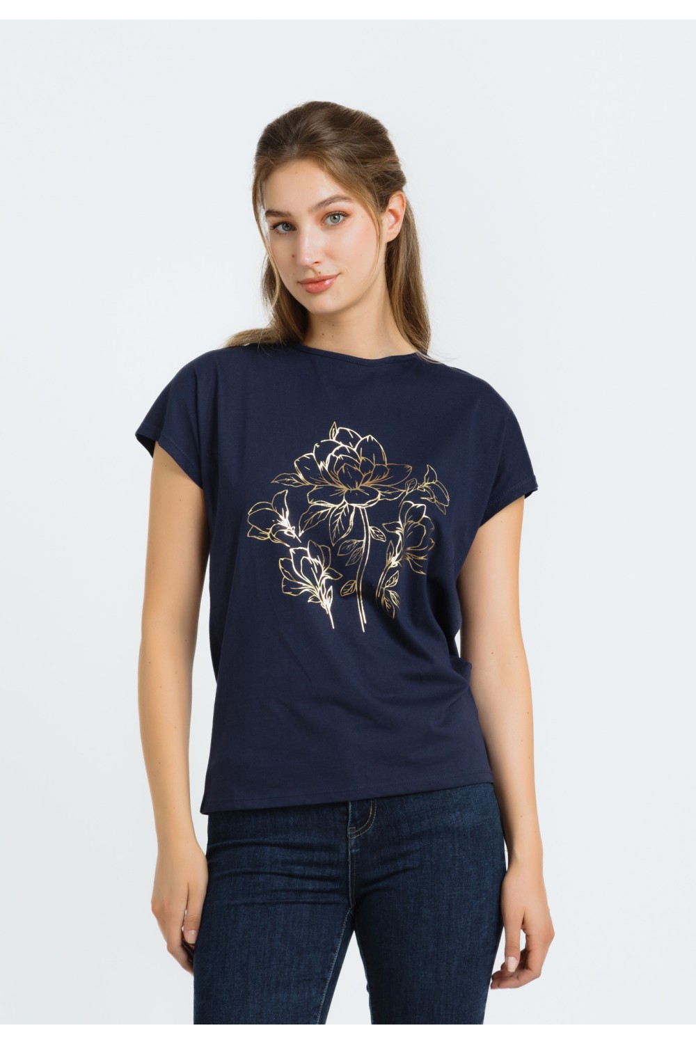 Ženska majica kratkog rukava, podavinutih na rubovima. Okruglog ovratnika većeg otvora sa detaljima srebrnih cirkona, apliciranih uz rub.-100% PAMUKModel je visok 175 cm i nosi veličinu S/V3..