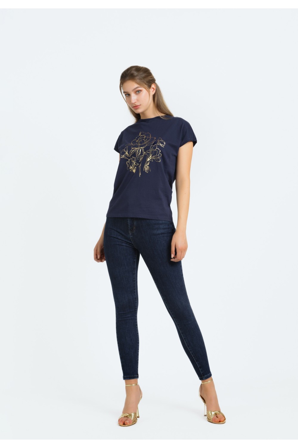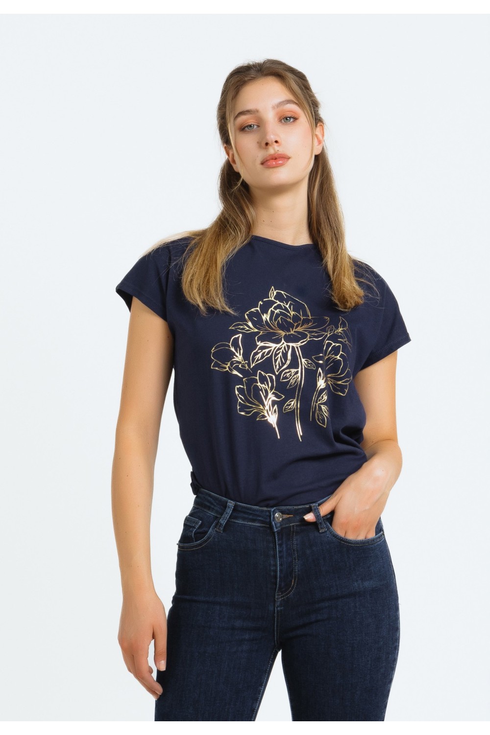 Ženska majica kraćih rukava sa svjetlucavim nitnama na rubu ovratnika i rukavima. -70% MODALNO VLAKNO, 30% POLIESTERModel je visok 175 cm i nosi veličinu S/V36..
