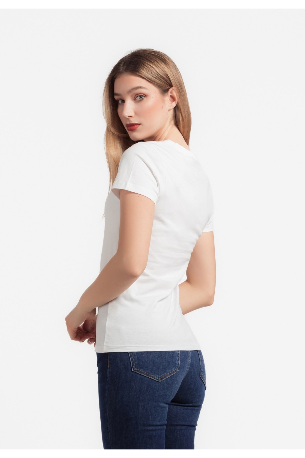 Ženska majica kratkog rukava, podavinutih na rubovima. Okruglog ovratnika većeg otvora sa detaljima srebrnih cirkona, apliciranih uz rub.-100% PAMUKModel je visok 175 cm i nosi veličinu S/V3..