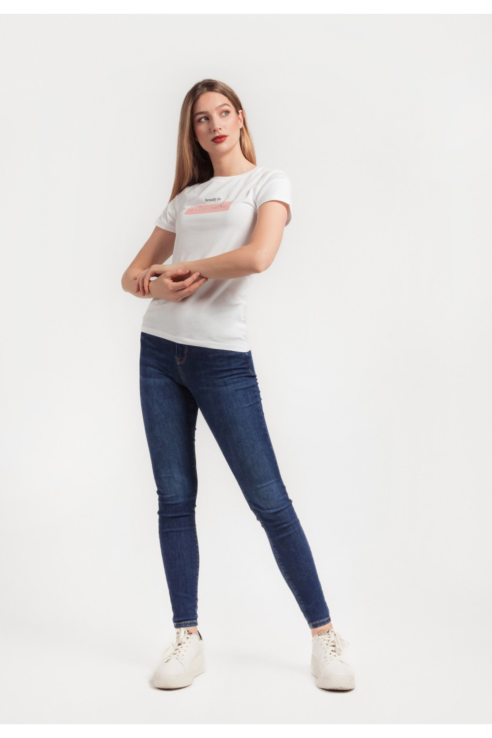 Ženska majica kratkog rukava sa cvjetnim tiskom sprijeda i detaljima apliciranih cirkona. Okruglog ovratnika.-50% PAMUK, 50% MODALNO VLAKNOModel je visok 175 cm i nosi veličinu S/V36..