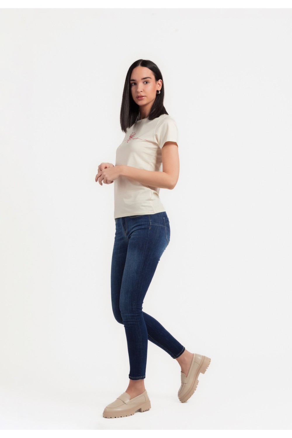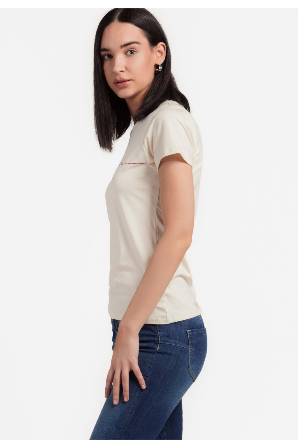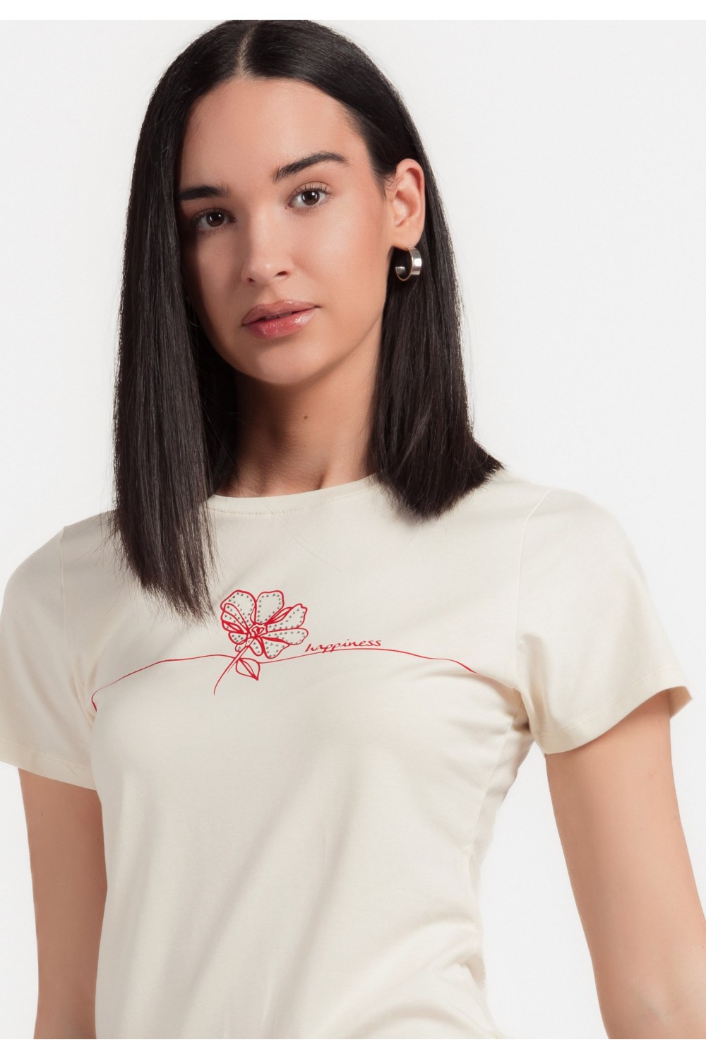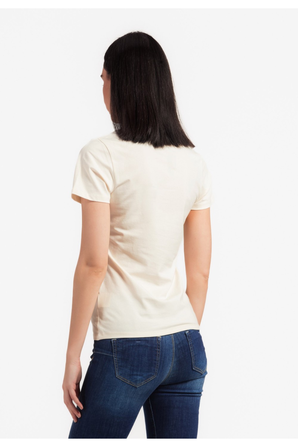 Prljavo bijela ženska majica, kratkog rukava. Sprijeda crni tisak. -100% PAMUKModel je visok cm i 175 nosi veličinu S/V36..