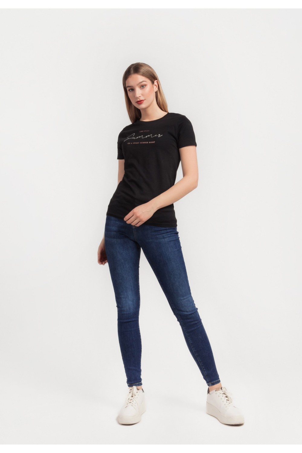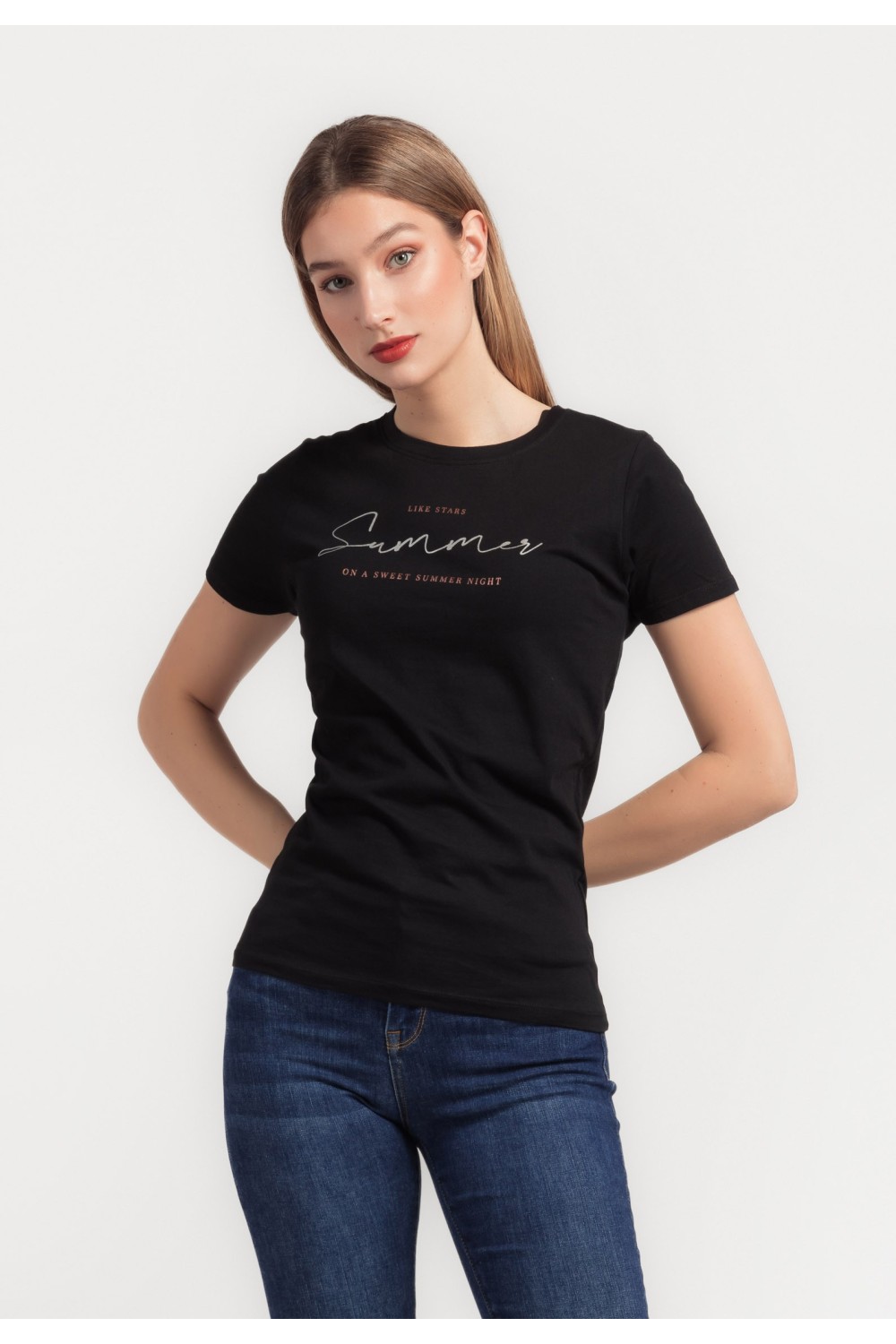 Ženska majica kratkog rukava sa cvjetnim tiskom sprijeda i detaljima apliciranih cirkona. Okruglog ovratnika.-50% PAMUK, 50% MODALNO VLAKNOModel je visok 175 cm i nosi veličinu S/V36..