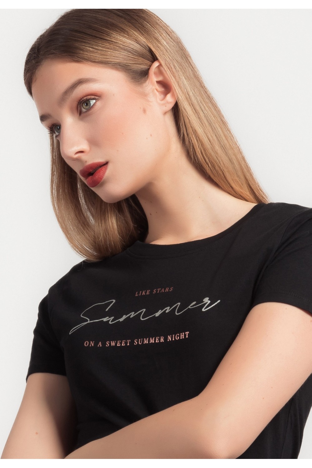 Ženska majica kraćih rukava sa svjetlucavim nitnama na rubu ovratnika i rukavima. -70% MODALNO VLAKNO, 30% POLIESTERModel je visok 175 cm i nosi veličinu S/V36..