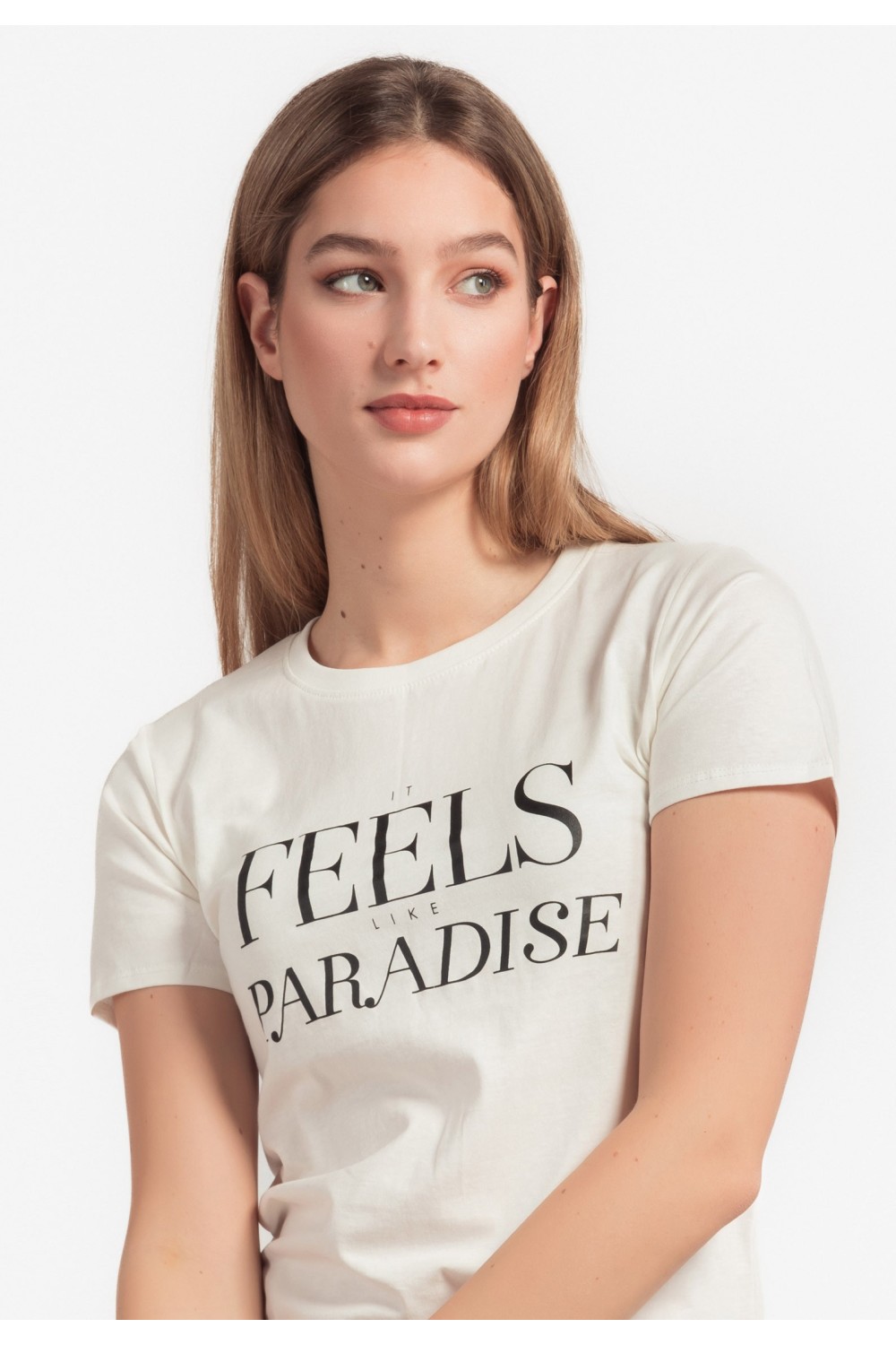 Ženska majica kratkog rukava sa cvjetnim tiskom sprijeda i detaljima apliciranih cirkona. Okruglog ovratnika.-50% PAMUK, 50% MODALNO VLAKNOModel je visok 175 cm i nosi veličinu S/V36..