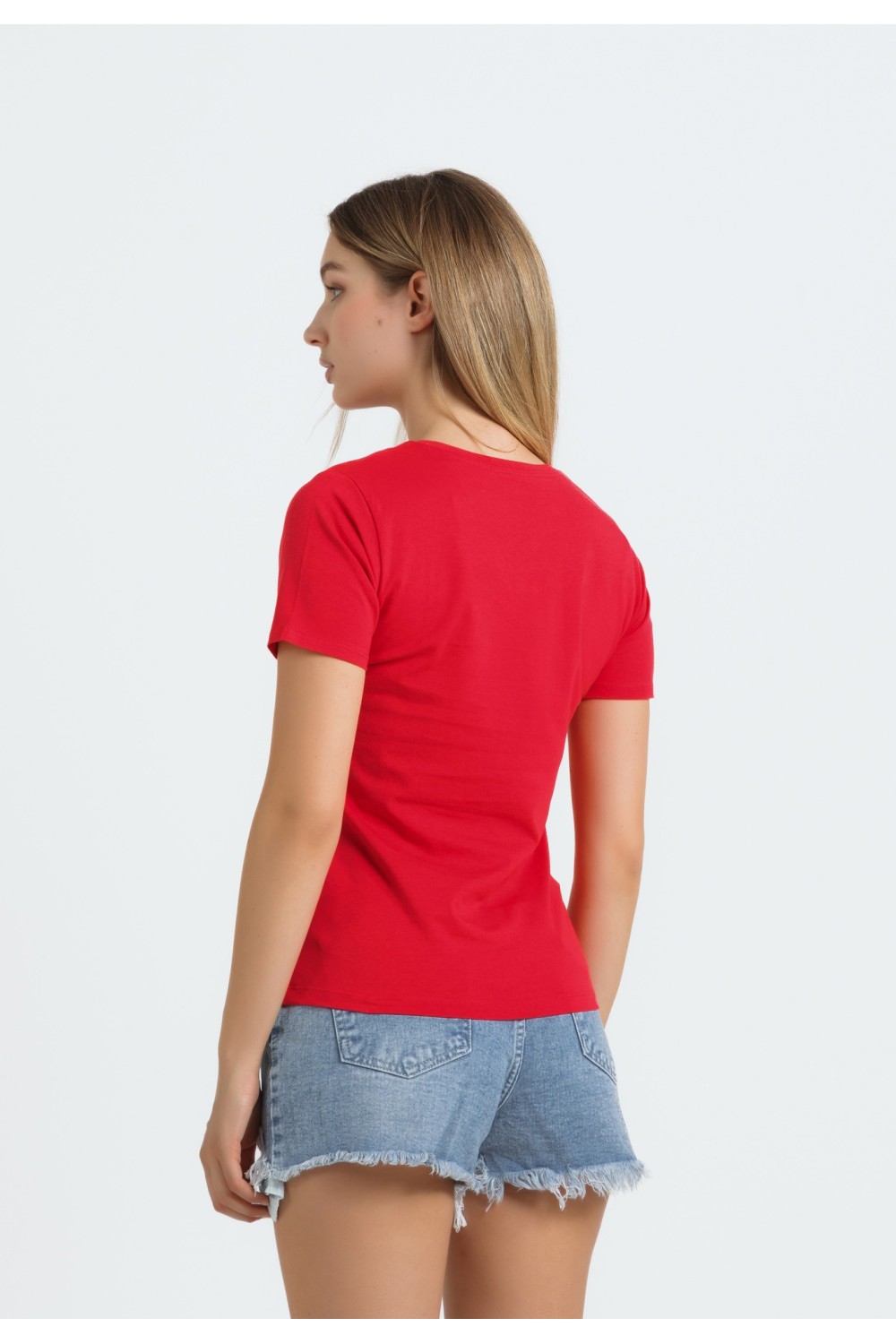 Ženska majica kratkog rukava sa cvjetnim tiskom sprijeda i detaljima apliciranih cirkona. Okruglog ovratnika.-50% PAMUK, 50% MODALNO VLAKNOModel je visok 175 cm i nosi veličinu S/V36..