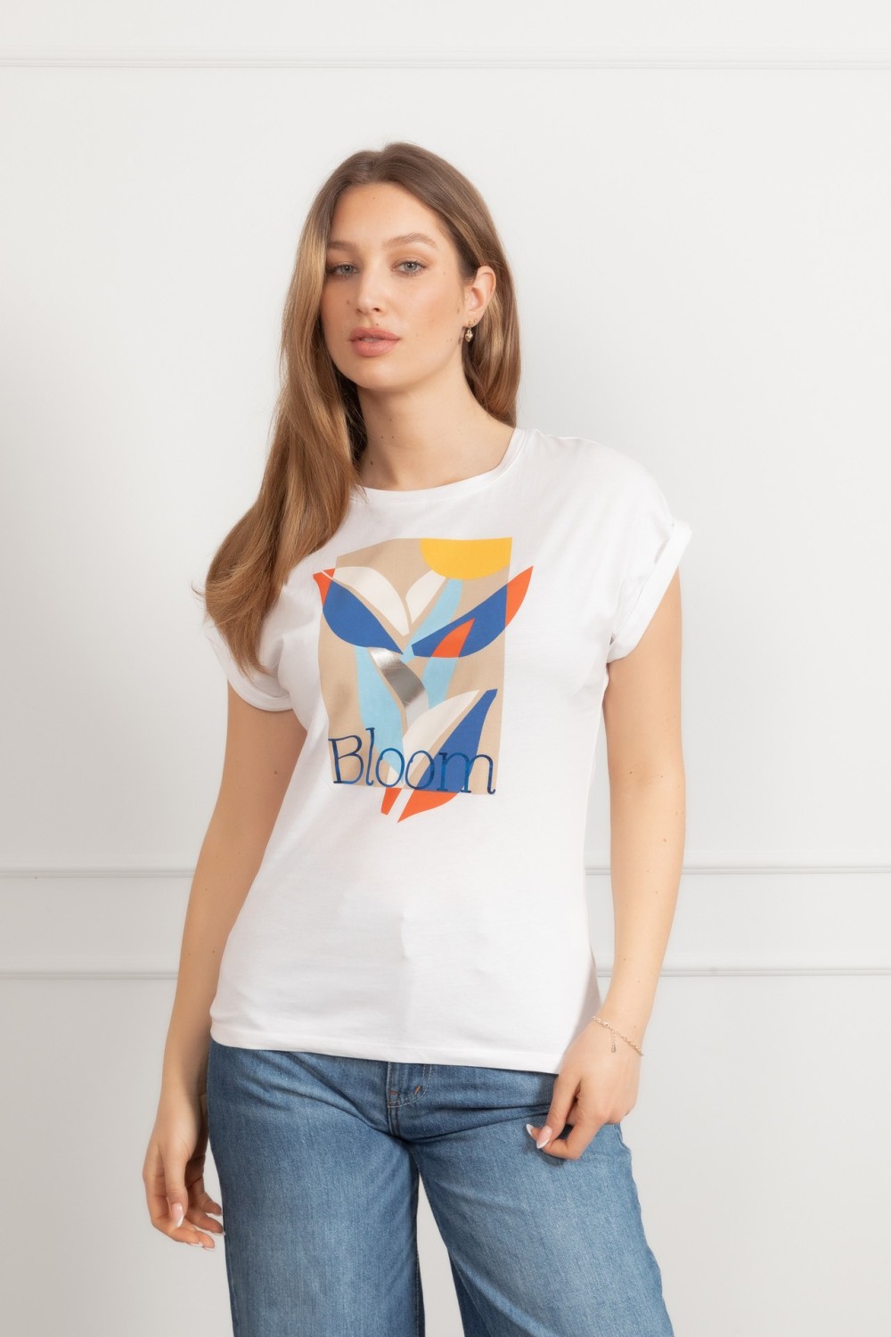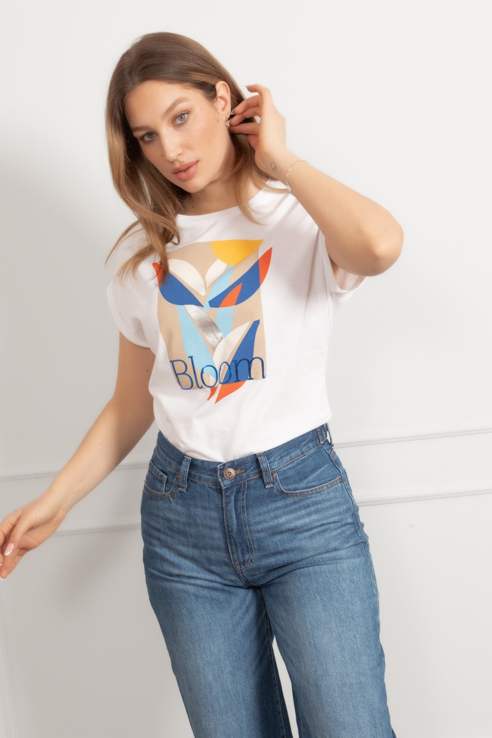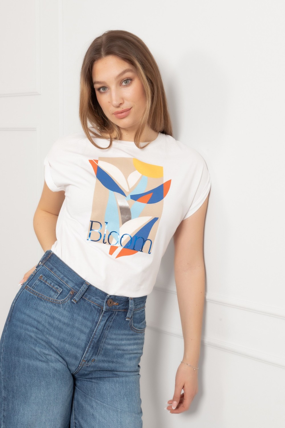 Ženska majica kratkih rukava u bijeloj boji s kreativnim 3D cvjetnim detaljem i natpisom. Kombinacija tiskanog motiva i voluminoznog cvijeta daje modni preokret i čini majicu zanimljivom na ..