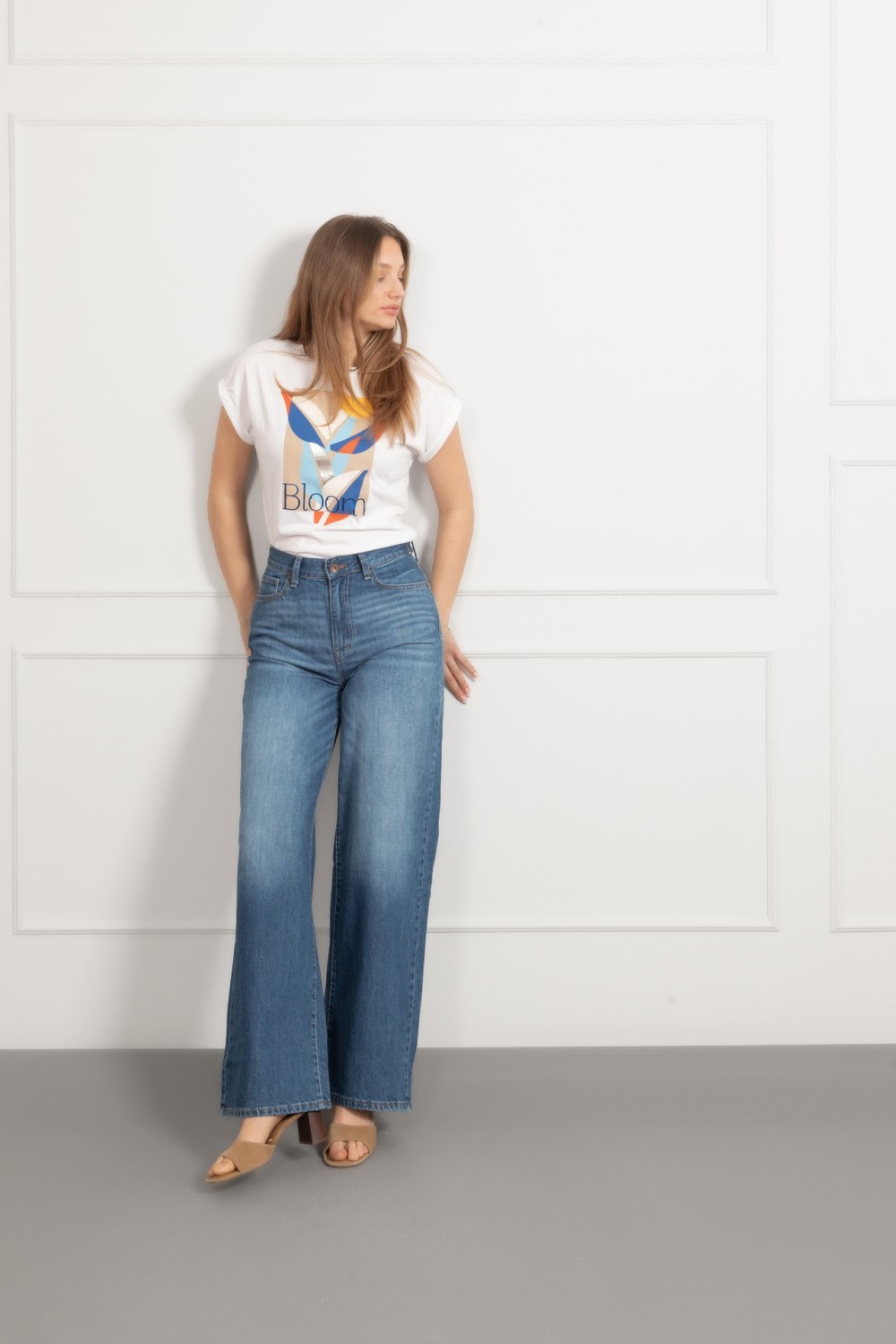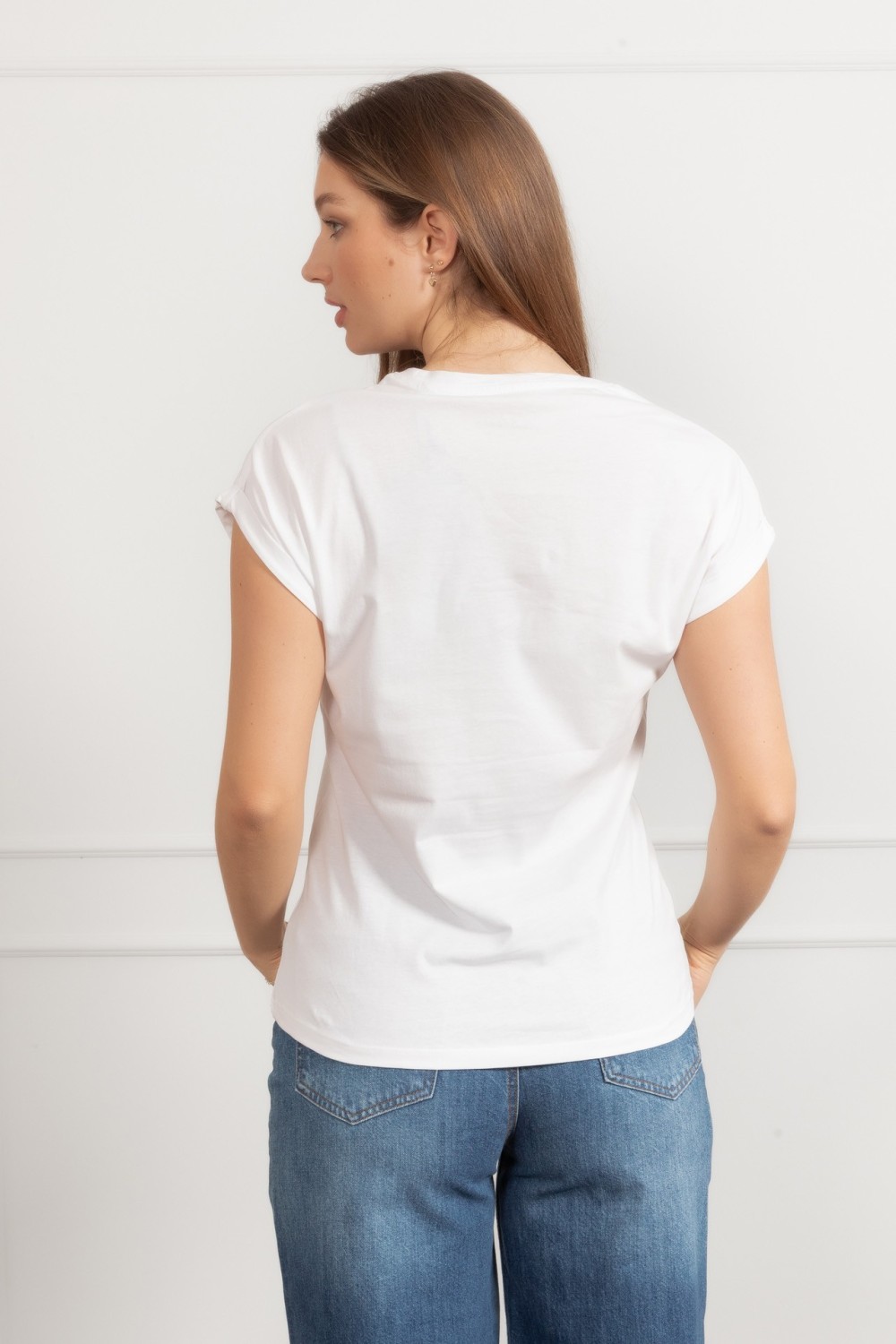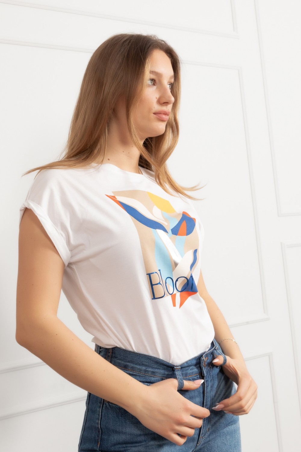 Ženska majica kratkih rukava u bijeloj boji s kreativnim 3D cvjetnim detaljem i natpisom. Kombinacija tiskanog motiva i voluminoznog cvijeta daje modni preokret i čini majicu zanimljivom na ..