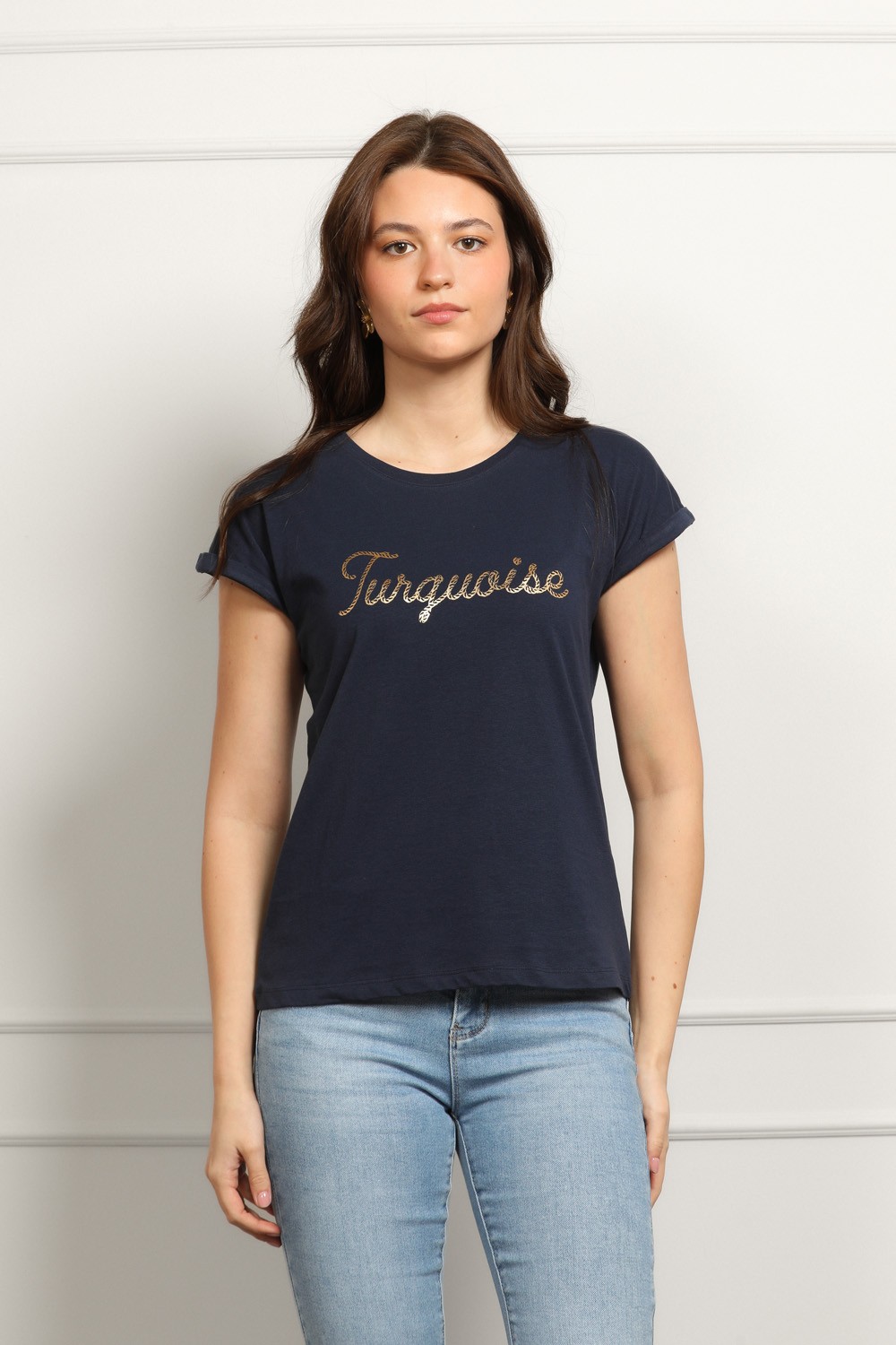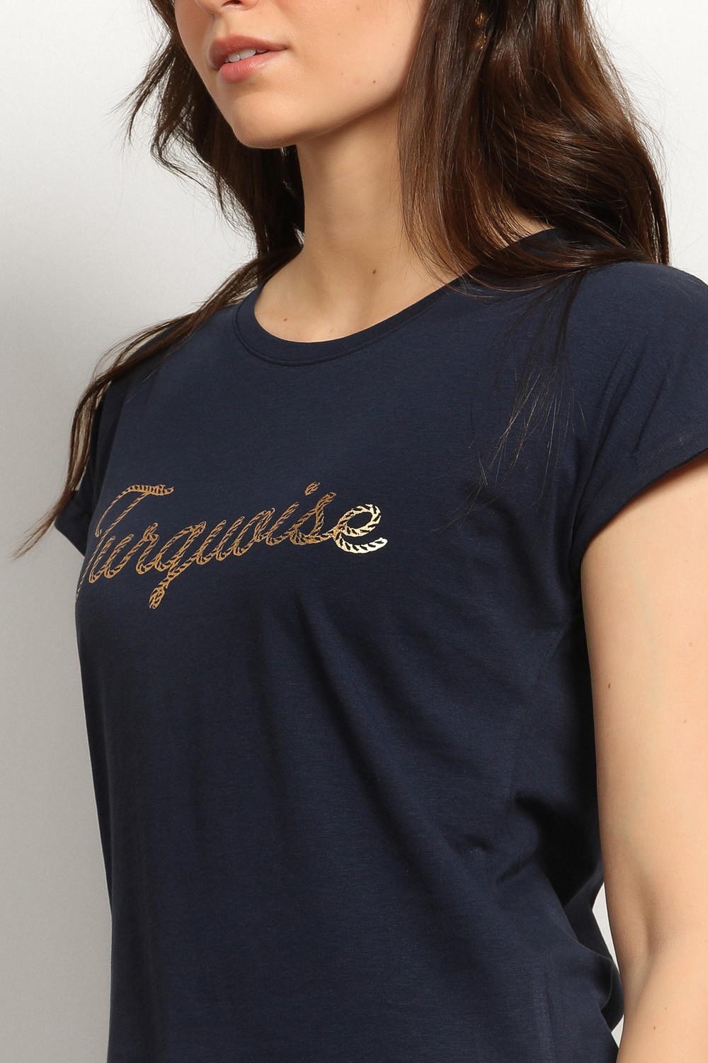 Tamno plava majica s efektnim zlatnim natpisom koji daje dozu luksuza svakodnevnoj kombinaciji. Minimalistički kroj i čiste linije čine je jednostavnom za kombiniranje, dok zlatni detalj podiže cijeli outfit.
