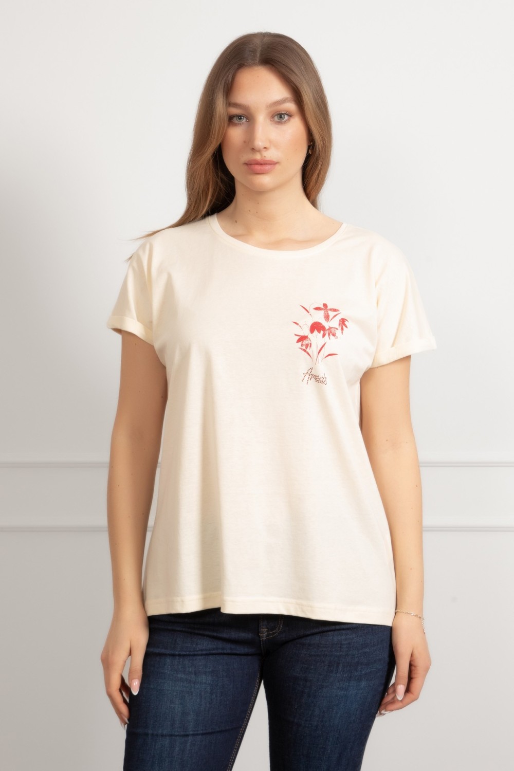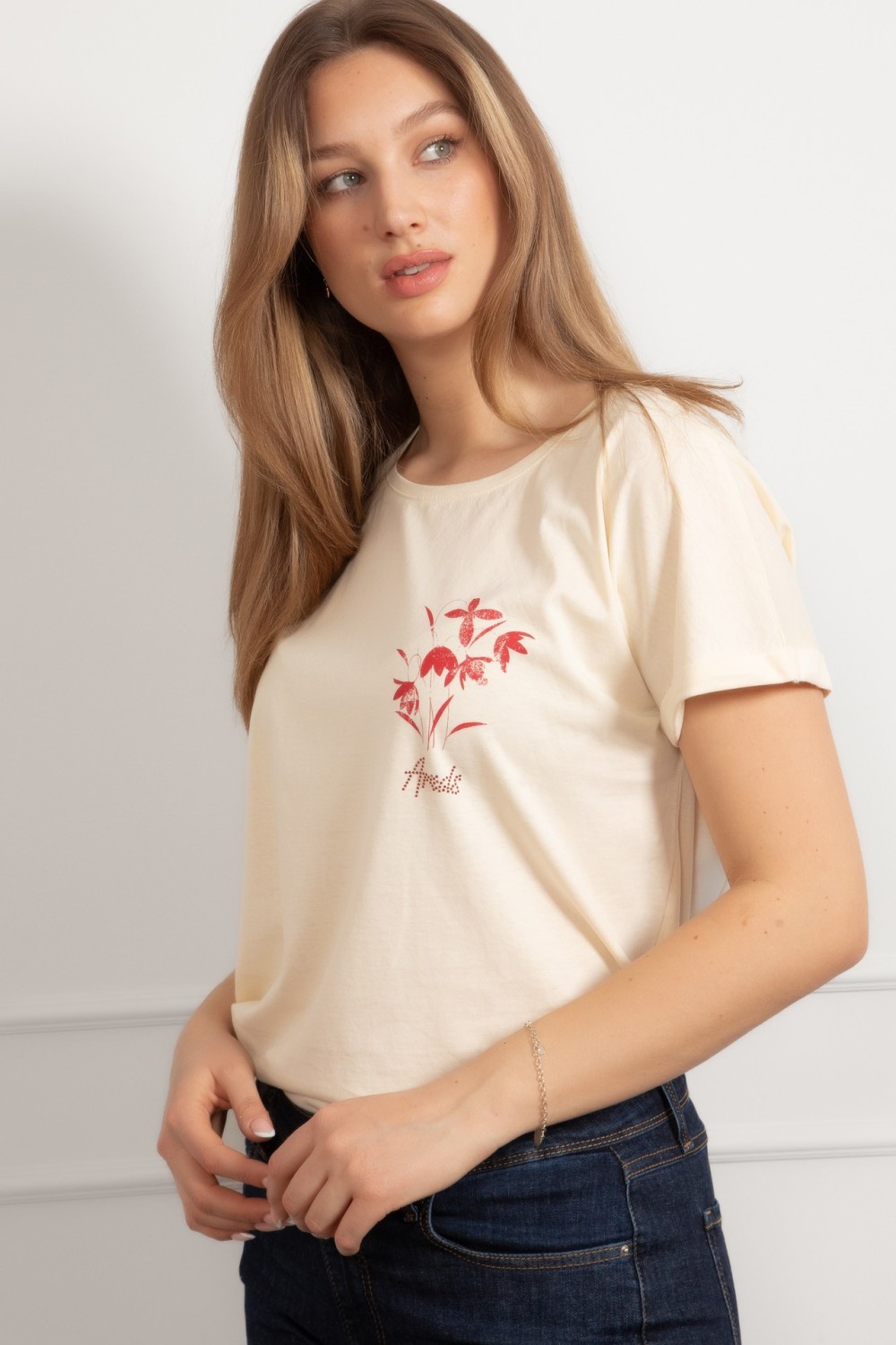 Ženska majica kratkih rukava u bijeloj boji s kreativnim 3D cvjetnim detaljem i natpisom. Kombinacija tiskanog motiva i voluminoznog cvijeta daje modni preokret i čini majicu zanimljivom na ..