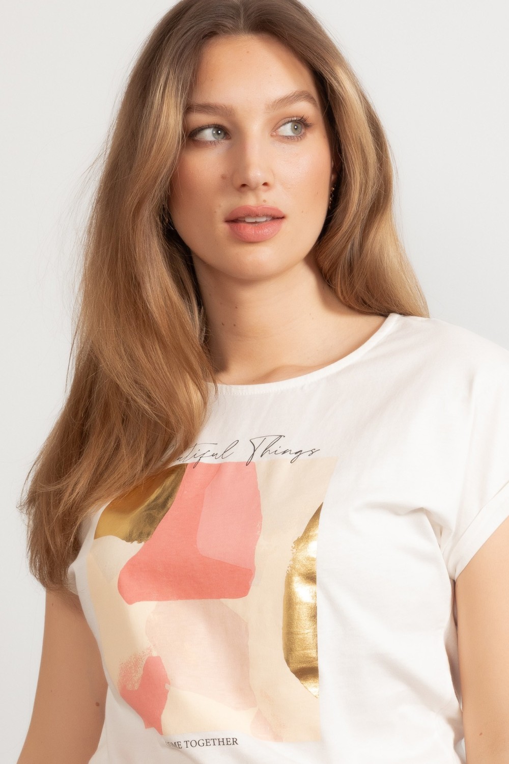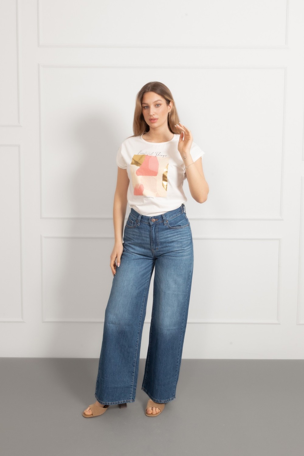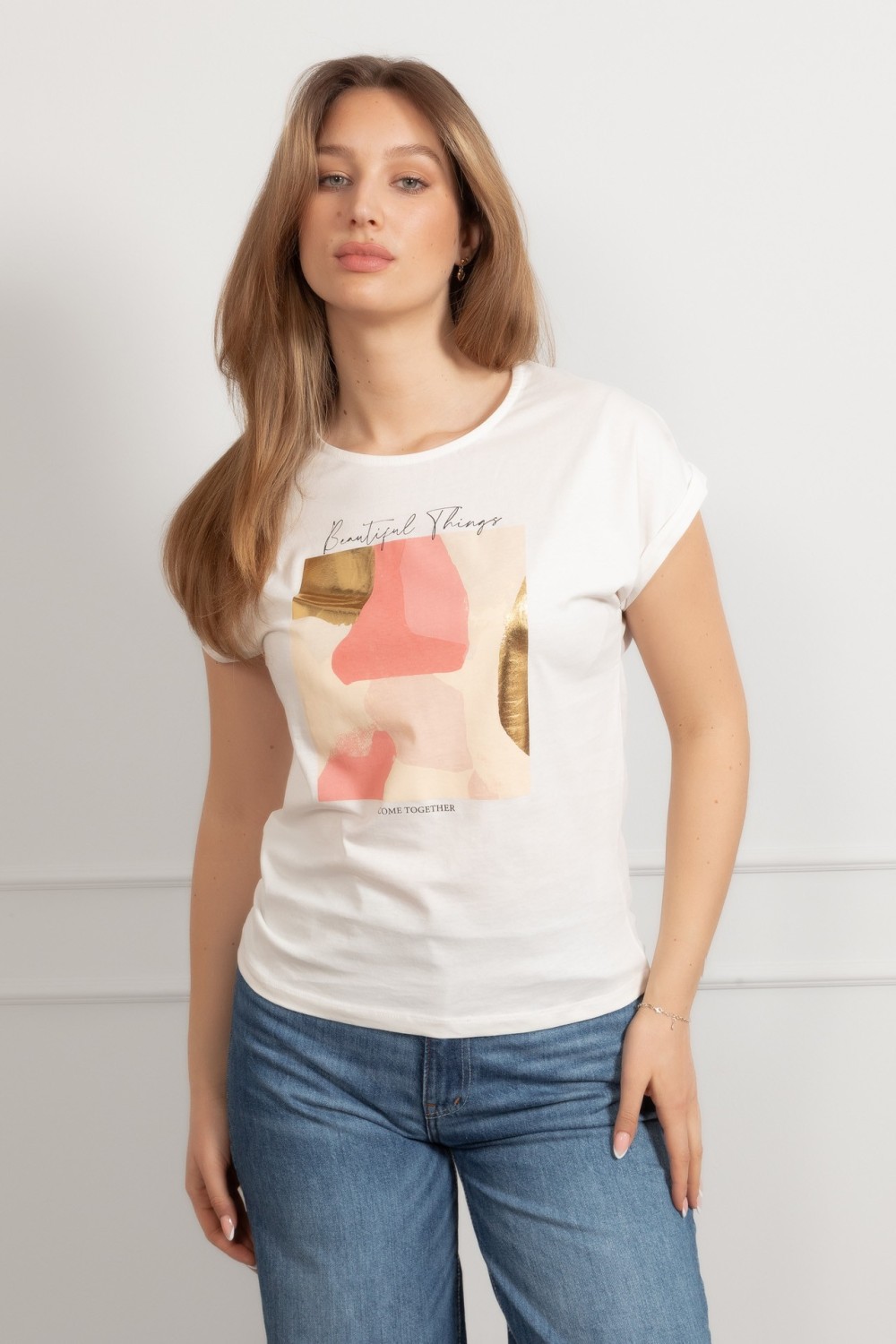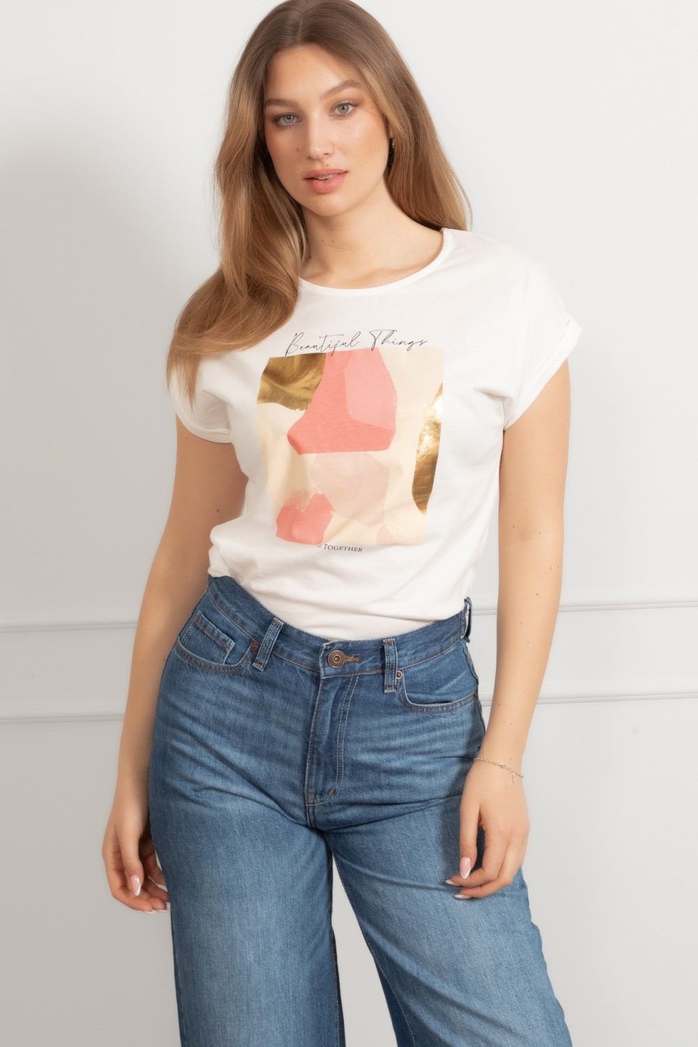 Bijela majica kratkih rukava s vezenim motivima u području dekoltea. Lagani “V” izrez daje ženstvenu i profinjenu notu. Vezeni cvjetni uzorci u pastelnim tonovima unose boju i razigranost be..