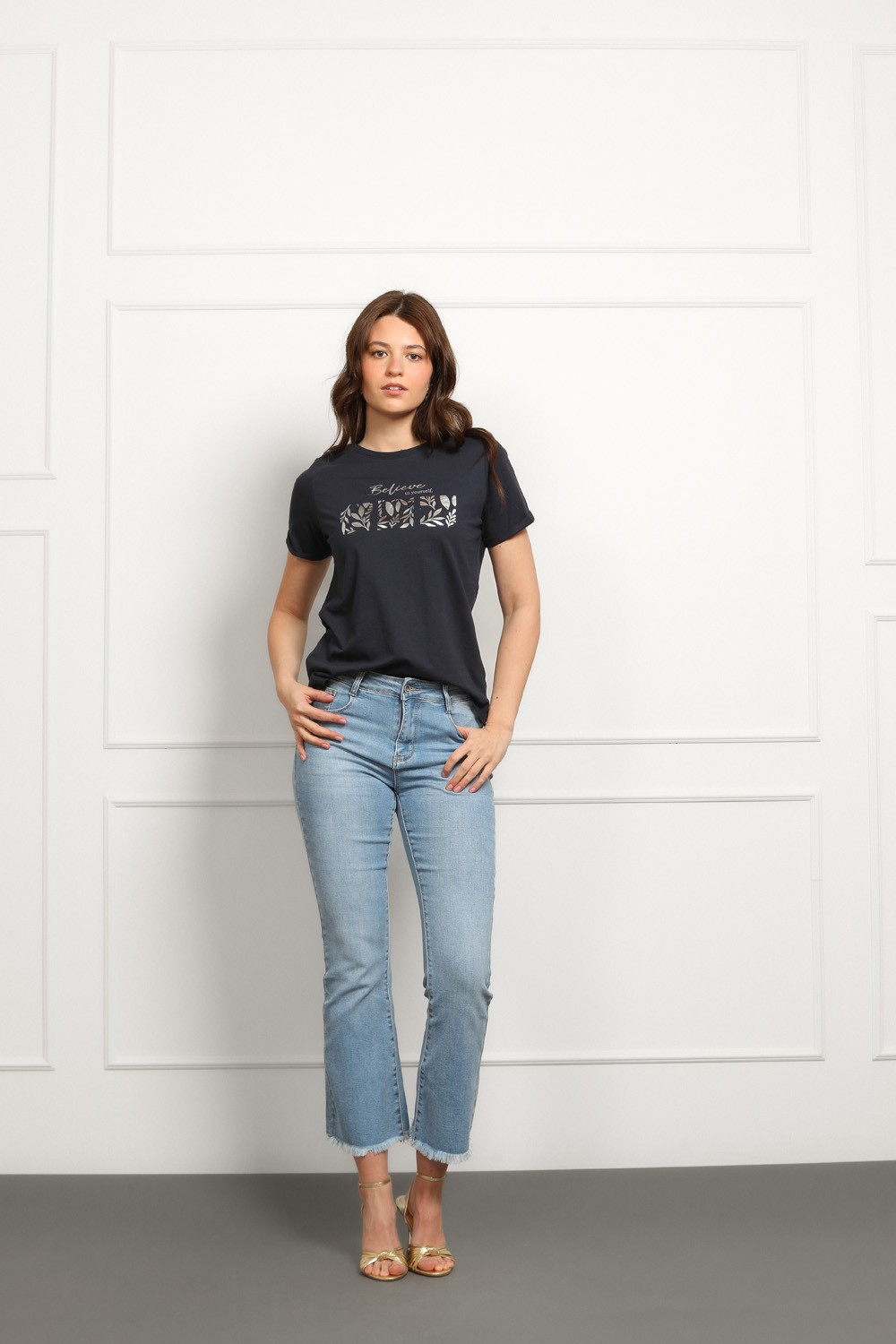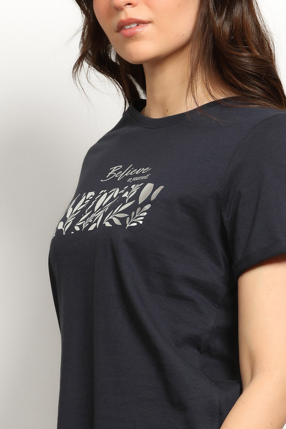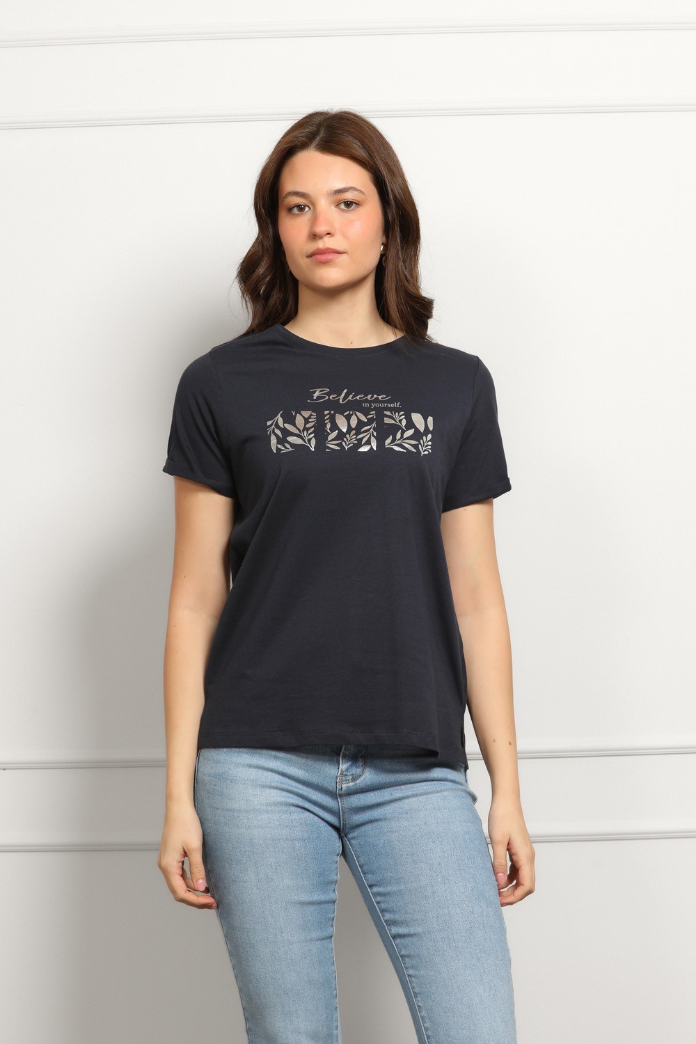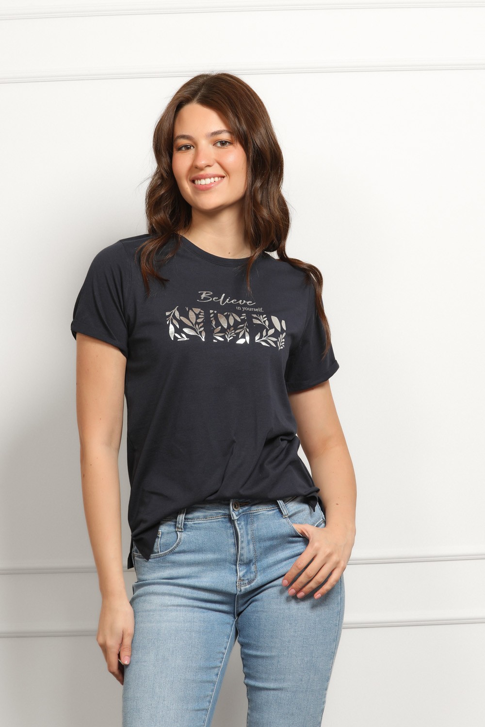 Tamno plava majica s inspirativnim natpisom. Zlatni print s decentnim motivima daje joj elegantnu notu, dok klasičan kroj i okrugli izrez zadržavaju ležernost.