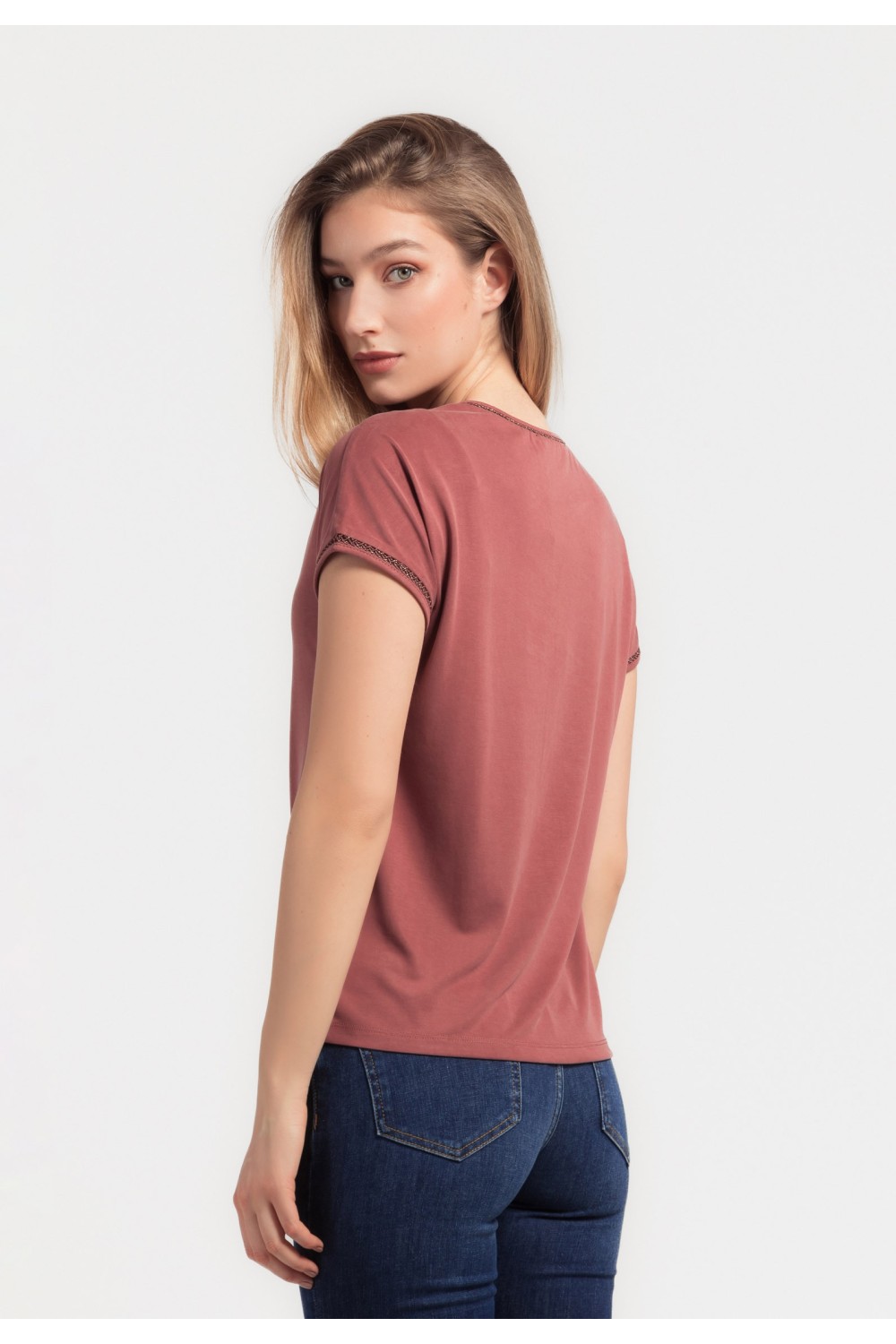 Viskozna majica, kratkog rukava sa prošivom na preklop sprijeda. Blagi V izrez.-95% VISKOZA, 5% ELASTINModel je visok 180 cm i nosi veličinu S/V36..