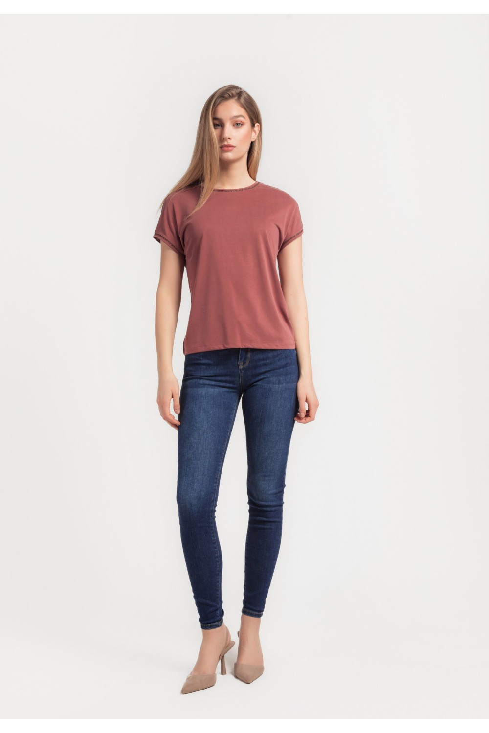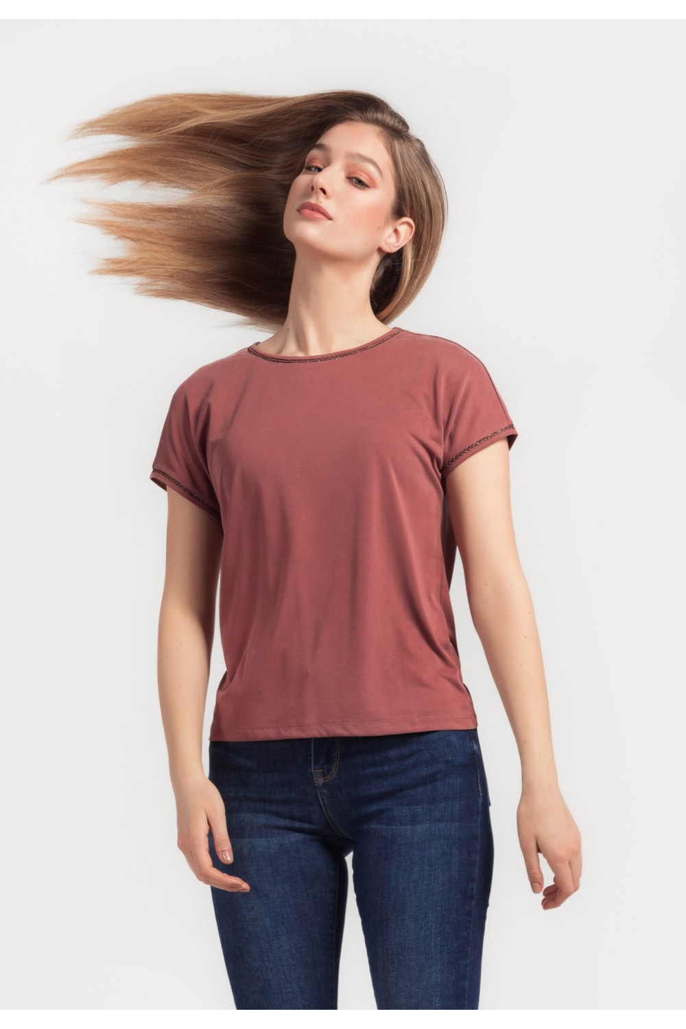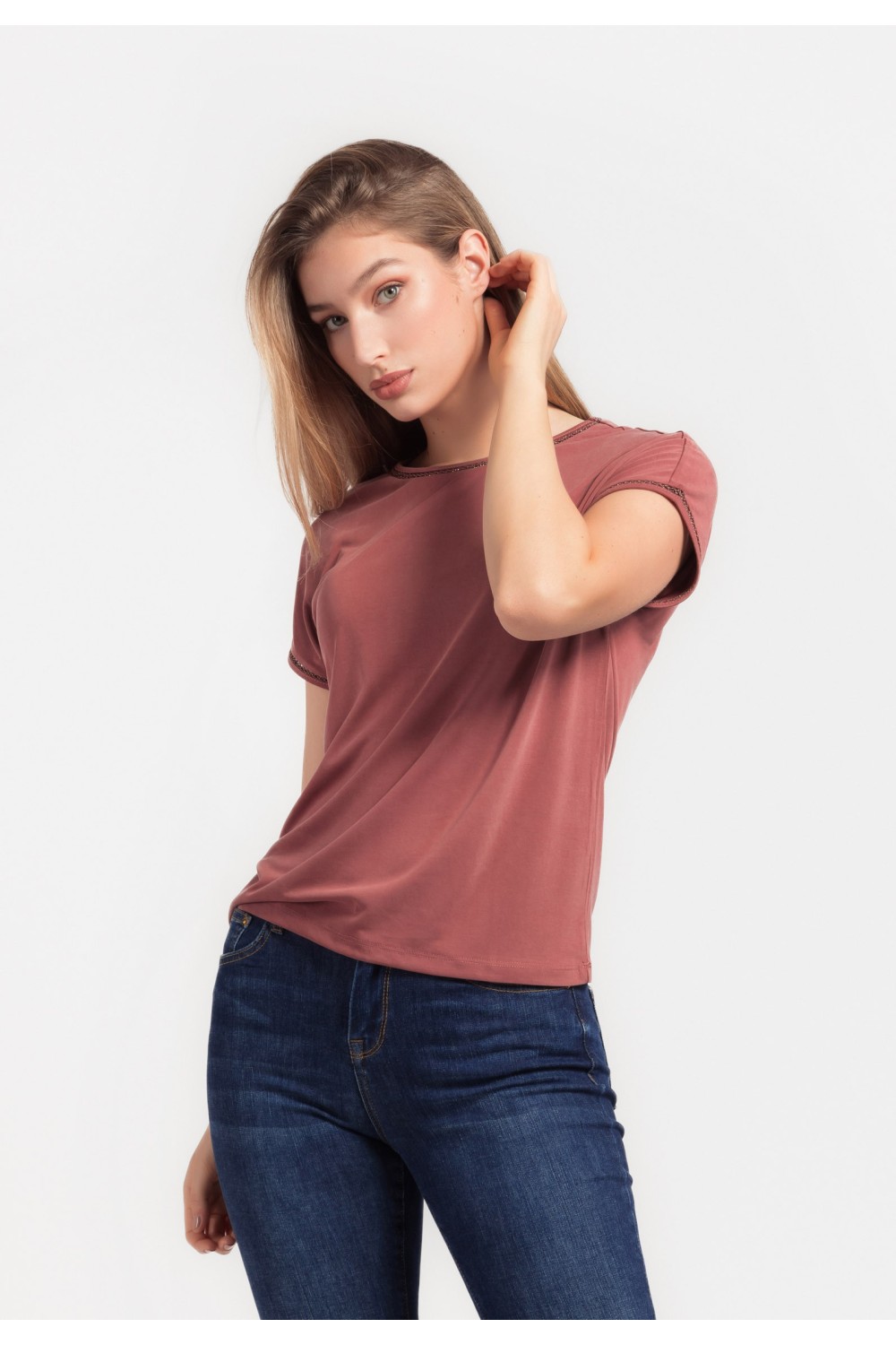 Ženska majica kratkog rukava, podavinutih na rubovima. Okruglog ovratnika većeg otvora sa detaljima srebrnih cirkona, apliciranih uz rub.-100% PAMUKModel je visok 175 cm i nosi veličinu S/V3..