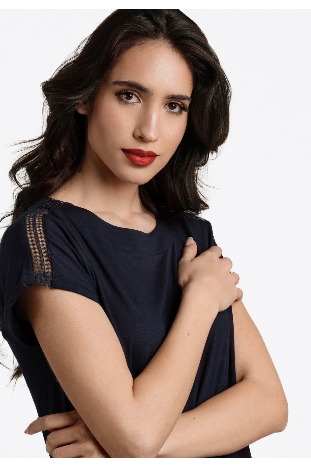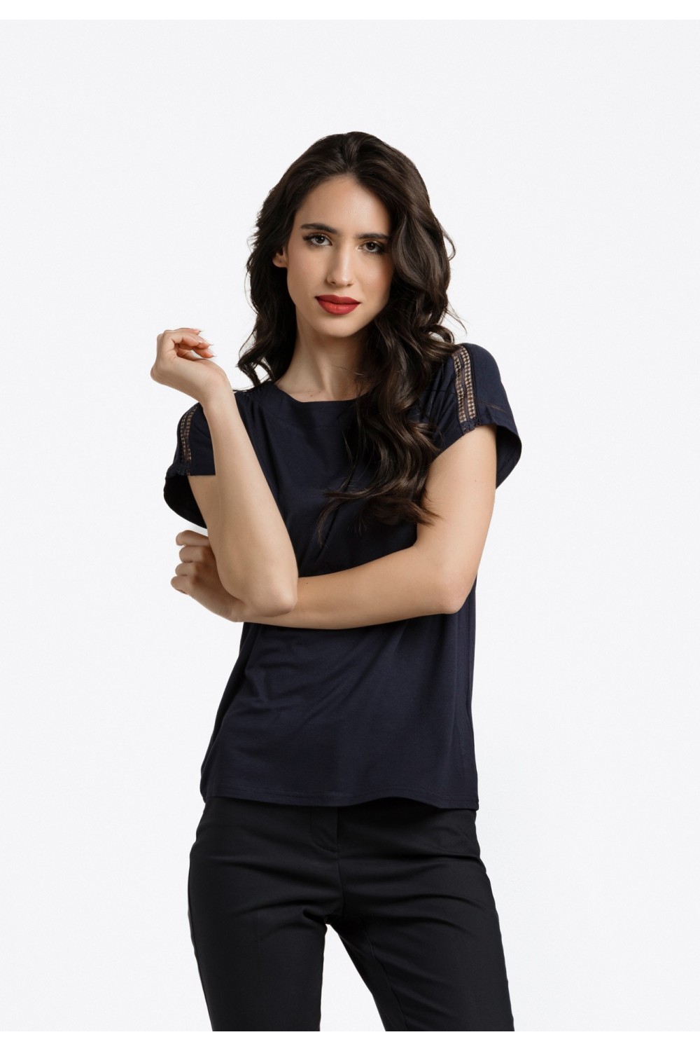 Ženska majica kratkog rukava. Okruglog ovratnika sa čipkanim detaljem uz rub. -50% PAMUK, 50% MODALNO VLAKNOModel je visok 175 cm i nosi veličinu S/V36..
