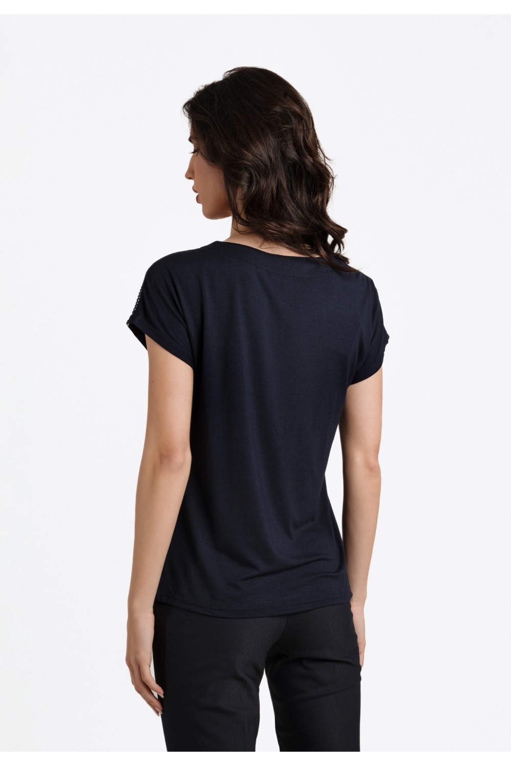 Ženska majica kratkog rukava, podavinutih na rubovima. Okruglog ovratnika većeg otvora sa detaljima srebrnih cirkona, apliciranih uz rub.-100% PAMUKModel je visok 175 cm i nosi veličinu S/V3..