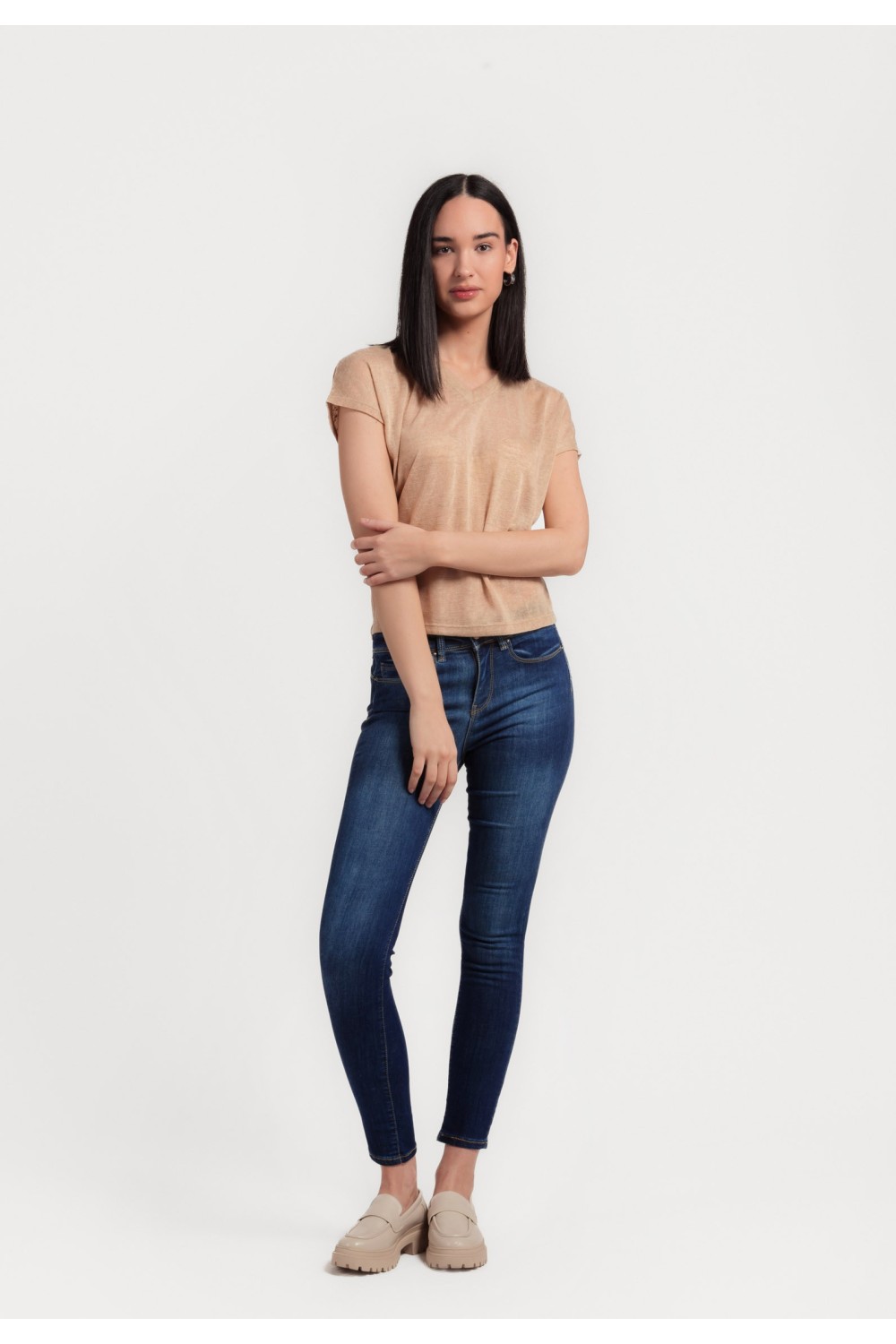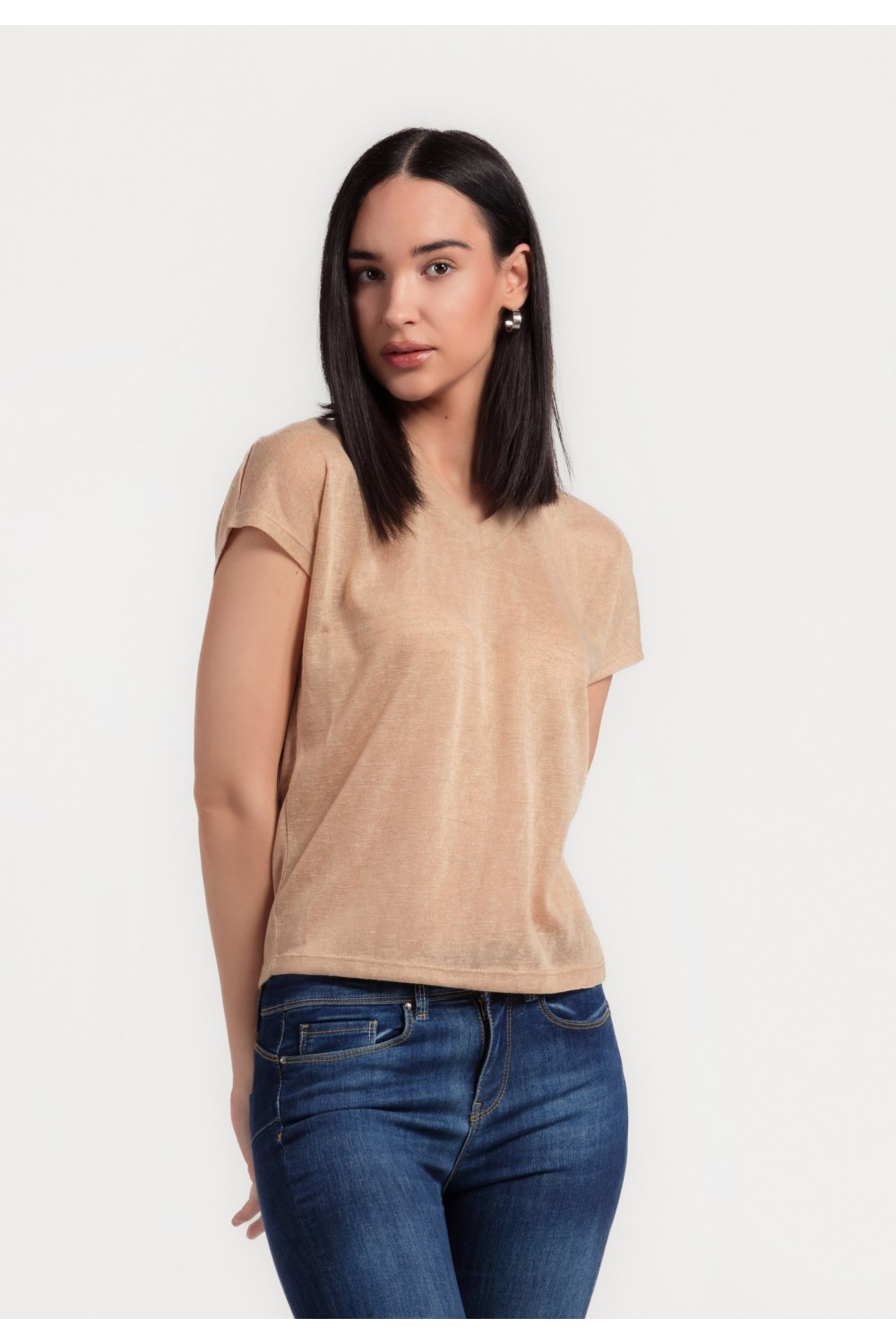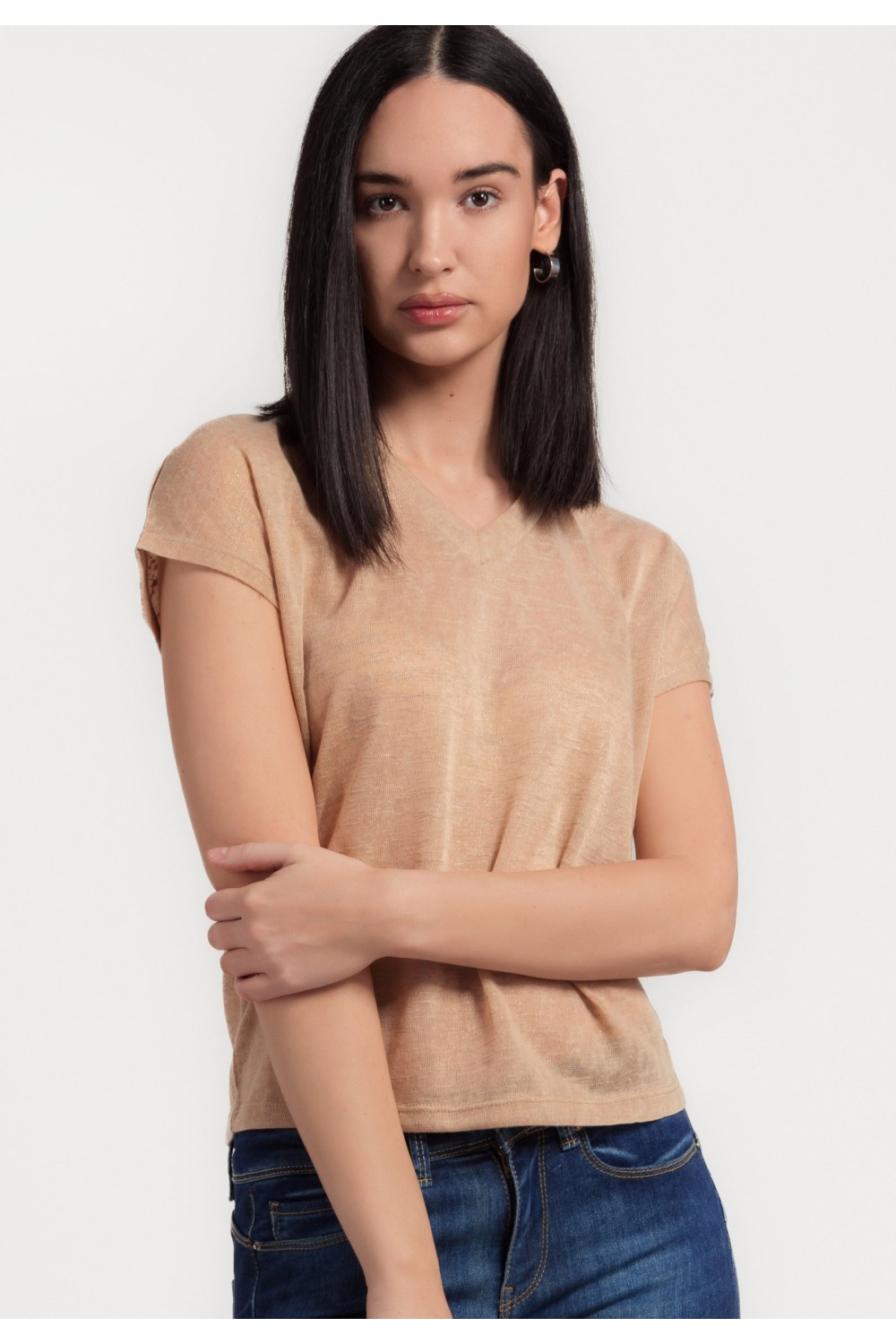 Ženska majica kraćih rukava sa svjetlucavim nitnama na rubu ovratnika i rukavima. -70% MODALNO VLAKNO, 30% POLIESTERModel je visok 175 cm i nosi veličinu S/V36..