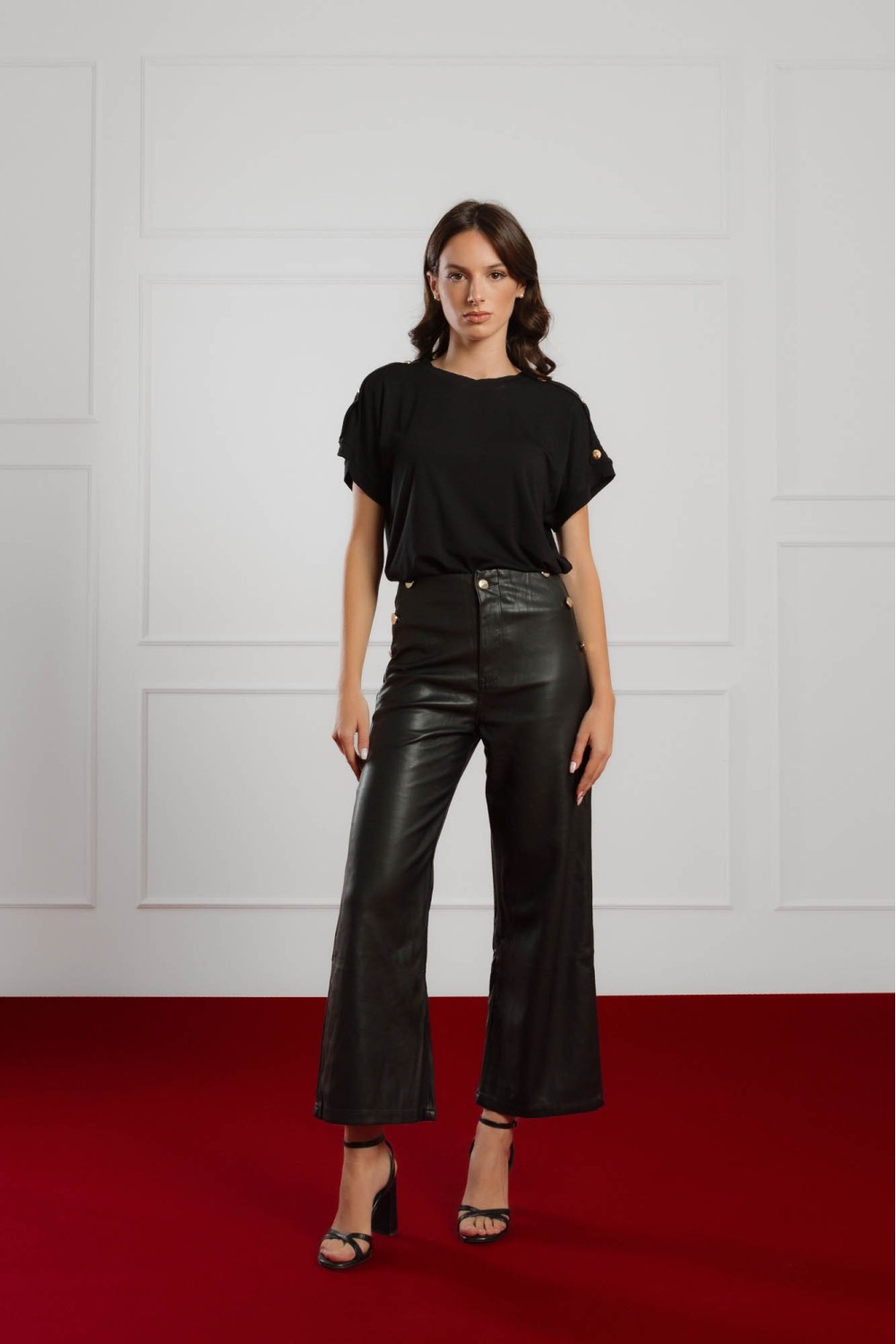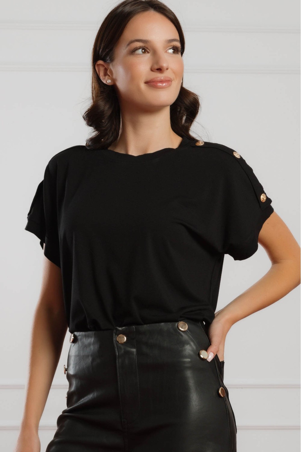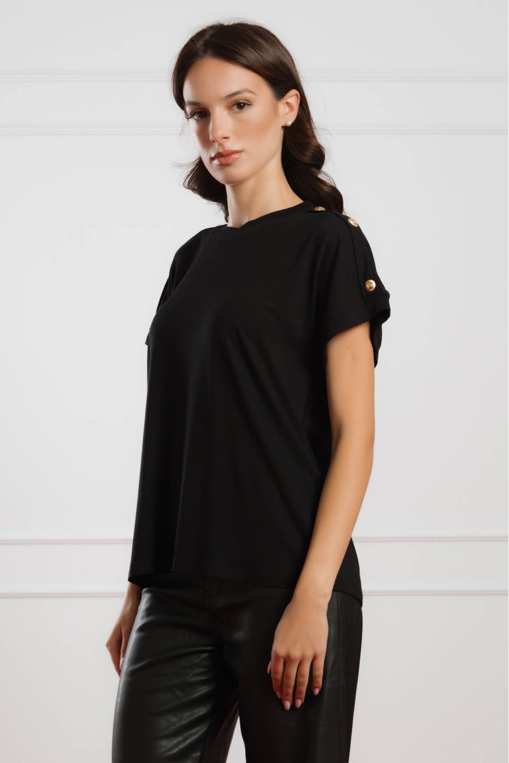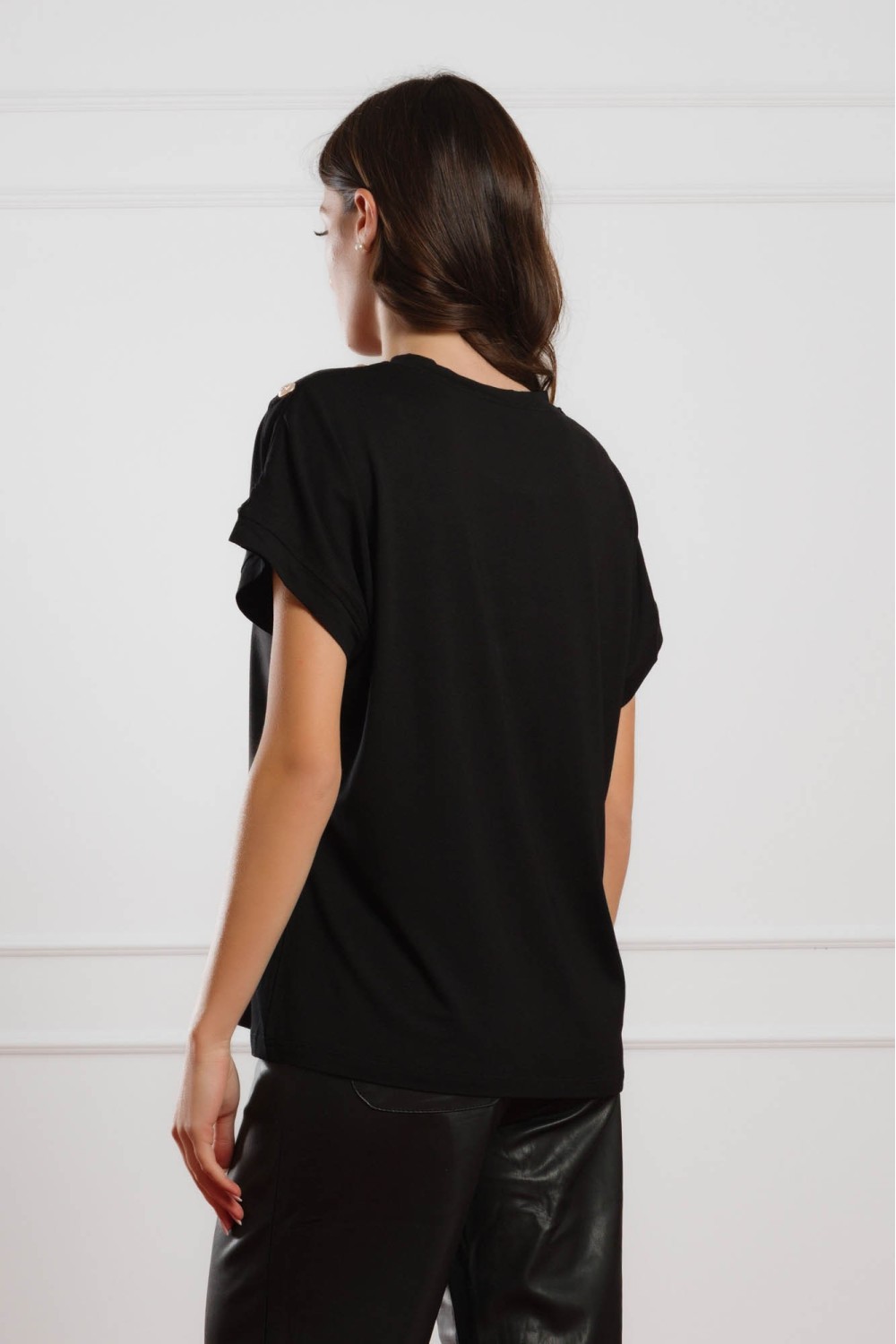 Klasična crna majica s kratkim rukavima podignuta je diskretnim, ali elegantnim detaljima – sitnim ukrasnim kamenčićima koji daju profinjen sjaj svakom outfitu. Mekana viskozna tkanina osigu..