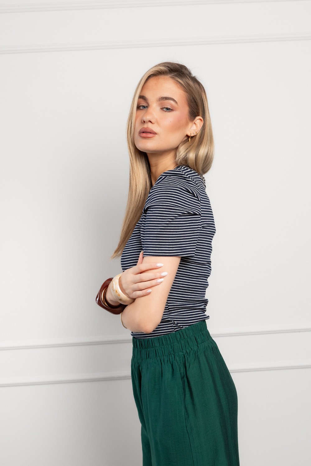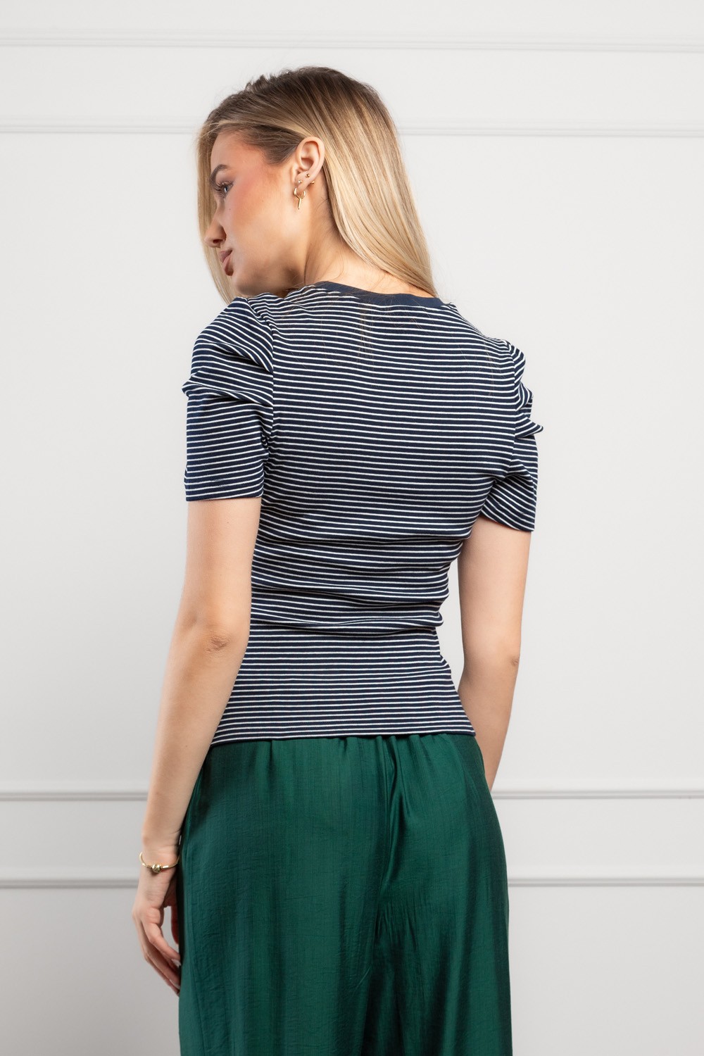 Ženska majica kratkih rukava s prugastim uzorkom idealan je spoj udobnosti i bezvremenskog stila. Kombinacija tamnoplave i bijele boje daje klasičan mornarski izgled koji nikada ne izlazi iz mode. Izrađena je od mekanog pamuka s dodatkom elastina, što osigurava ugodno pristajanje i slobodu pokreta tijekom cijelog dana.
