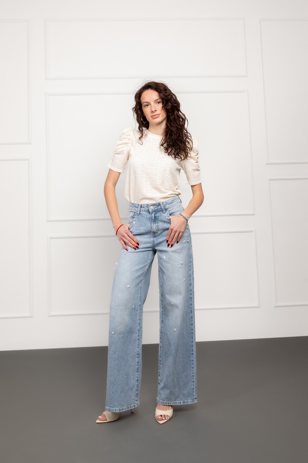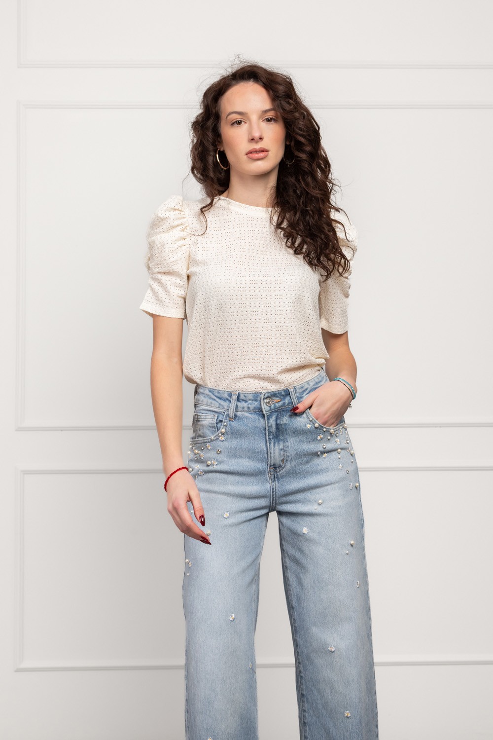 Ženska majica kratkih rukava u bijeloj boji ukrašena ručno-inspiriranim heklanim cvjetovima i suptilnim kamenčićima koji dodaju blagi sjaj. Cvjetni motiv pruža nježan i romantičan dojam, dok..