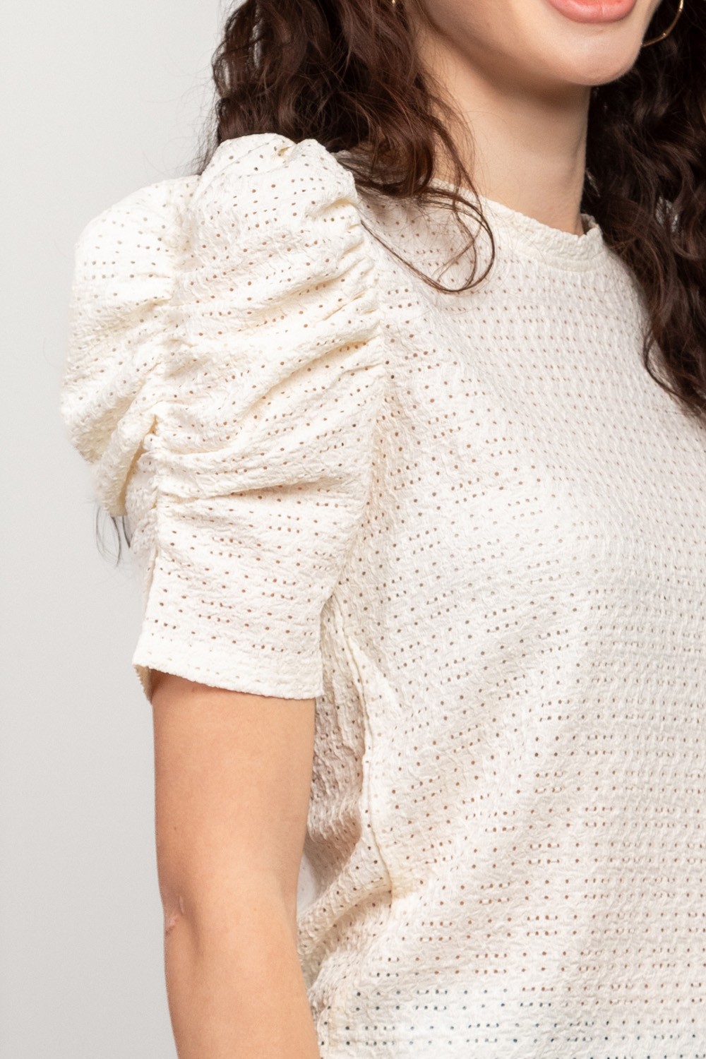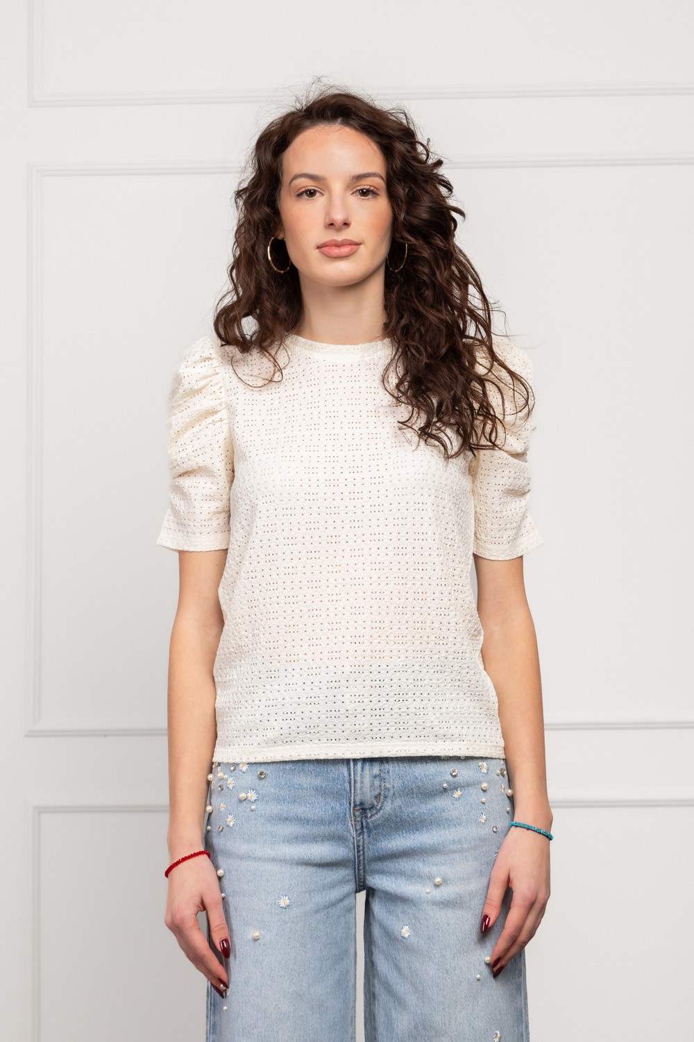 Ženska majica kratkih rukava u bijeloj boji s čipkastim rukavima i dekorativnim heklanim džepom koji daje romantičan, handmade efekt i pretvara jednostavan komad u nešto s karakterom. Mekana..
