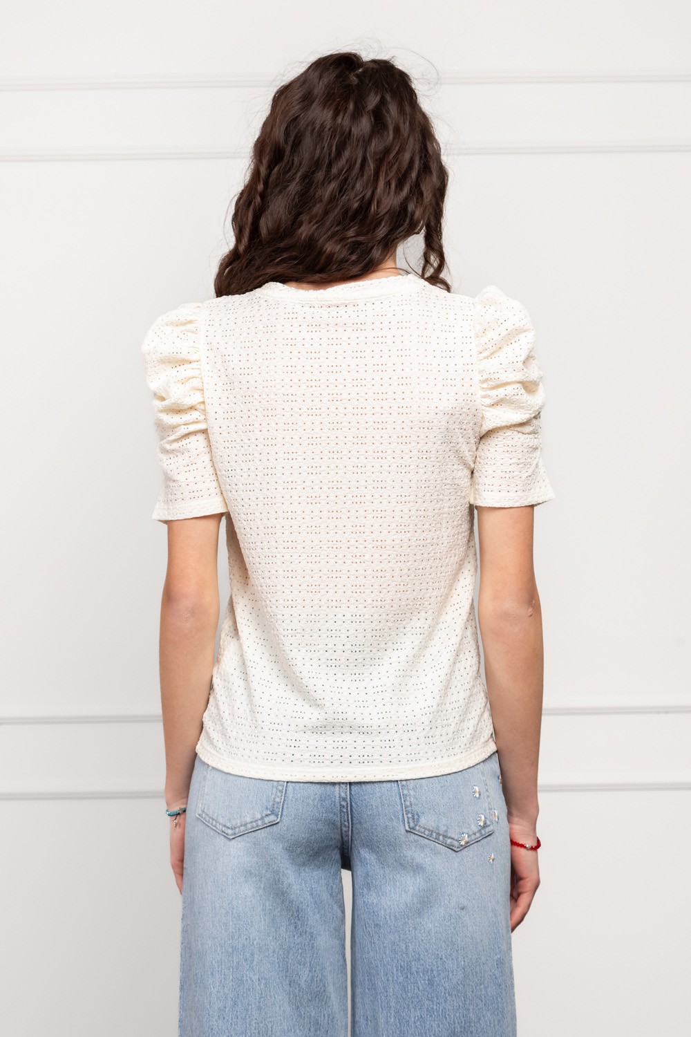 Majica u prljavo bijeloj boji s dekorativnim printom i sjajnim detaljima koji daju efektan i moderan izgled. Mekani materijal i klasičan kroj čine je ugodnim izborom za svakodnevne kombinaci..