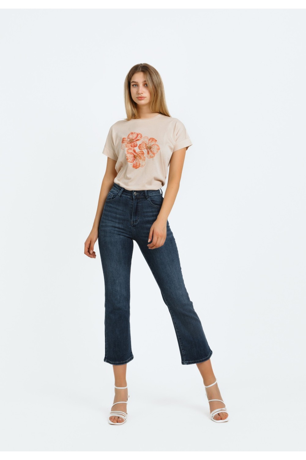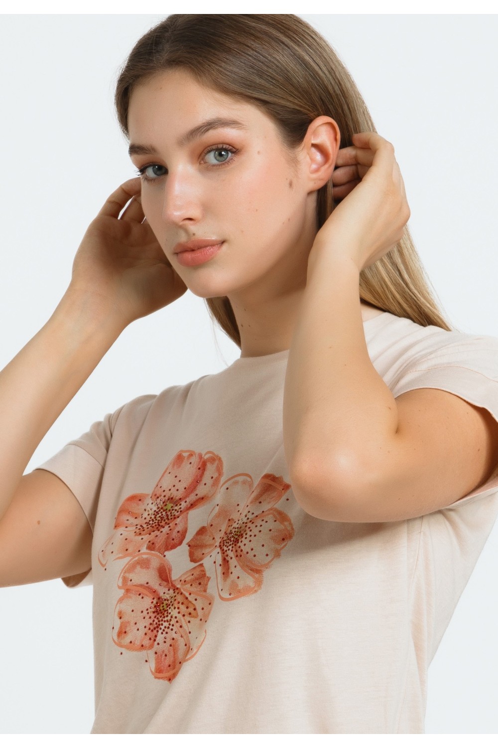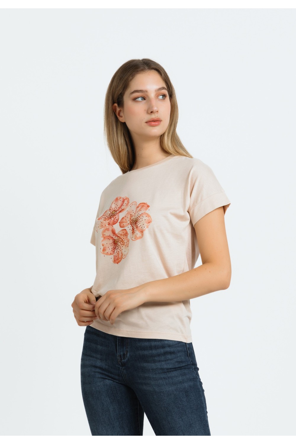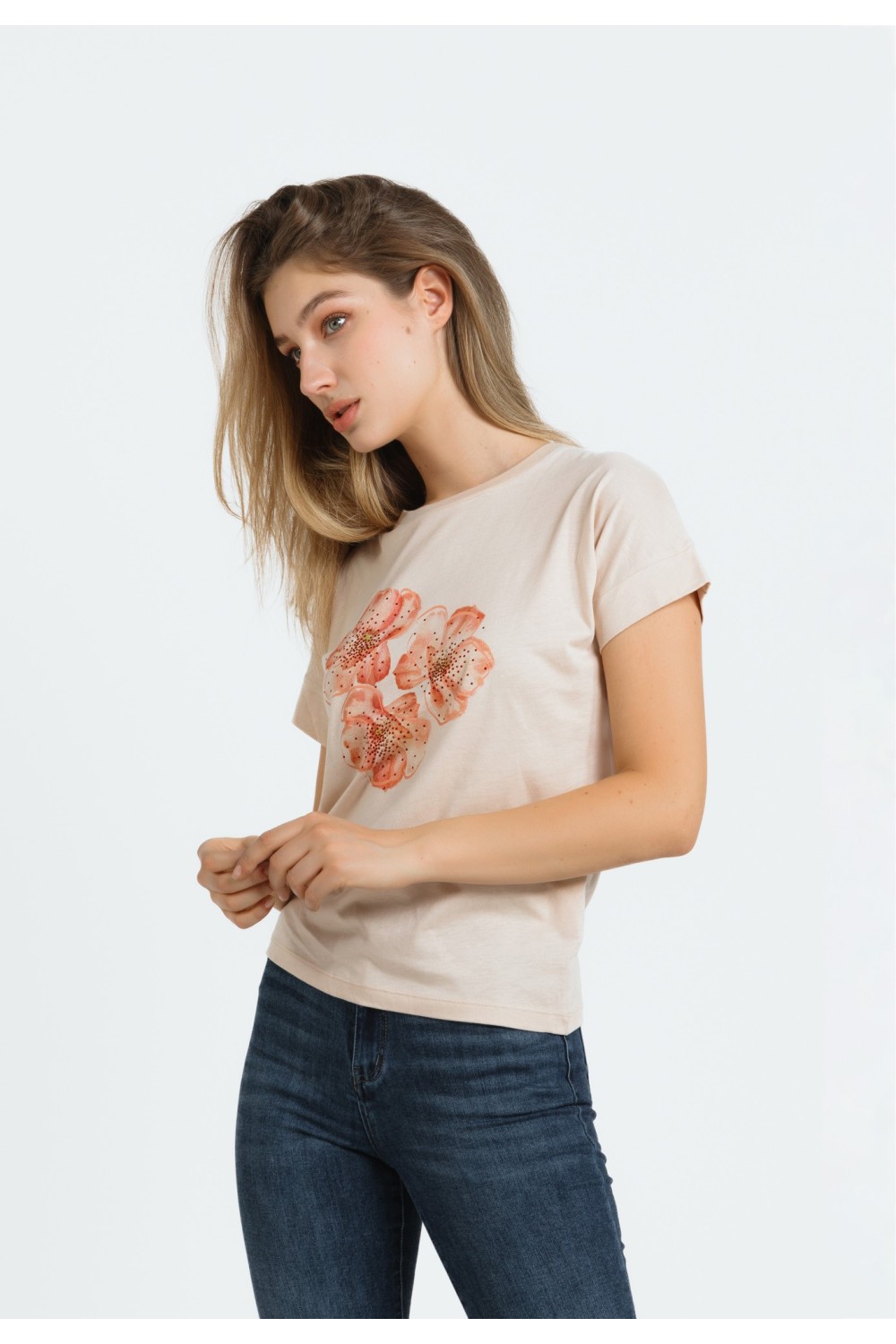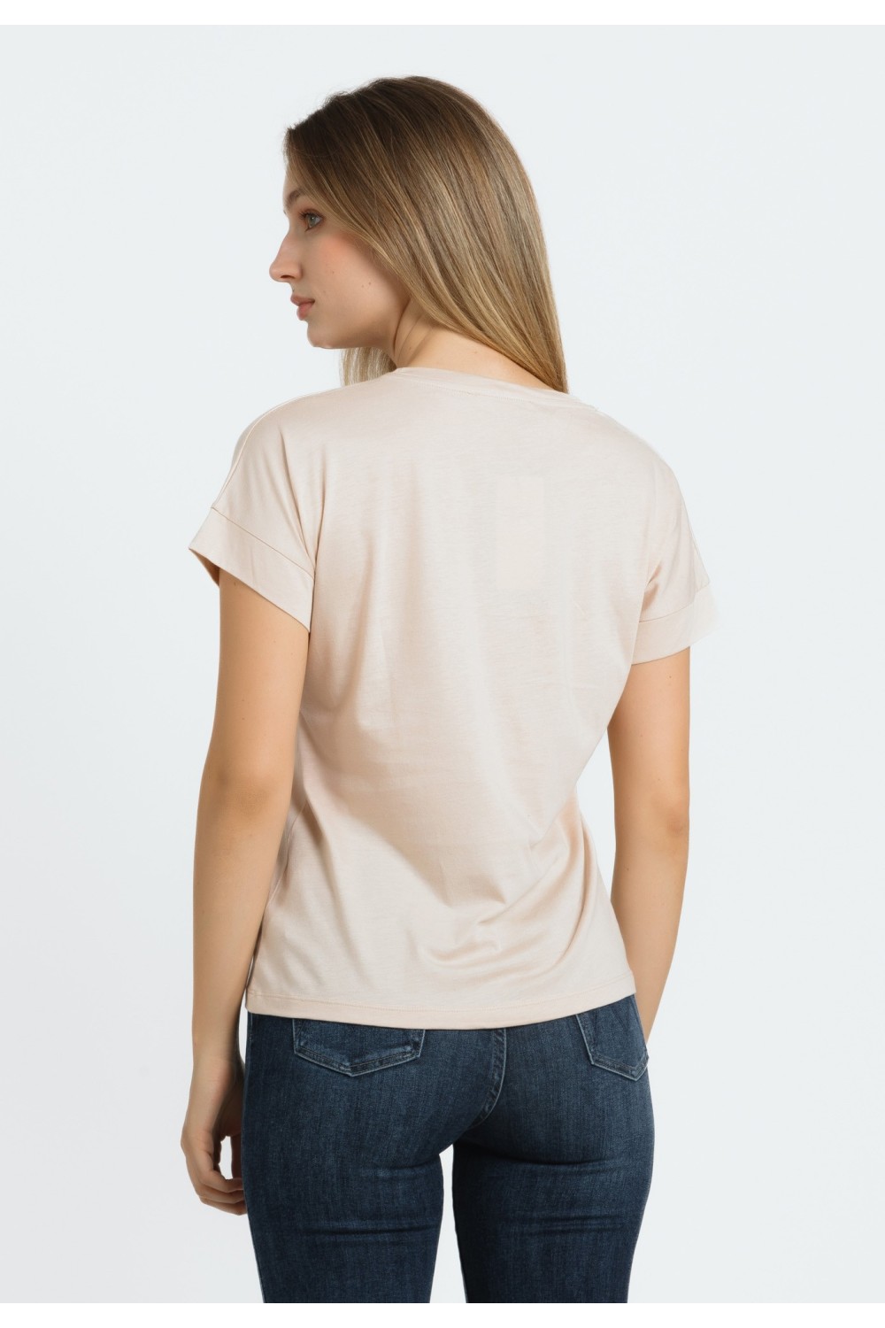 Ženska majica kratkog rukava, podavinutih na rubovima. Okruglog ovratnika većeg otvora sa detaljima srebrnih cirkona, apliciranih uz rub.-100% PAMUKModel je visok 175 cm i nosi veličinu S/V3..