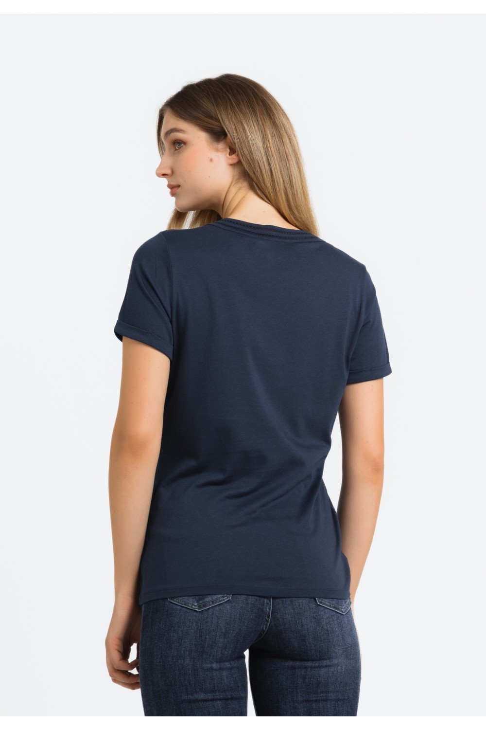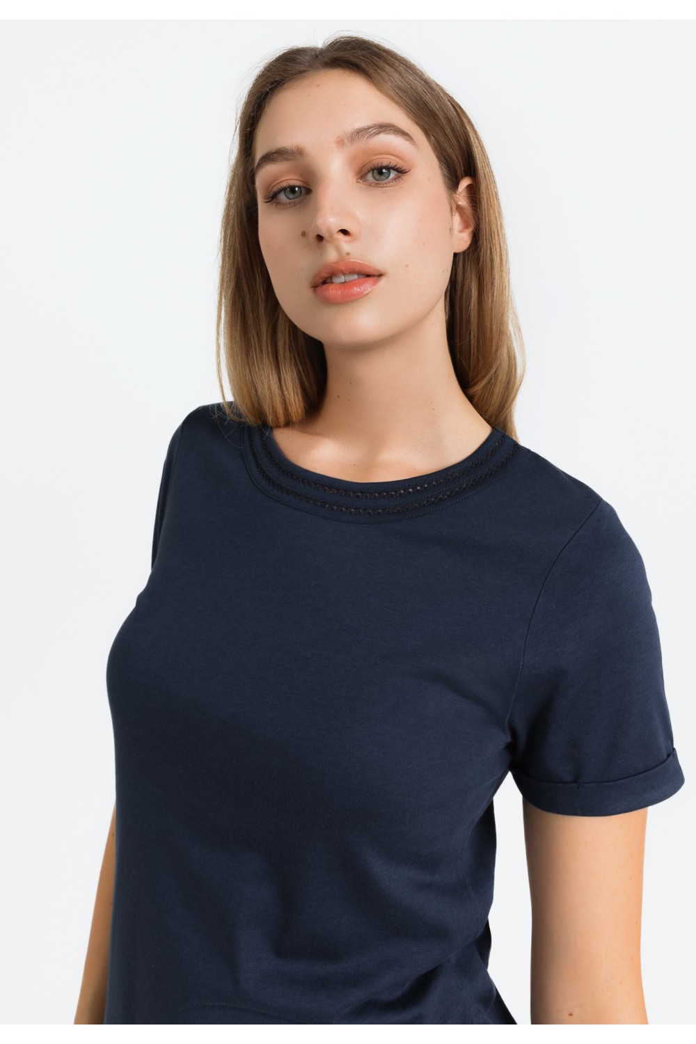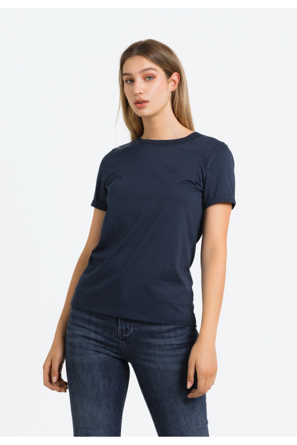Ženska majica kratkog rukava, podavinutih na rubovima. Okruglog ovratnika većeg otvora sa detaljima srebrnih cirkona, apliciranih uz rub.-100% PAMUKModel je visok 175 cm i nosi veličinu S/V3..