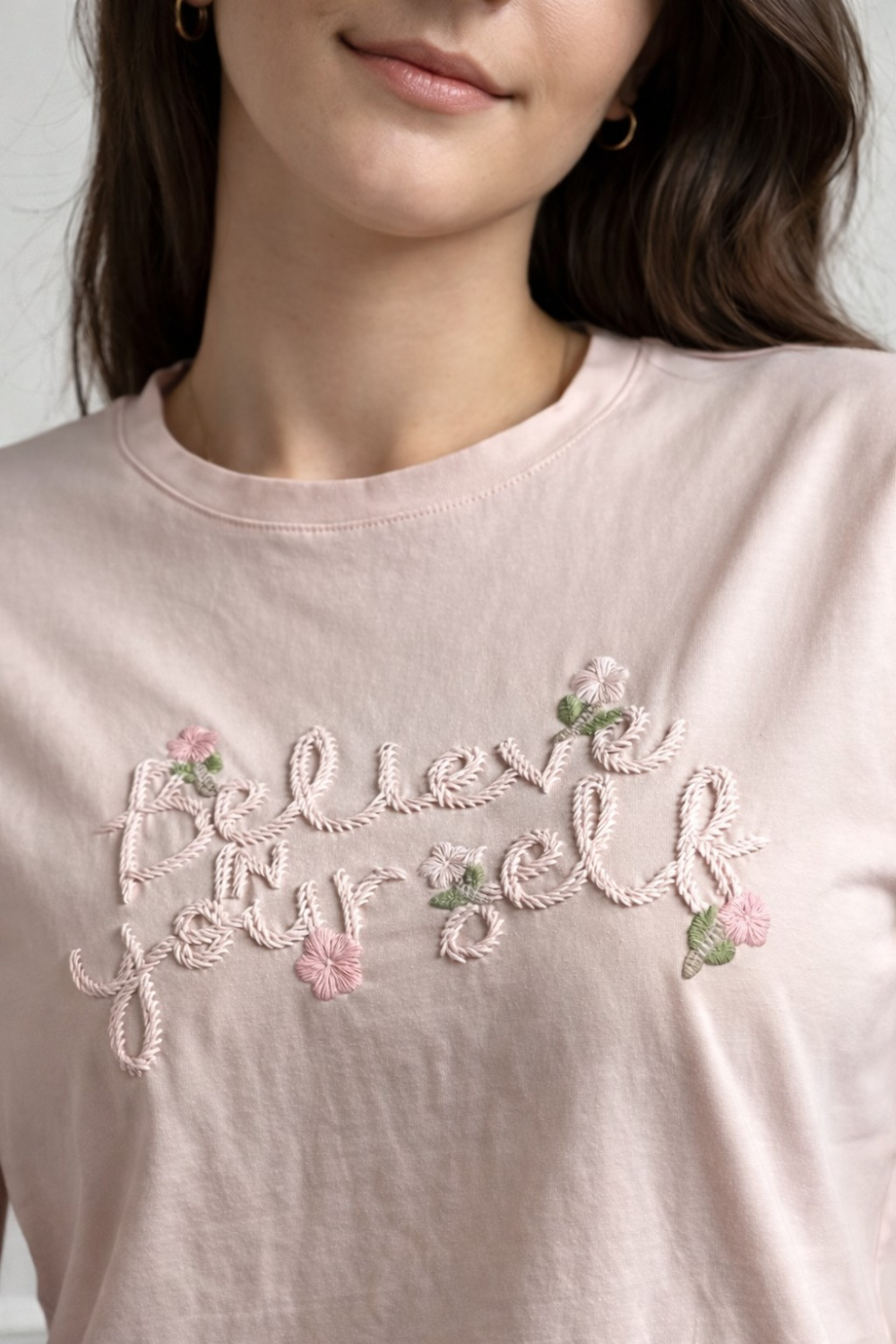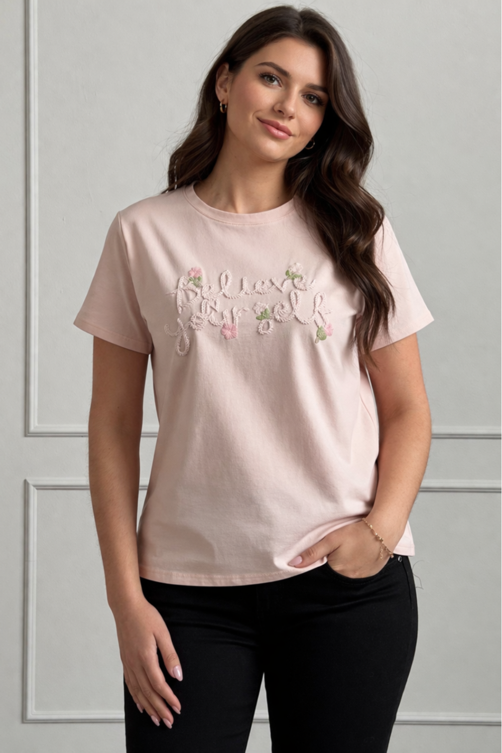 Ženska majica kratkih rukava u bijeloj boji ukrašena ručno-inspiriranim heklanim cvjetovima i suptilnim kamenčićima koji dodaju blagi sjaj. Cvjetni motiv pruža nježan i romantičan dojam, dok..